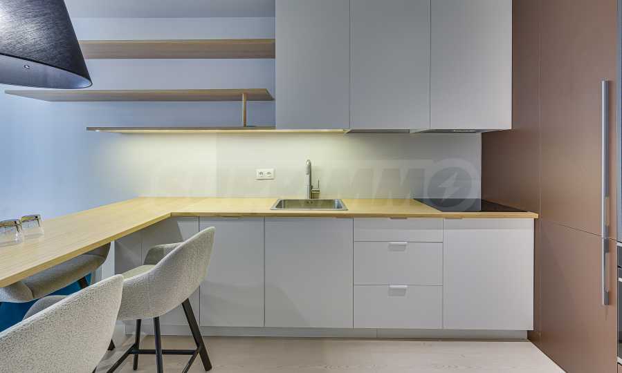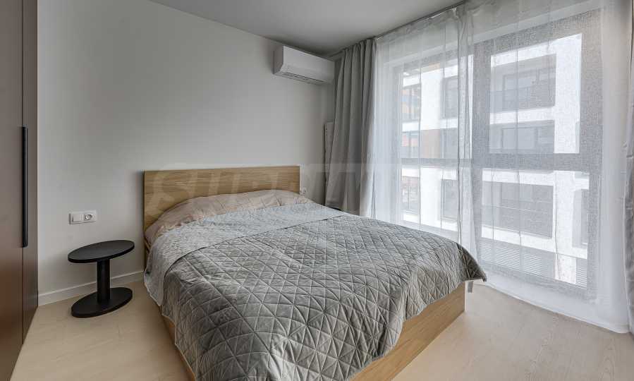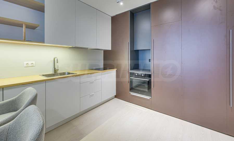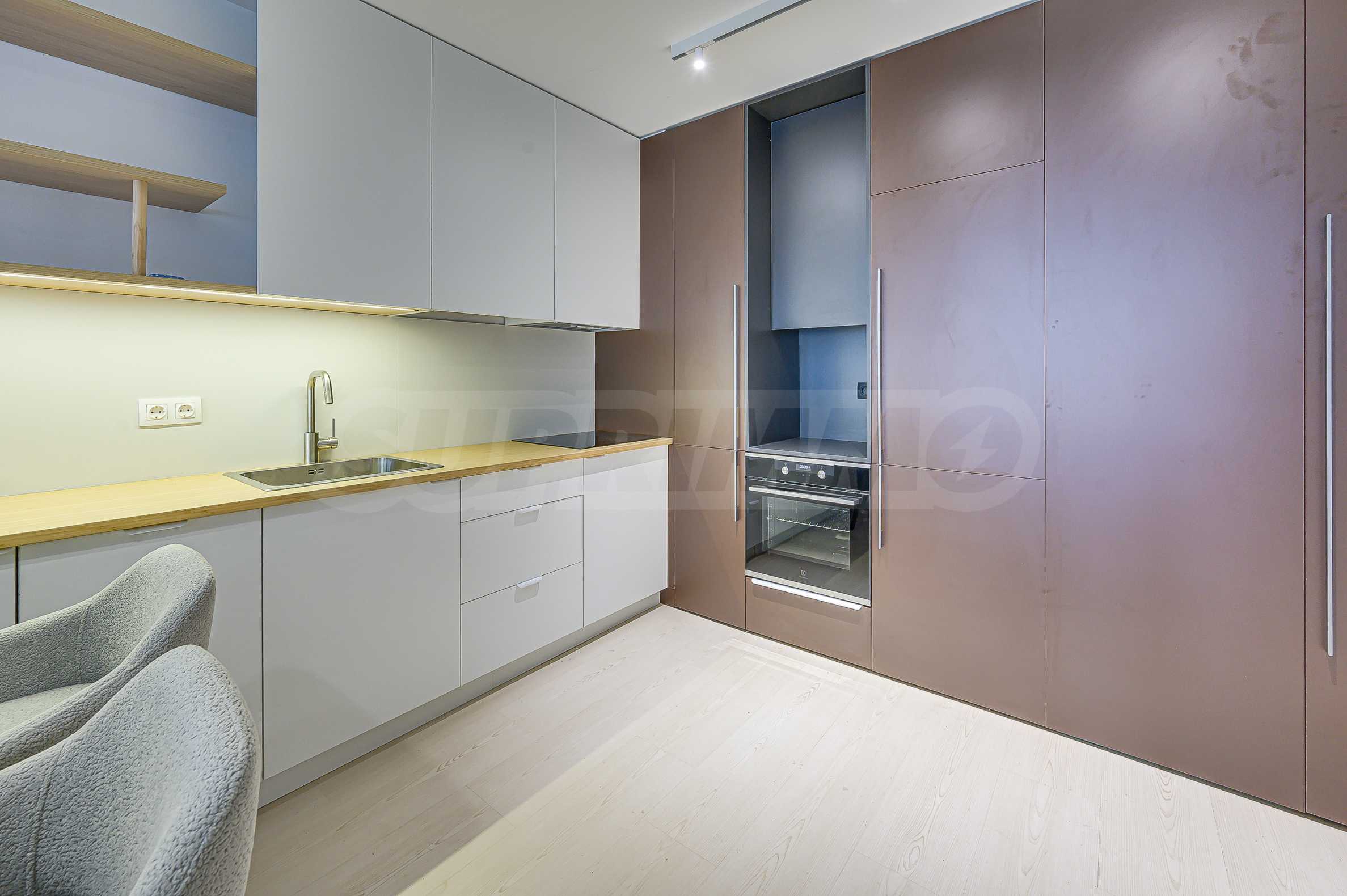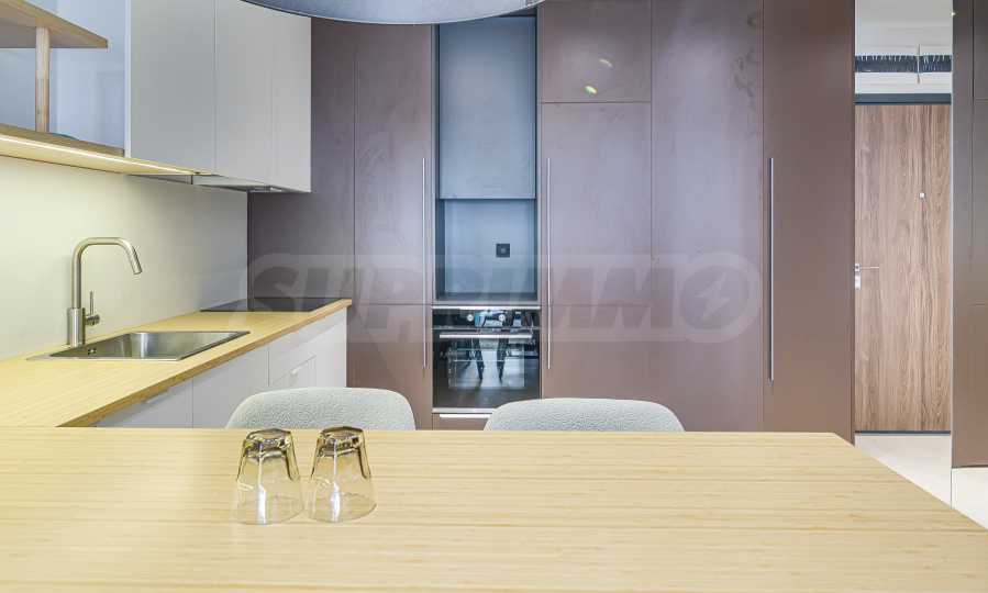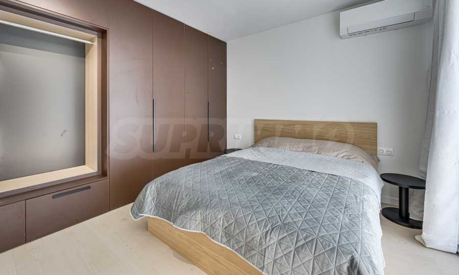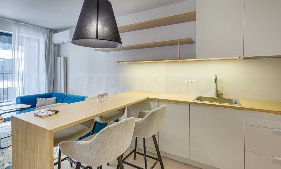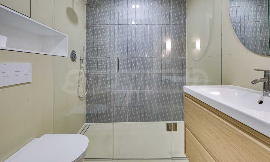 Апартаментът е реализиран по индивидуален проект – всичко е ново, подбрано с внимание към детайла и усещане за елегантен минимализъм. Пространствата са балансирани и функционални.