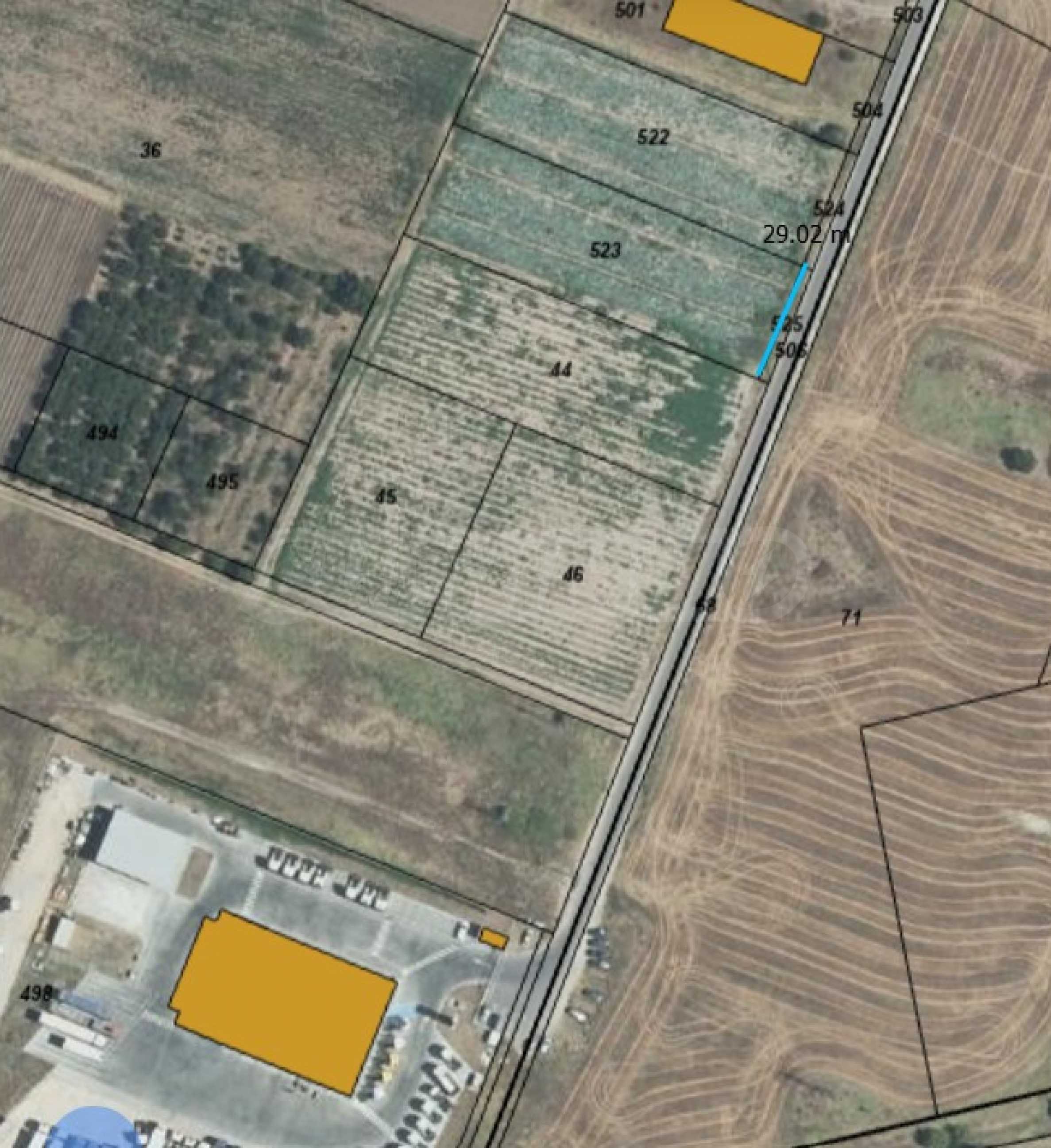 Парцелът с обща площ 2700 кв.м /2627 кв.м + 72 кв.м от лицето, определени за тротоар/ има 29 м лице на асфалтов път и е обезпечен с трафопост със становище от ЕВН и водопровод на границата си.