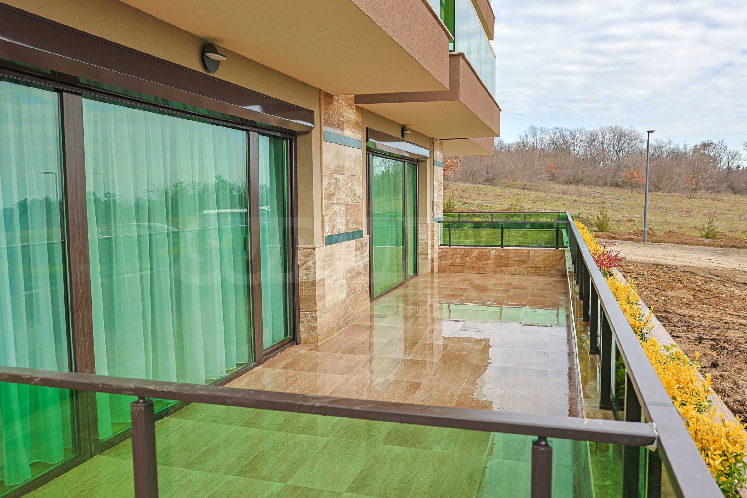 Имотът е с обща площ от 92,46 кв.м, ситуиран на партерен етаж с голяма веранда и панорамна гледка към морето.