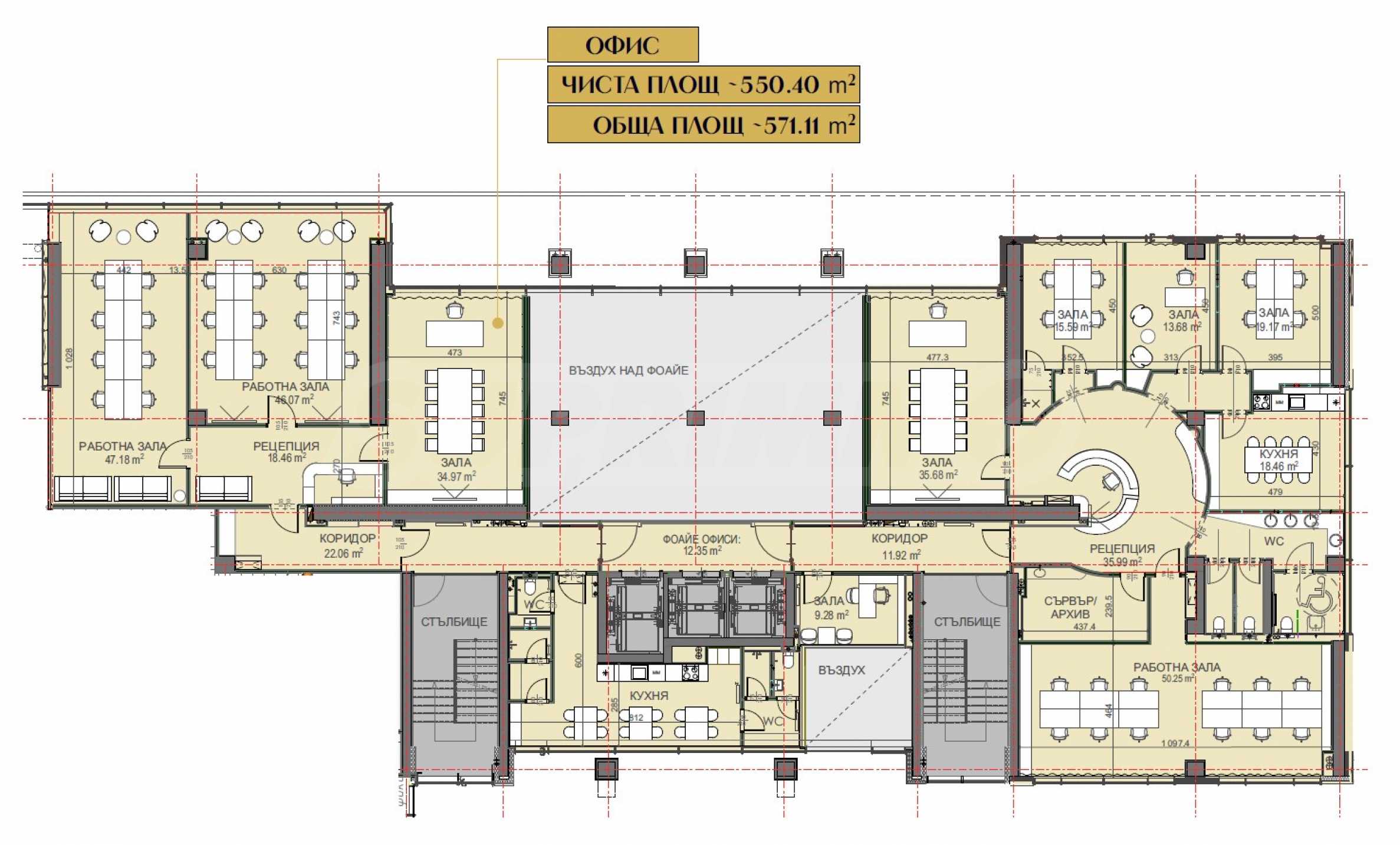 • обща площ с общи части 571 кв.м, от които чиста площ: 538 кв.м;