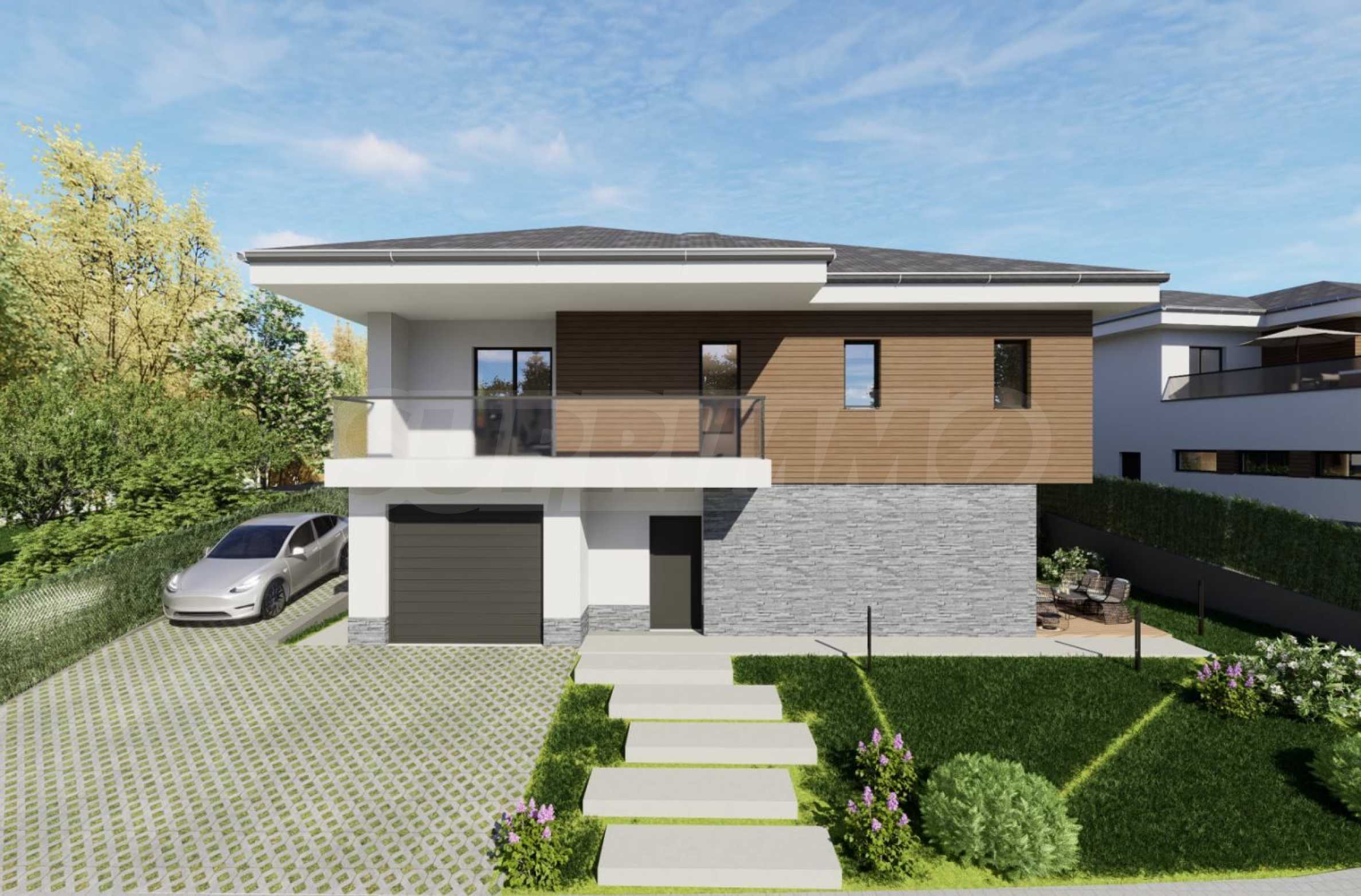 Всеки дом е развит на три нива, включва английски двор, собствен гараж и просторна дневна зона, ориентирана към южната градина. Архитектурата следва съвременна естетика с ясни линии и премерен обем, а фасадите съчетават естествен камък, дърво и минималистична бяла мазилка.