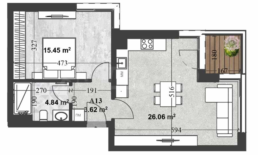 Разположен на трети етаж, апартаментът предлага отличен баланс между светлина, уединение и усещане за простор. Функционалното разпределение и правилните форми на помещенията създават възможност за стилно и практично интериорно решение.