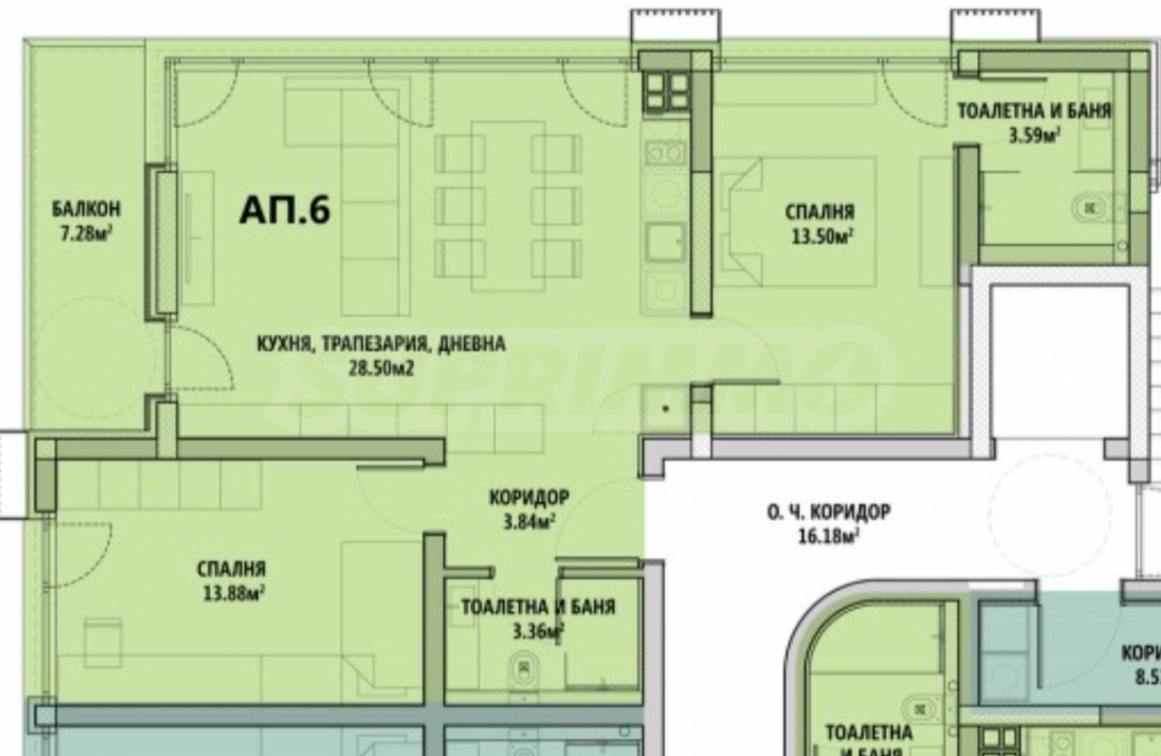 Апартаментът е с площ от 108 кв.м и е със следното разпределение: хол с кухненска част, спалня, втора спалня, баня с тоалетна и тераса.