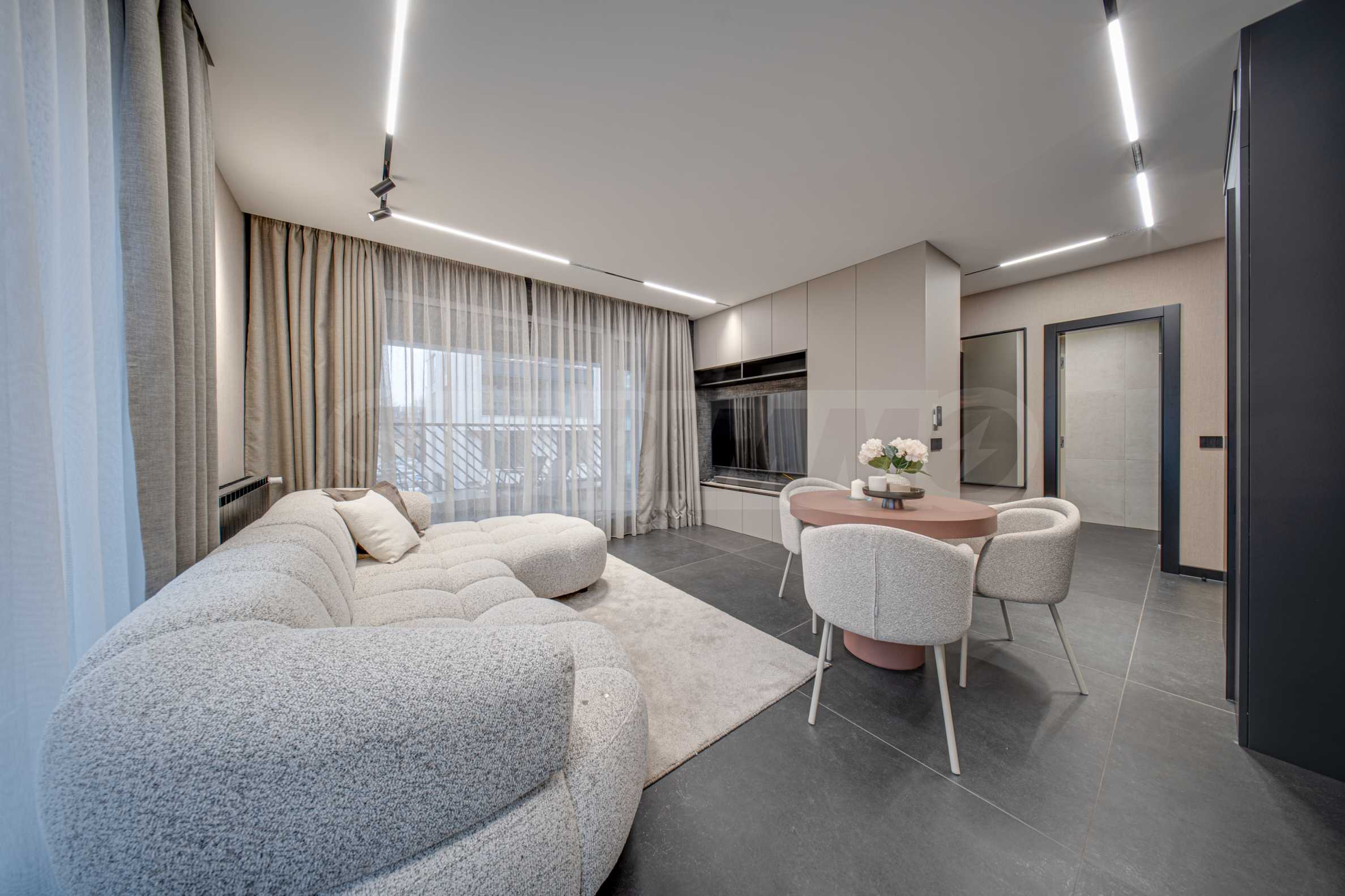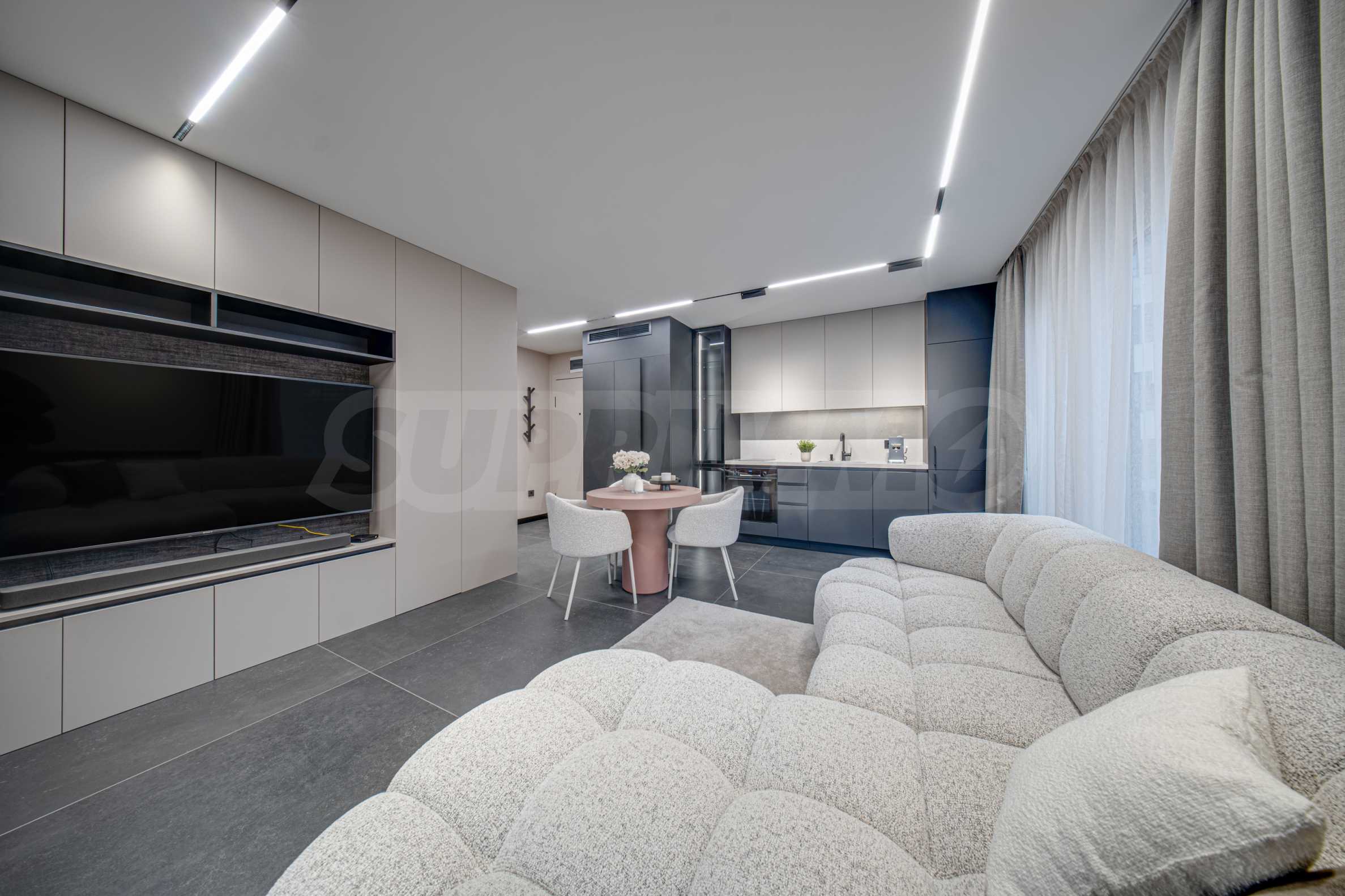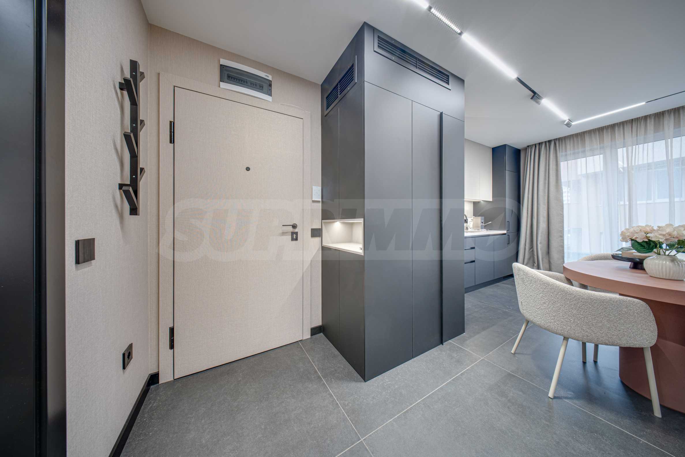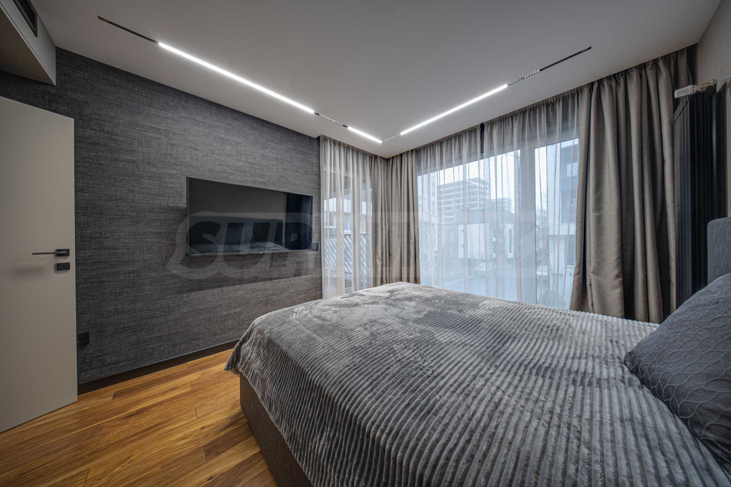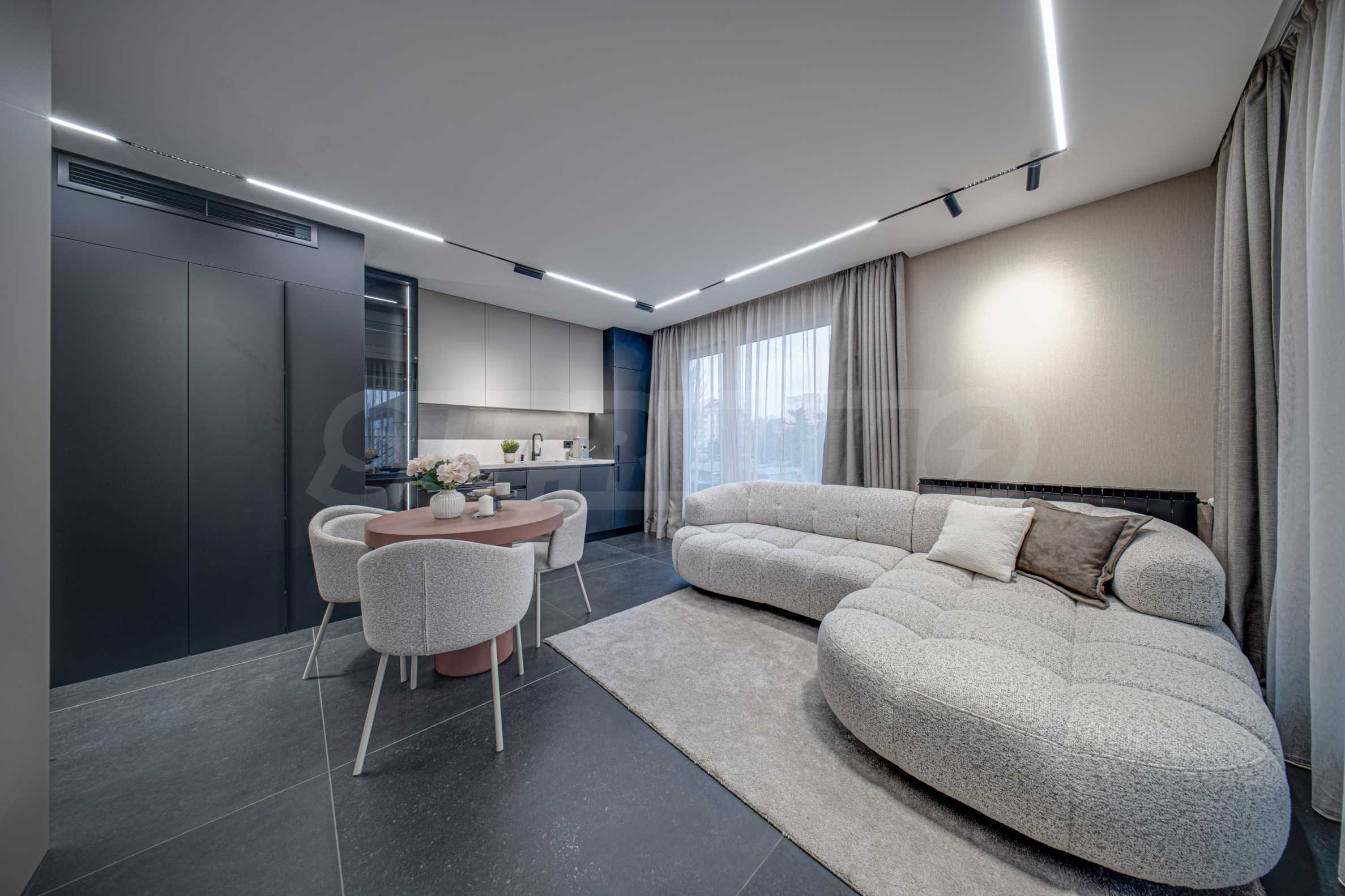 Апартаментът се предлага завършен с висок клас довършителни работи и заема втори етаж от общо четири етажа.
