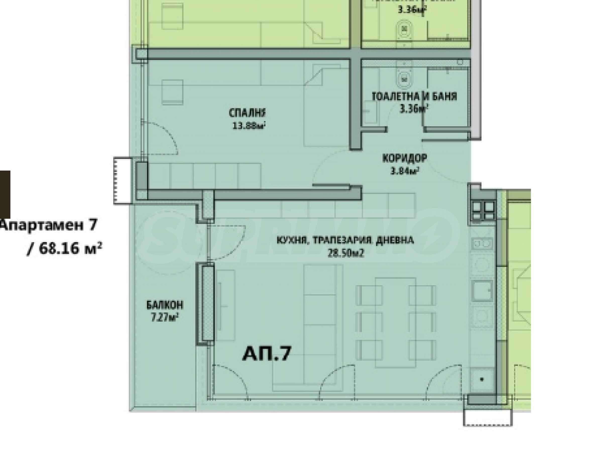 Апартаментът е със застроена площ от 68.16 кв.м и е със следното разпределение: хол с кухненска част, спалня, баня с тоалетна и тераса.
