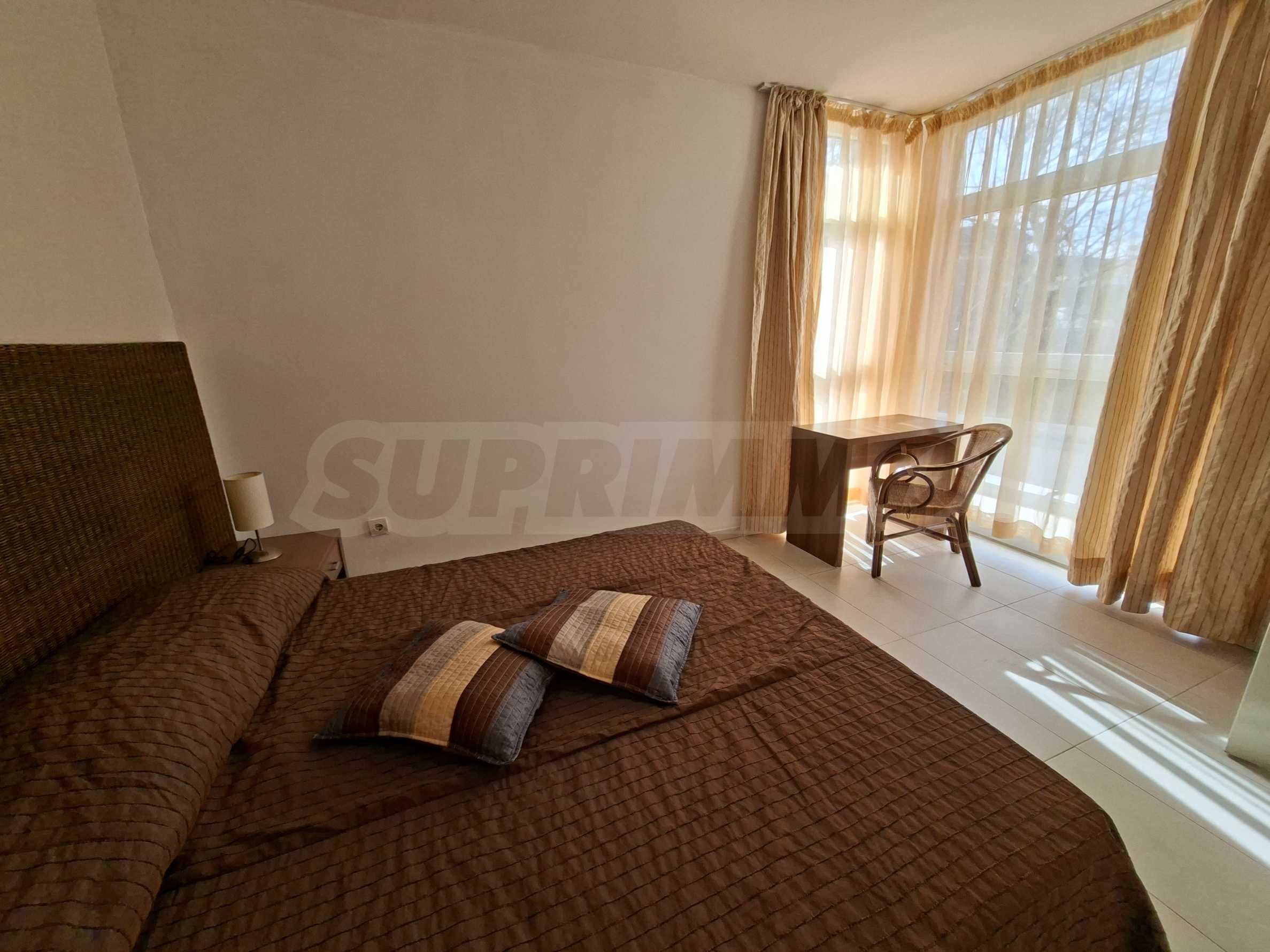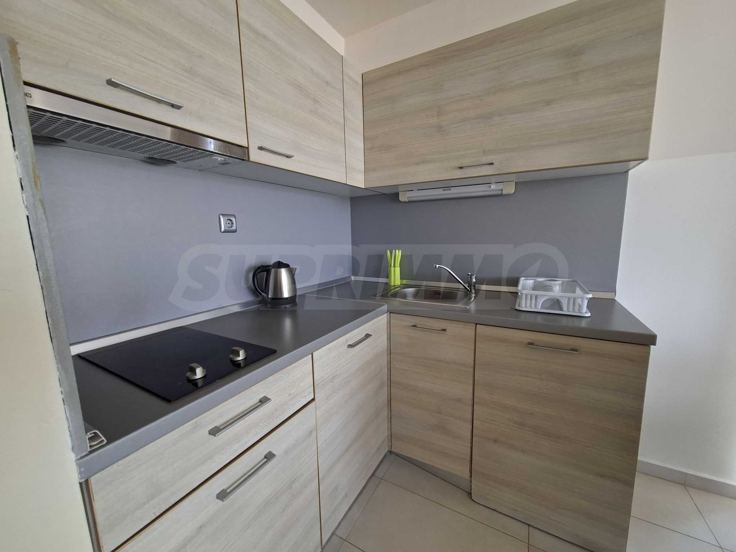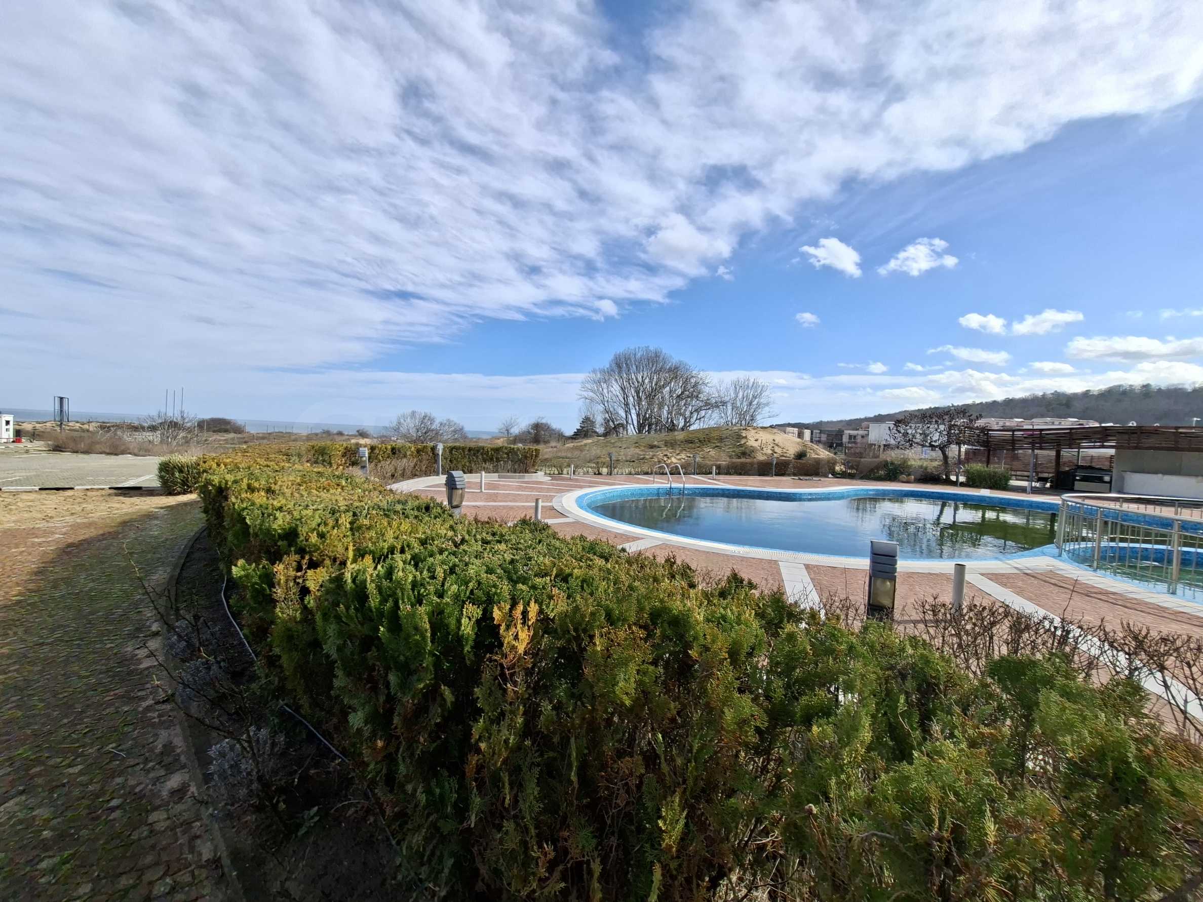Имотът е част от комплекс с удобства, тризвезден съвременен ризорт с лоби бар и ресторант, басейн, детски басейн и площадка, градина и др.
