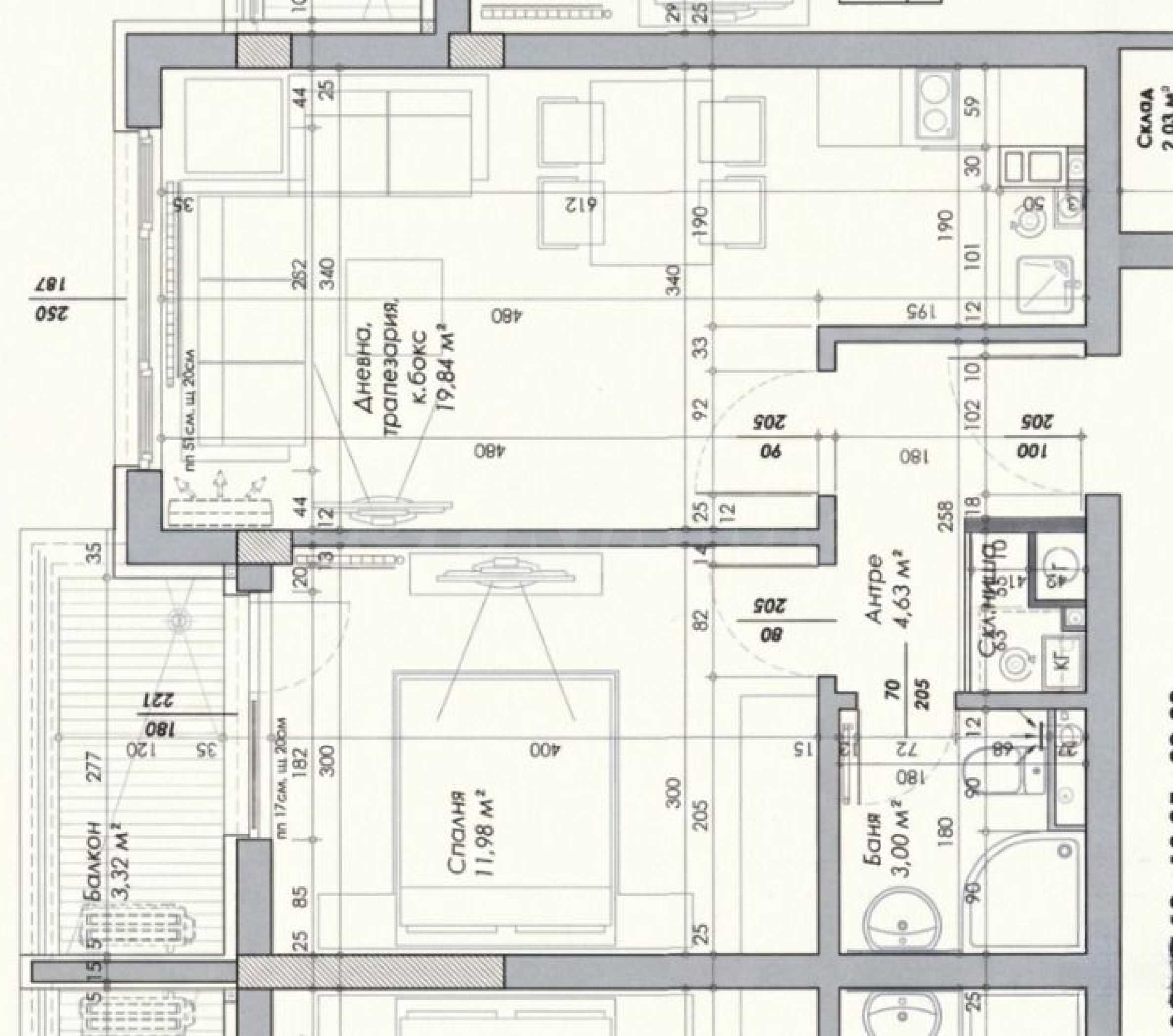 Апартаментът е на четвърти етаж от общо девет и е със следното разпределение: антре, хол с кухненска част, спалня, баня с тоалетна и тераса.