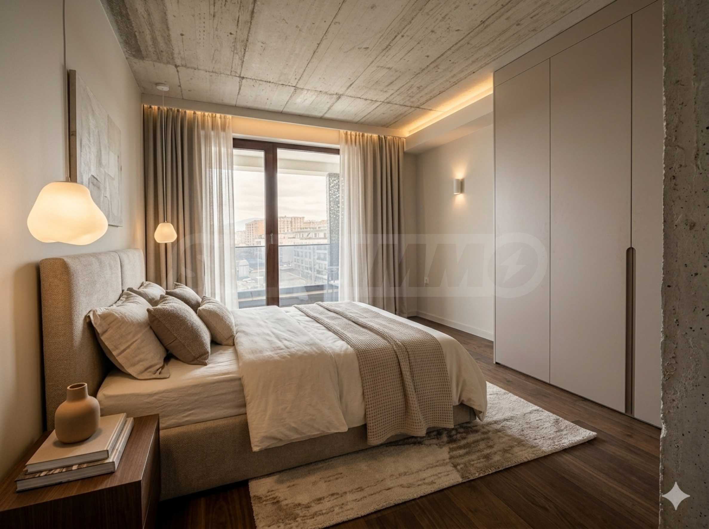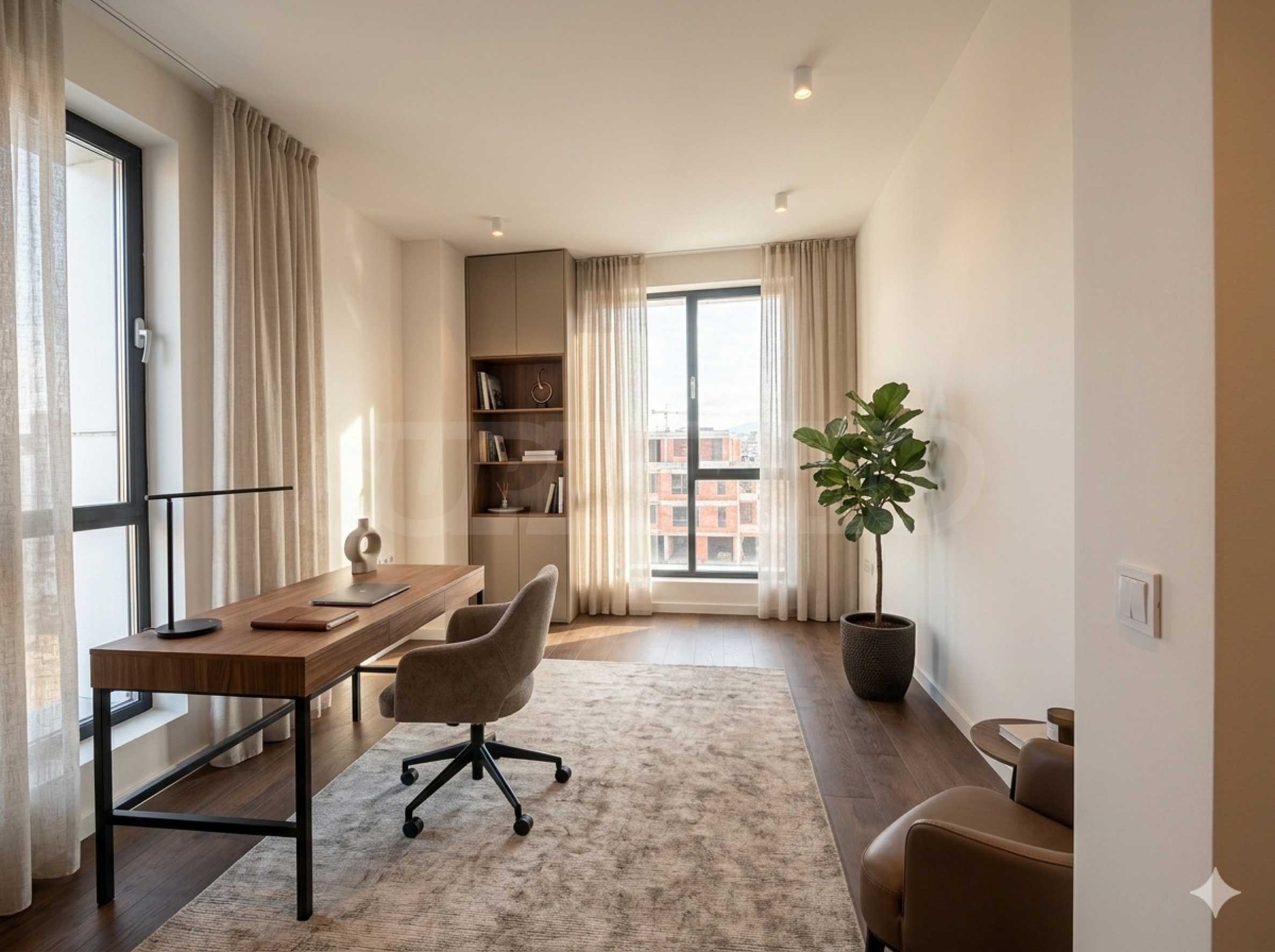 Снимките в обявата са примерни интериорни визуализации (концепция за обзавеждане) с реални параметри на помещенията. Имотът се предлага в степен на завършеност "шпакловка и замазка" (БДС).