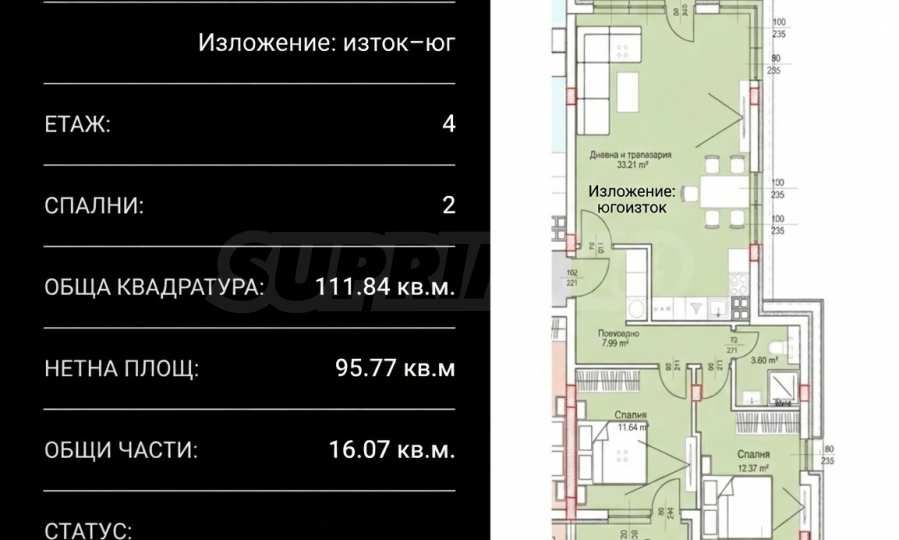 • Изложение: изток/североизток за дневната, юг за спалните;