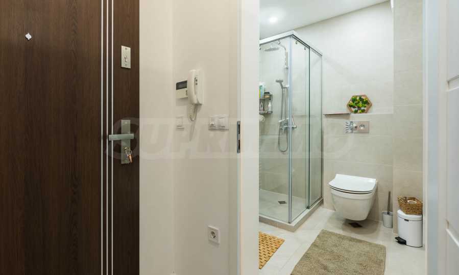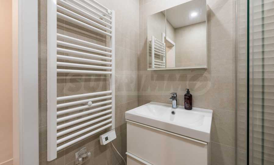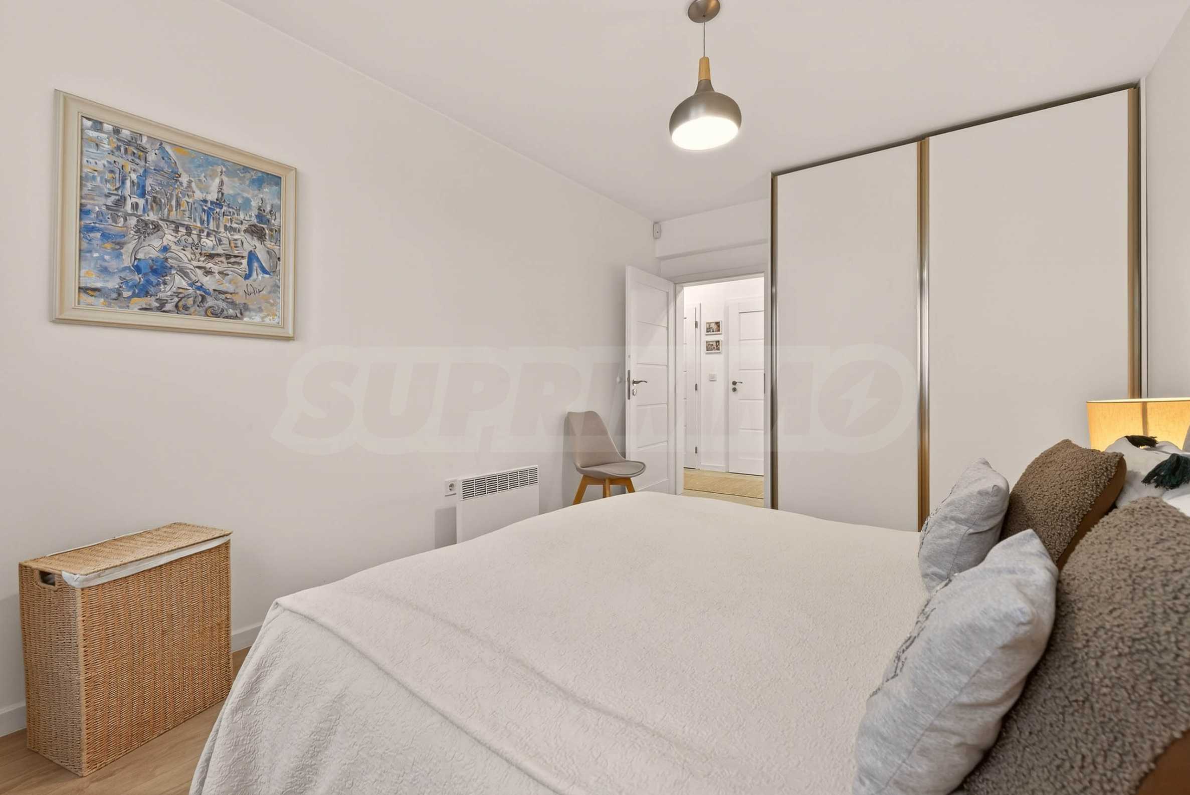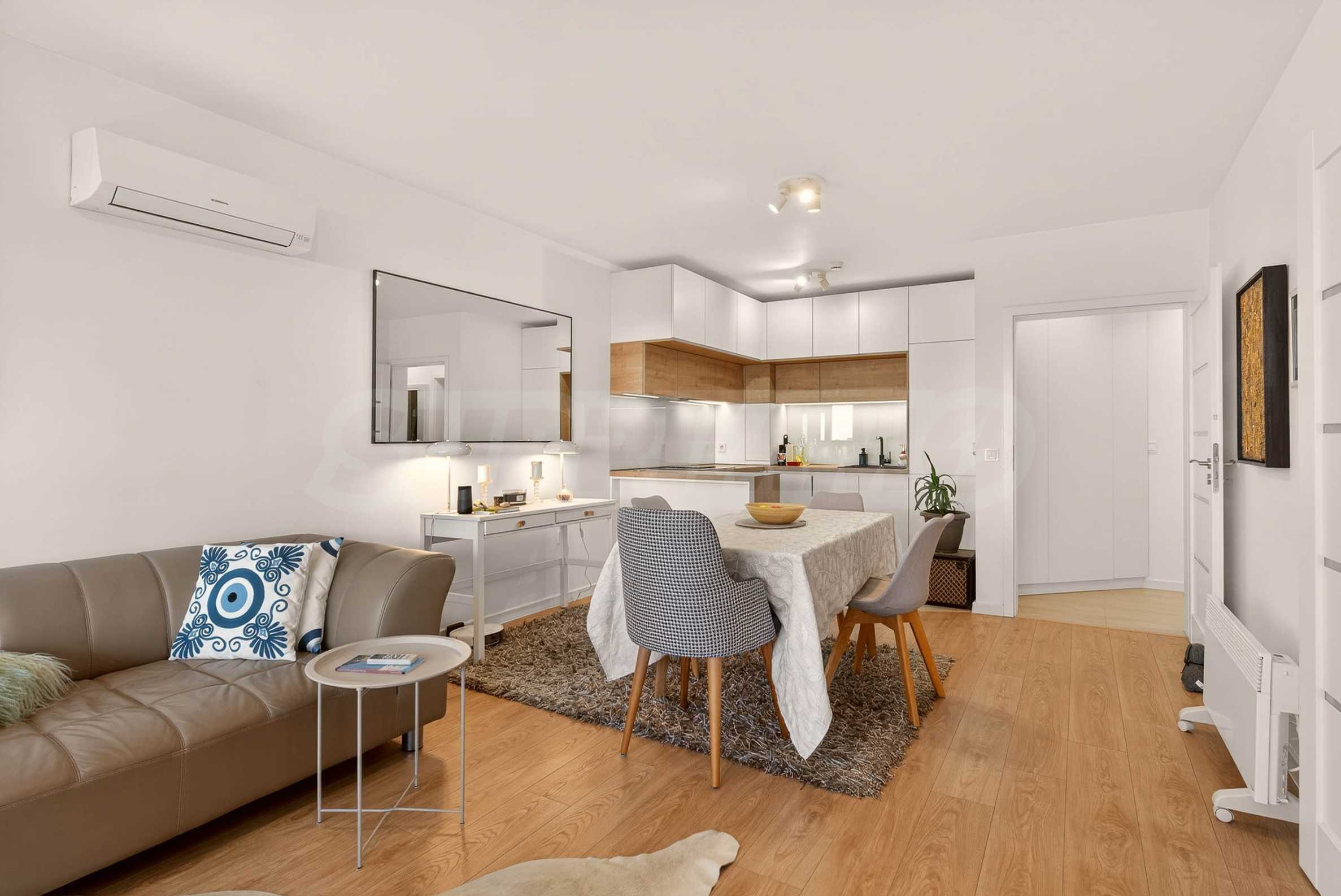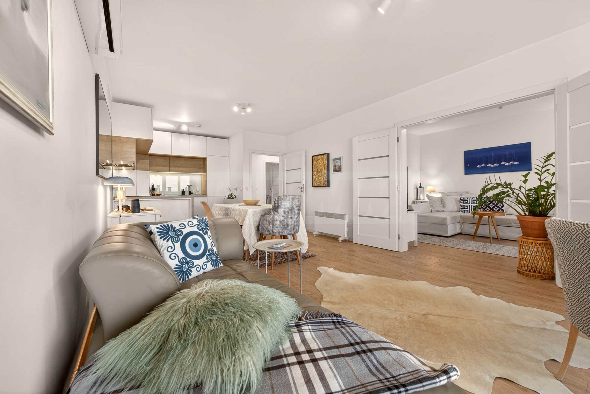 Интериорът е изпълнен с внимание към детайла и естествените материали – подови настилки от масивно дърво, текстил от памук и лен, висок клас интериорни врати и система за омекотяване на водата. Апартаментът се продава частично обзаведен и е готов да посрещне новите си собственици без излишни компромиси.