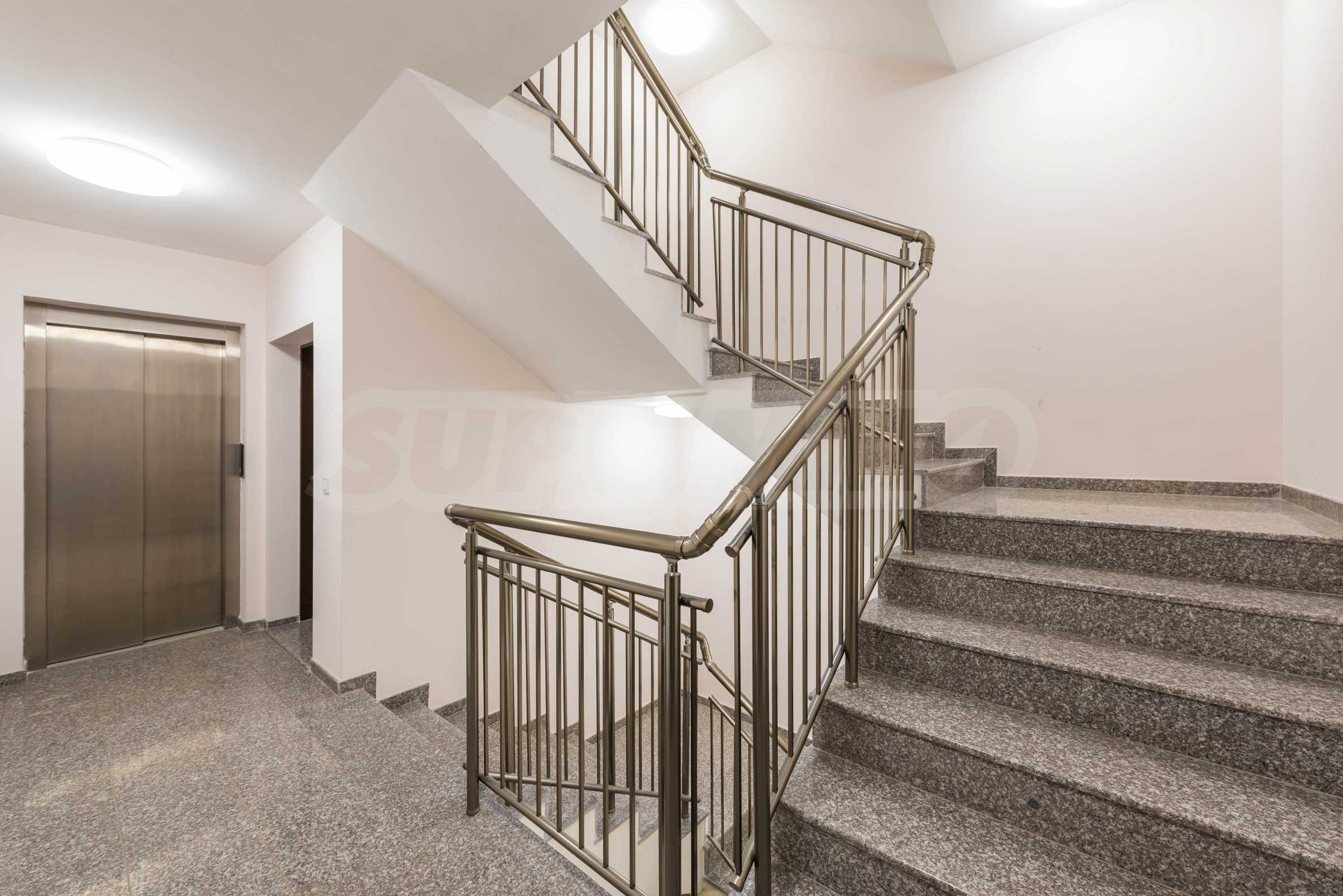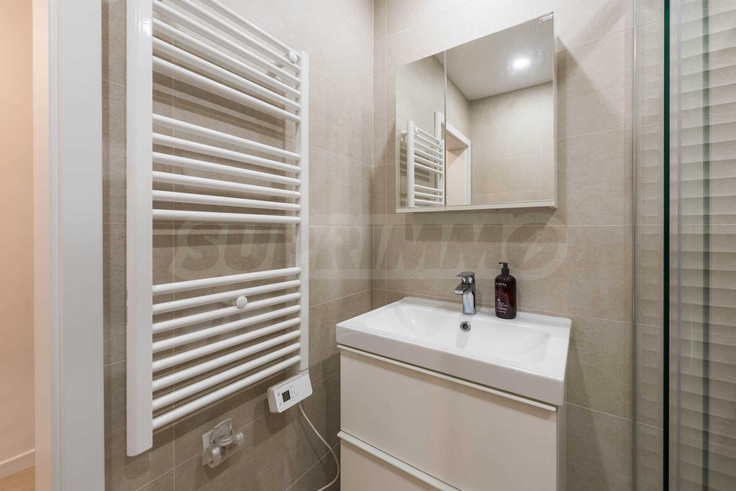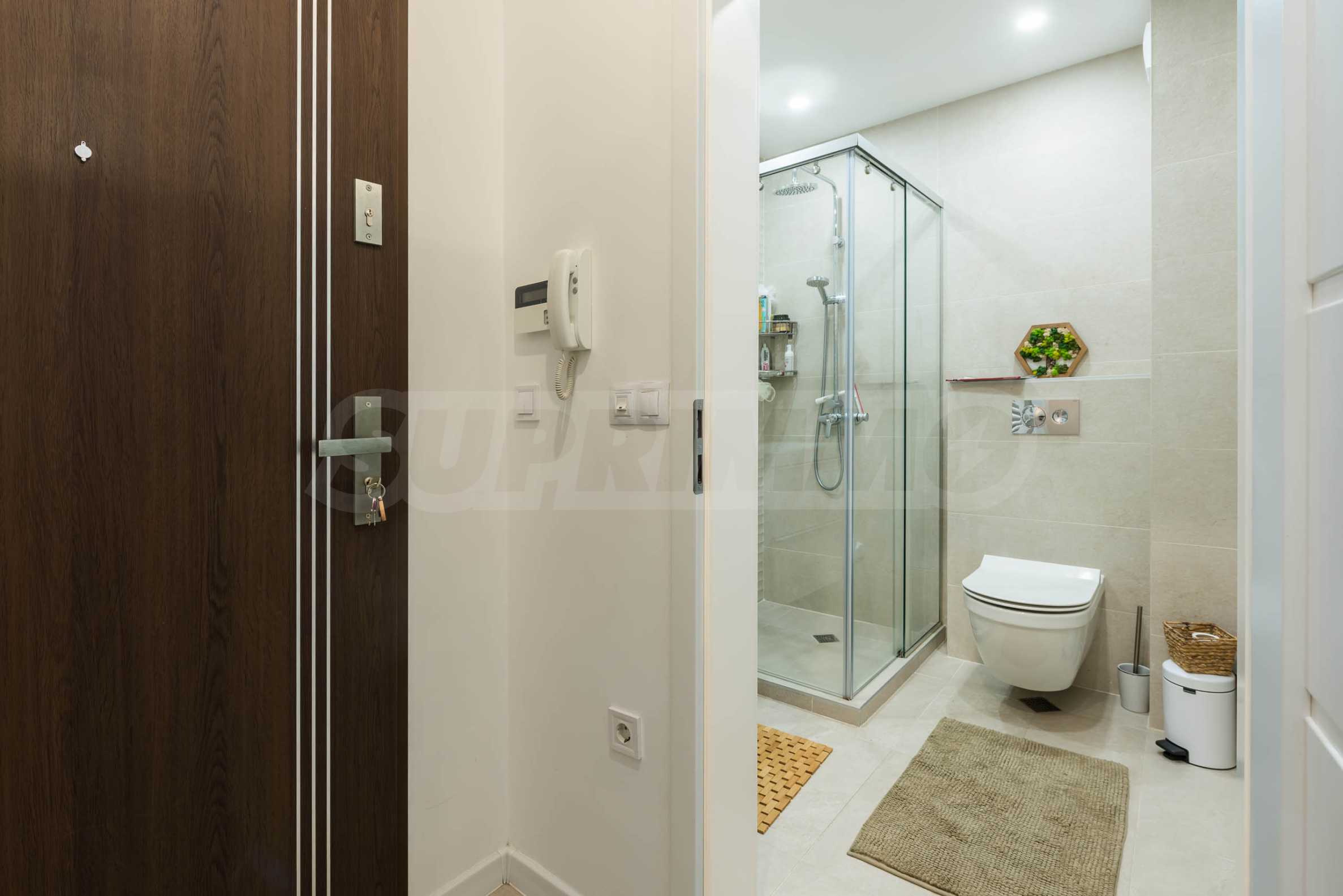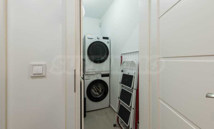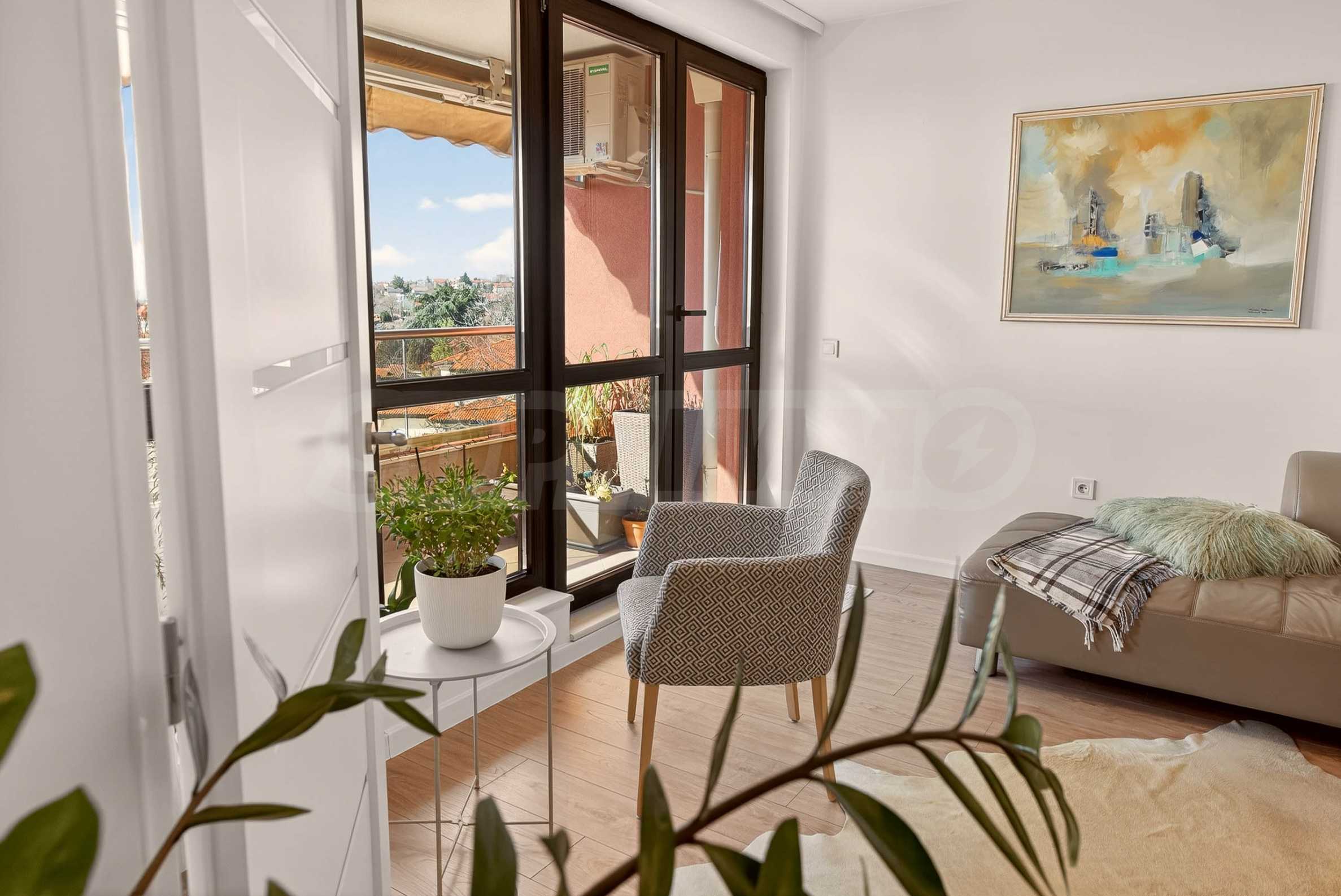 Интериорът е изпълнен с внимание към детайла и естествените материали – подови настилки от масивно дърво, текстил от памук и лен, висок клас интериорни врати и система за омекотяване на водата. Апартаментът се продава частично обзаведен и е готов да посрещне новите си собственици без излишни компромиси.