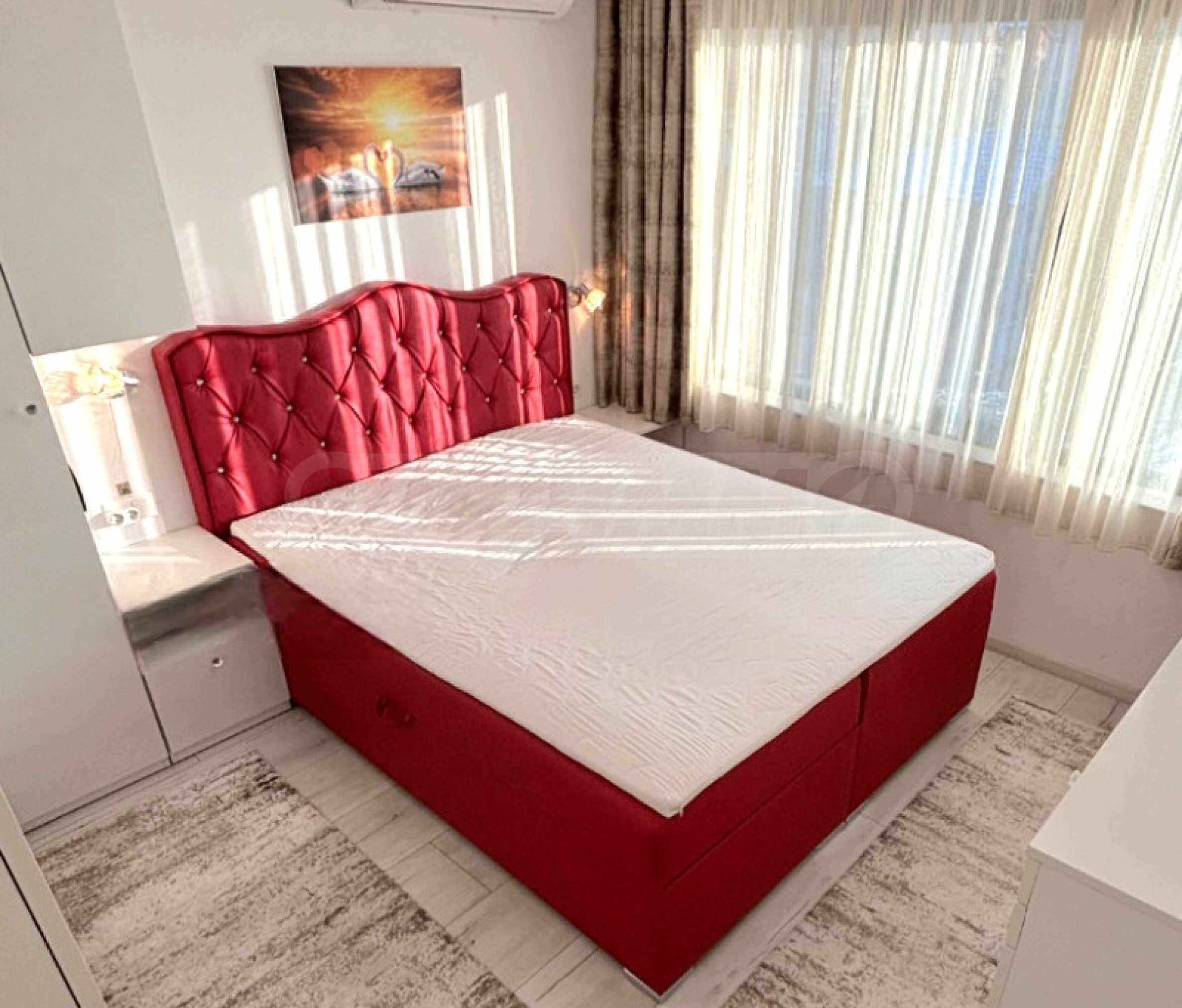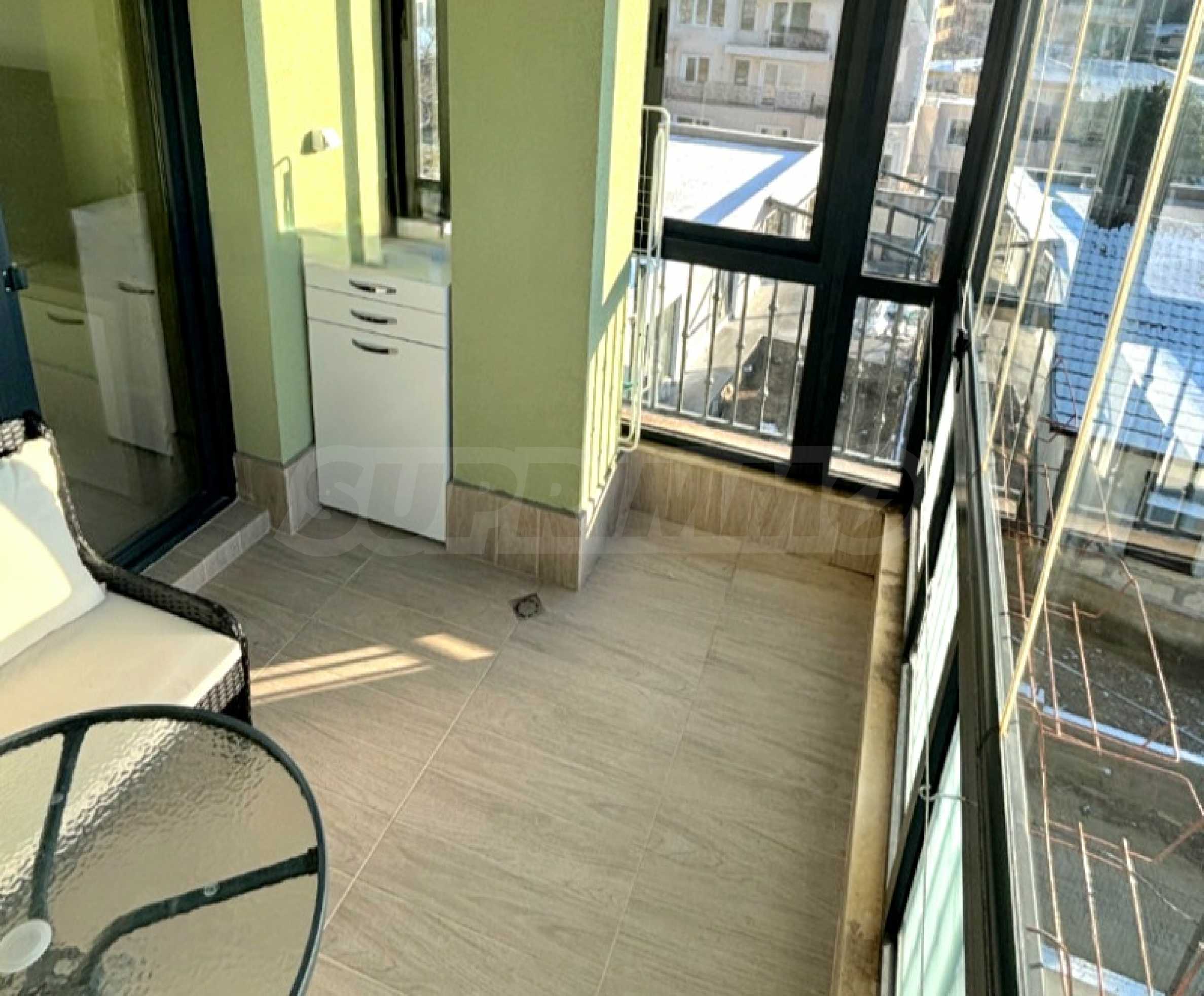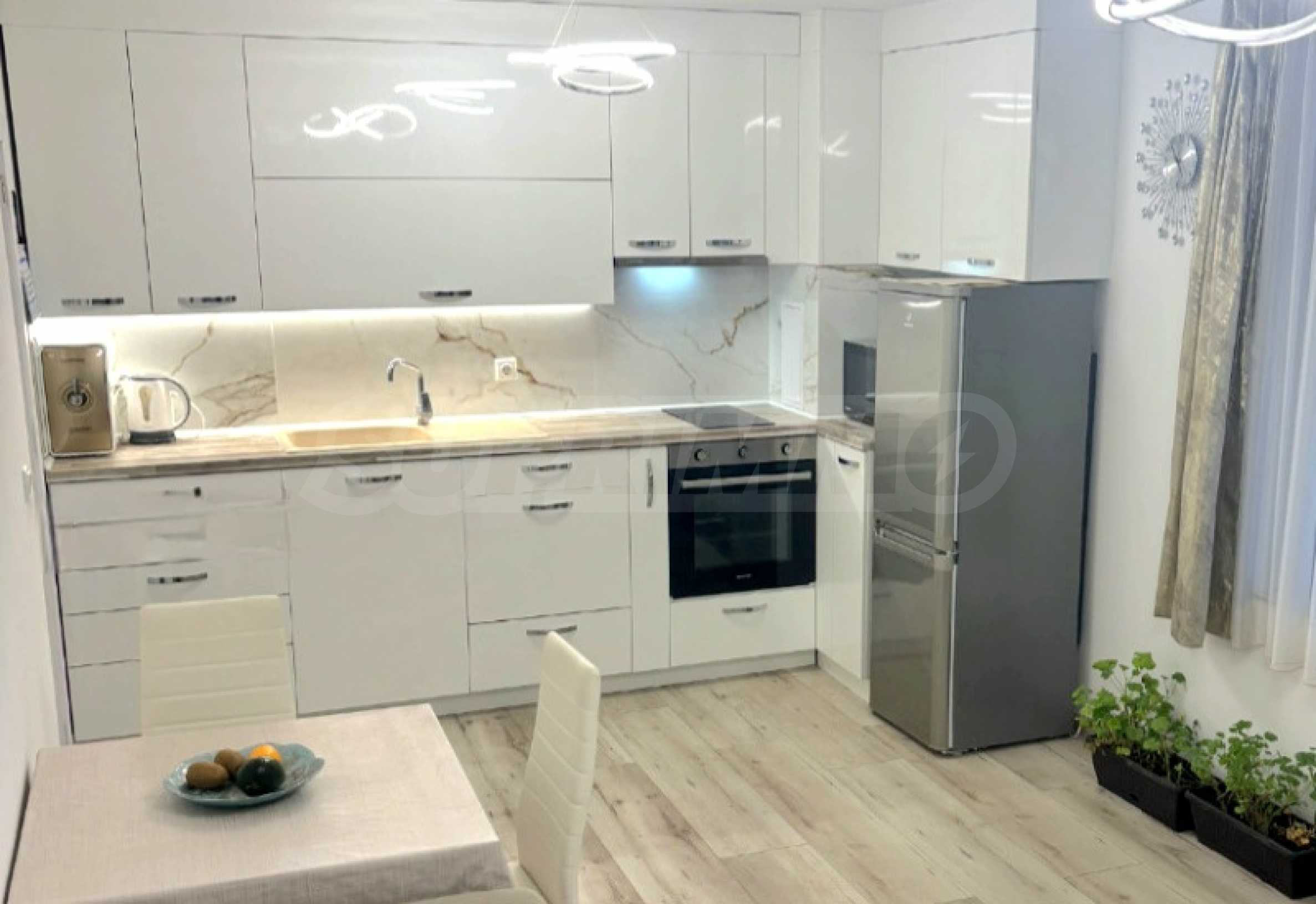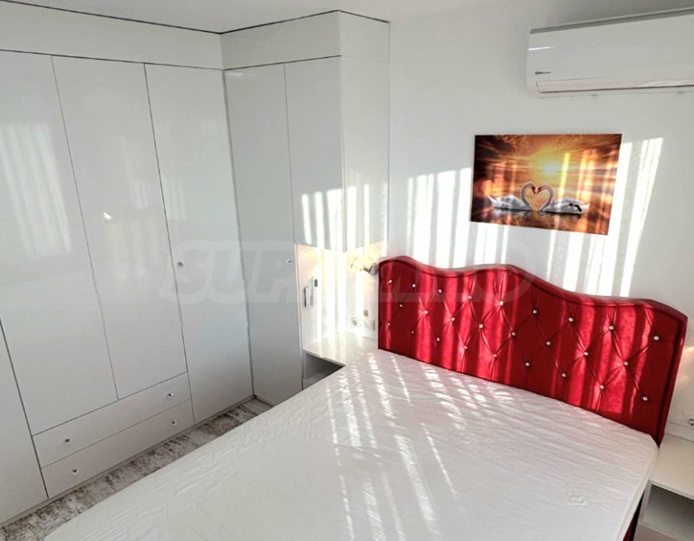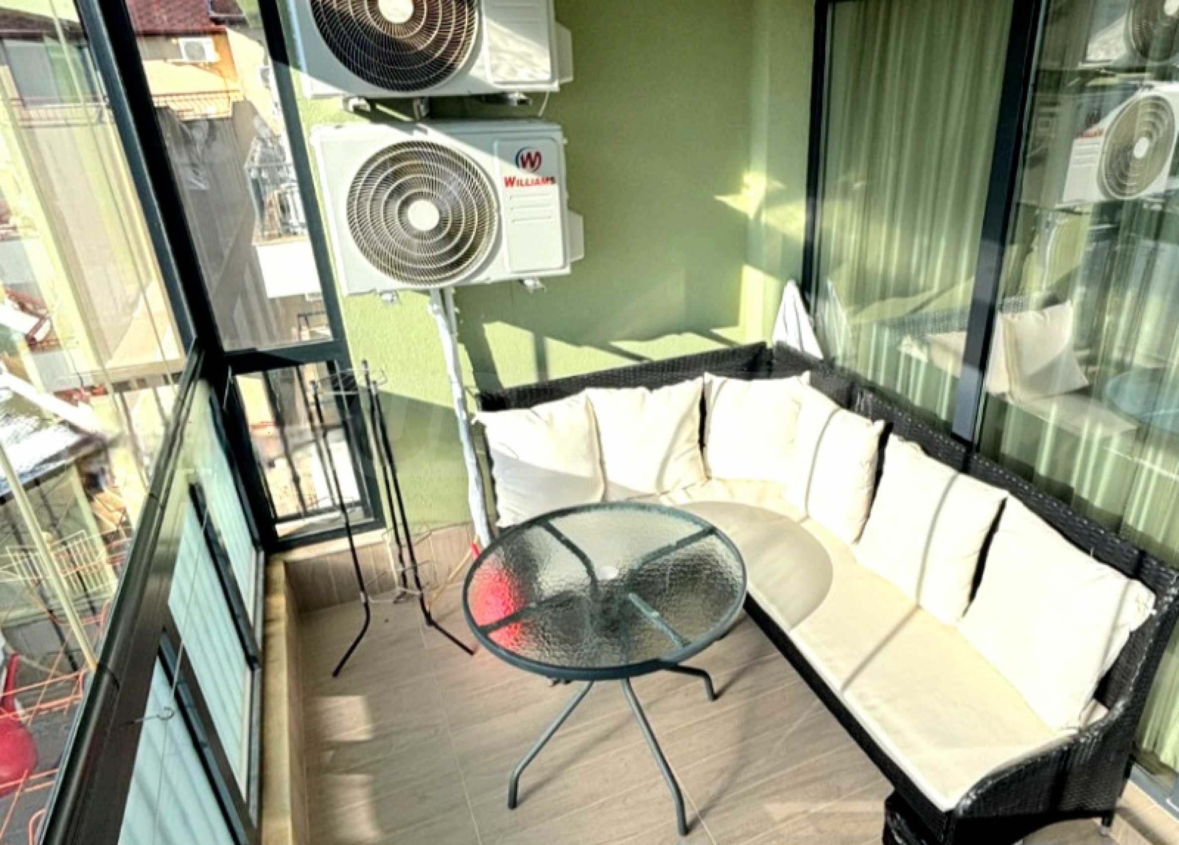 Апартаментът е напълно обзаведен и оборудван с нови мебели и висококачествени електроуреди - климатици, пералня с функция сушилня, просторни гардероби и др. Тераса е остъклена и превърната в уютен кът за хранене и отдих с гледка към морето.