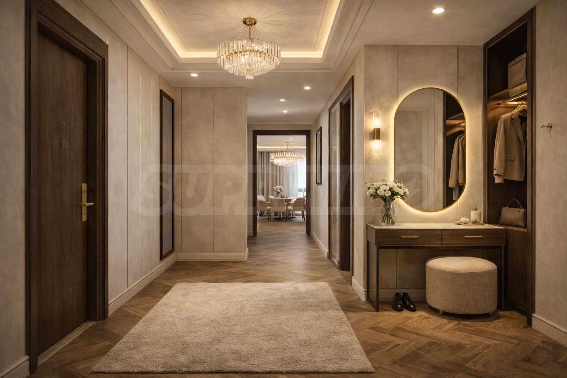 Апартаментът предлага отлично разпределение и функционално пространство – просторна дневна с кухненска част, две самостоятелни спални, две санитарни помещения и тераса. Южното изложение осигурява много естествена светлина и комфорт през цялата година.