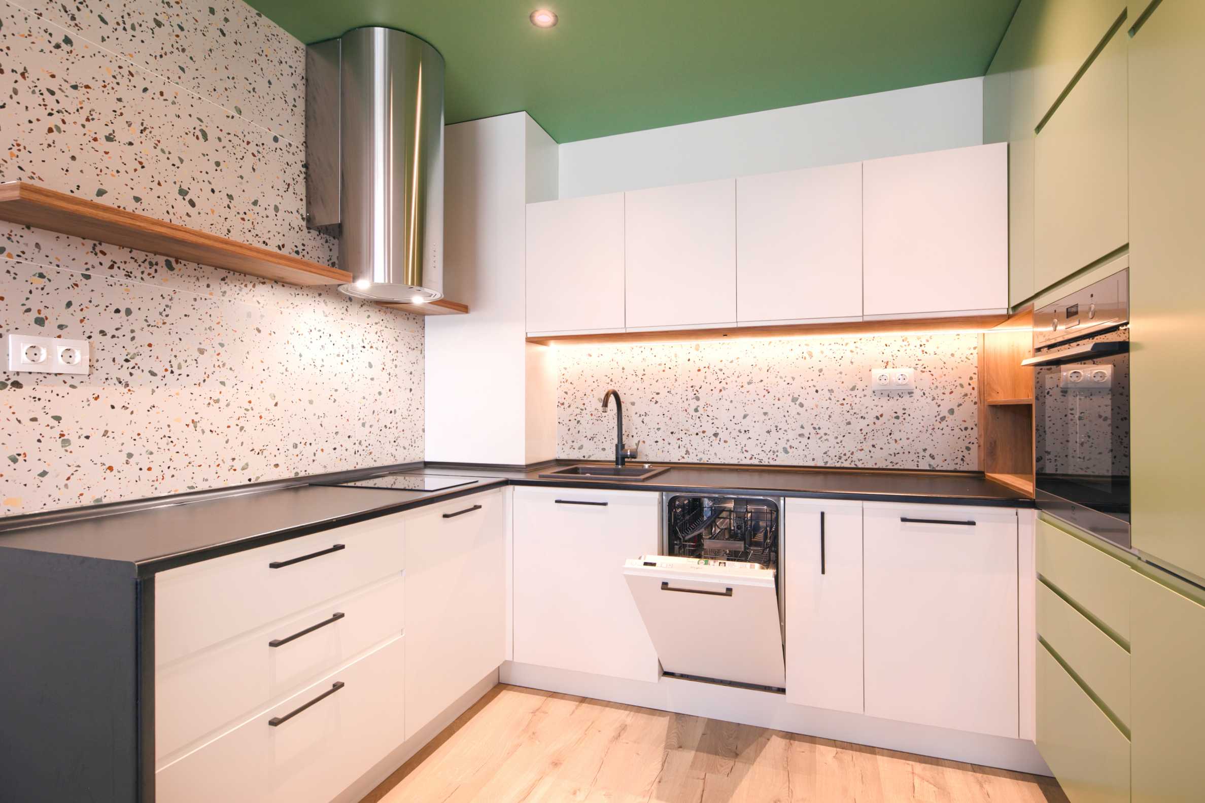 • Кухнята е напълно оборудвана с вградени електроуреди, включително съдомиялна, фурна, котлони, абсорбатор и хладилник, както и практично вътрешно разпределение на шкафовете.