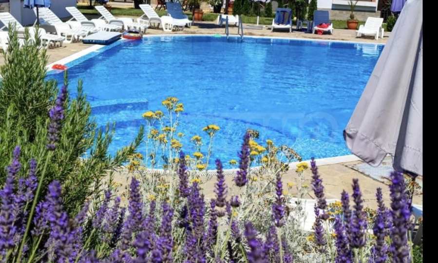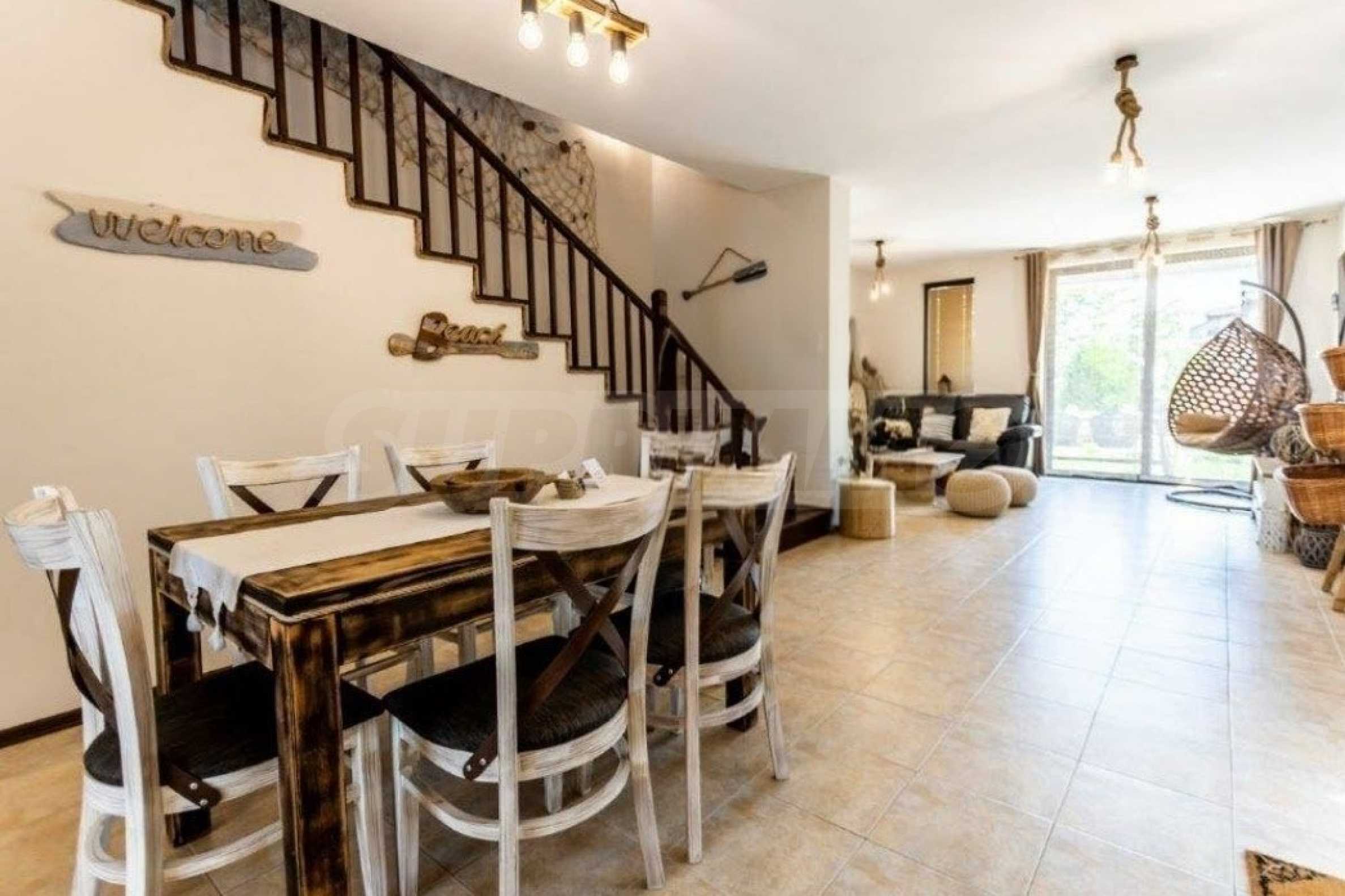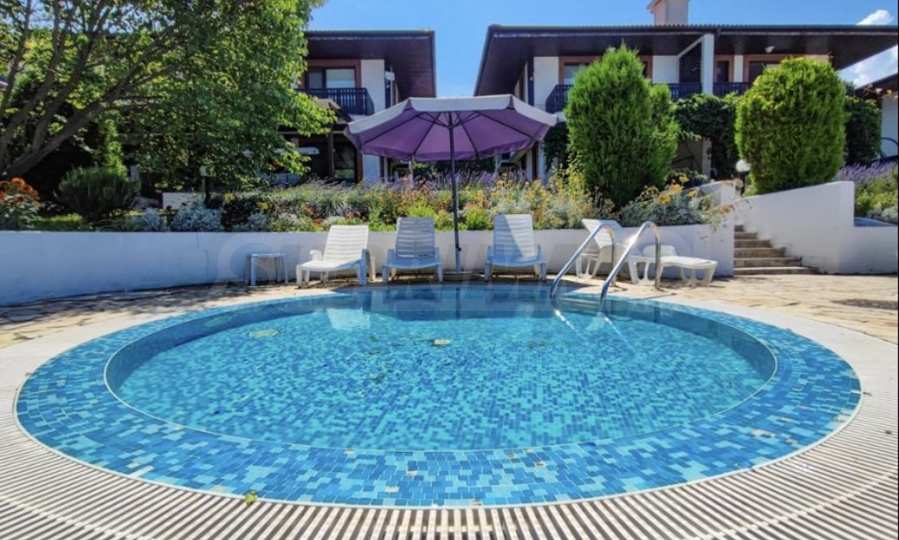 • етаж 1: антре, просторна дневна с трапезария и кухня, баня с тоалет, веранда с гледка към басейна и градината на комплекса;