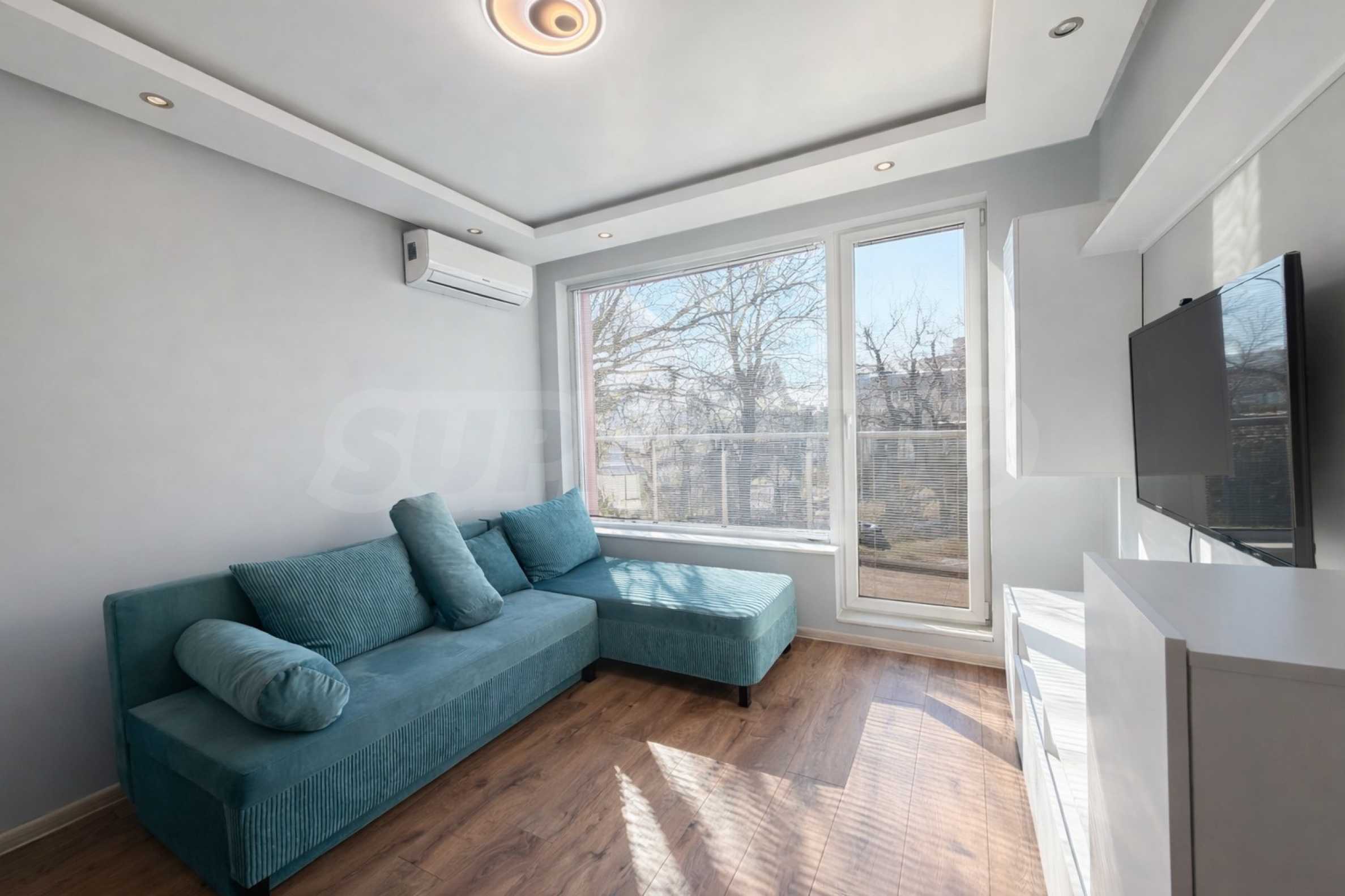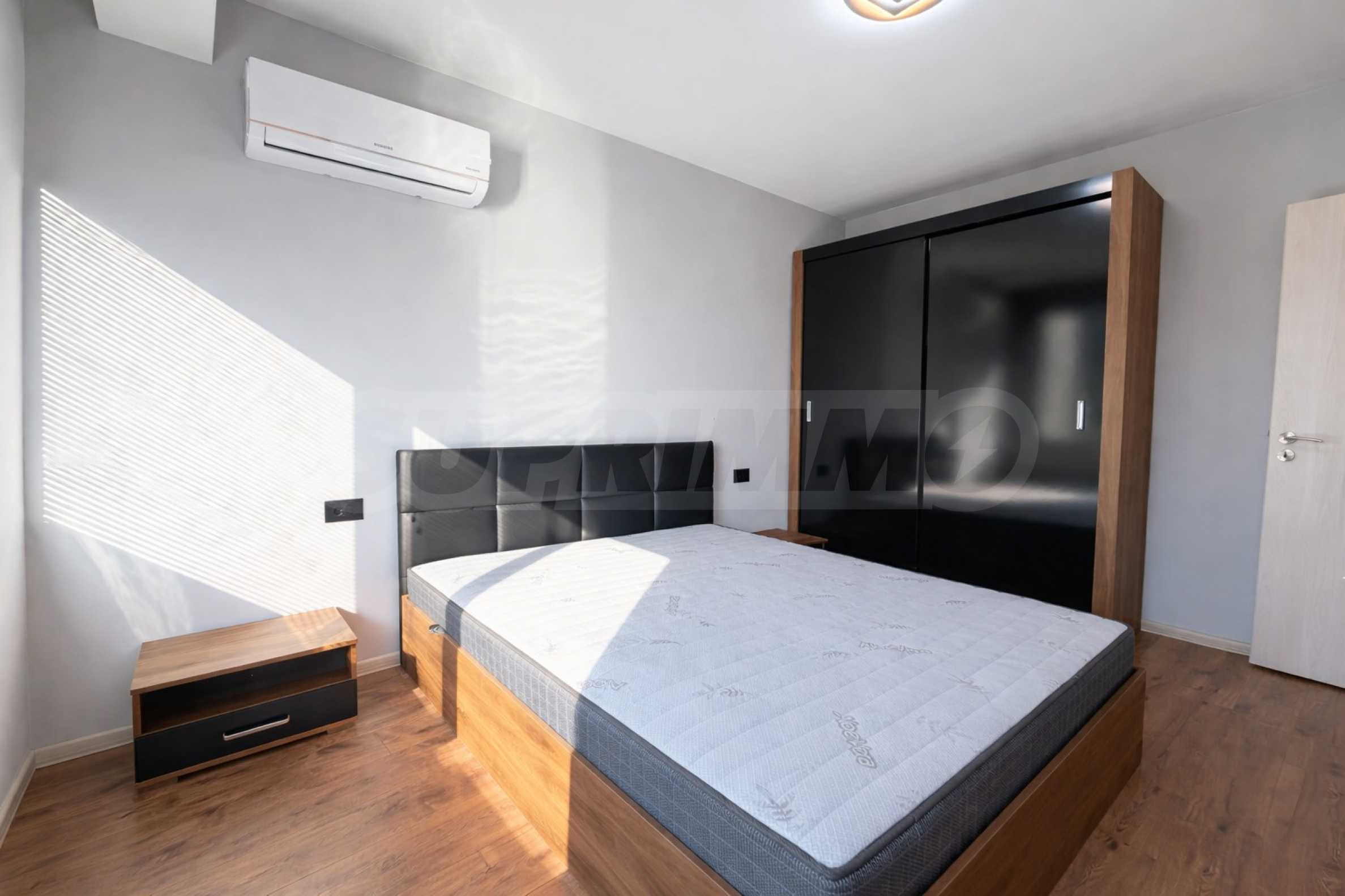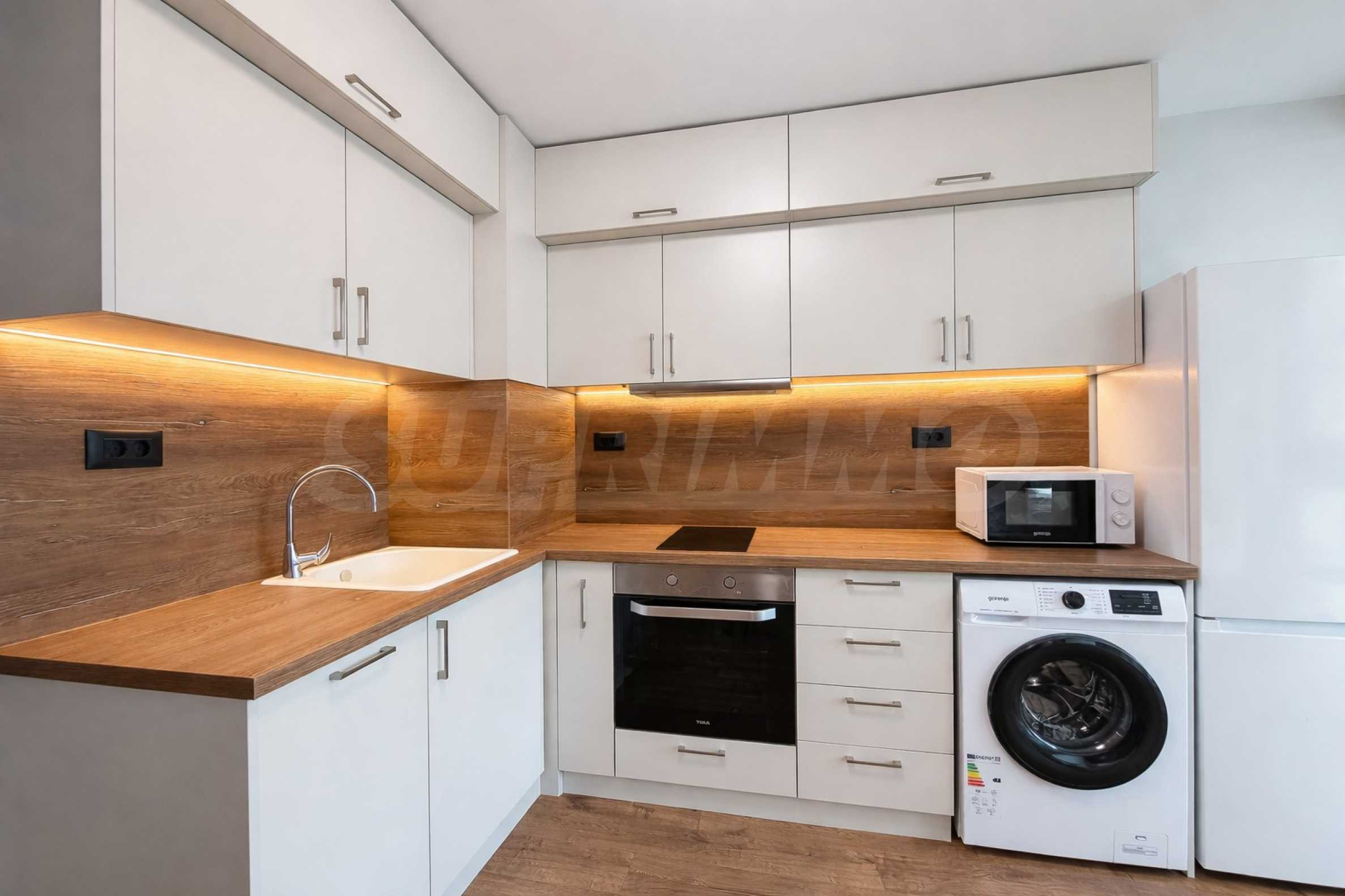 Апартаментът се предлага напълно обзаведен и оборудван с всички необходими електроуреди – телевизори, пералня, съдомиялна машина и микровълнова фурна. Готов е за нанасяне веднага.