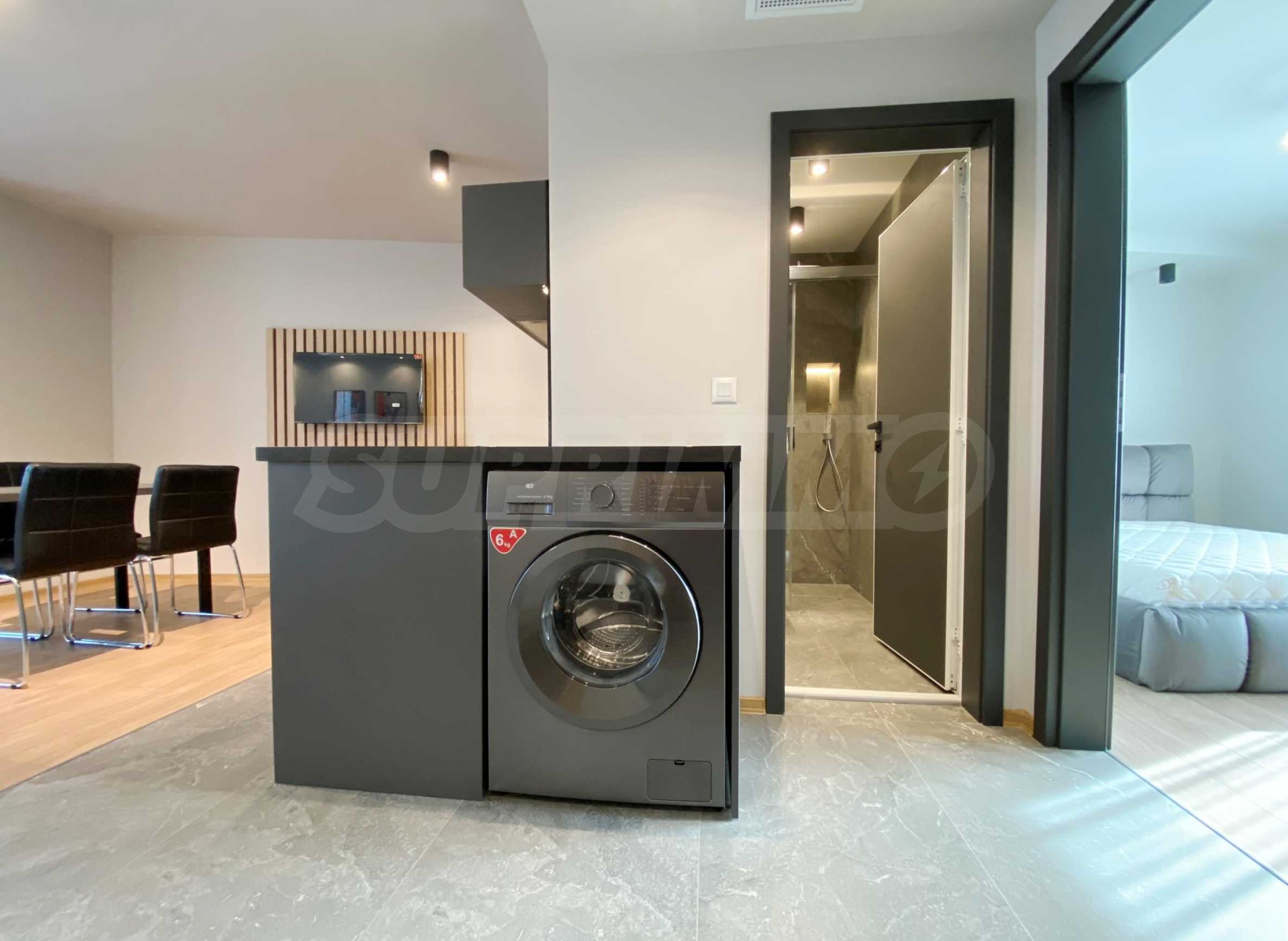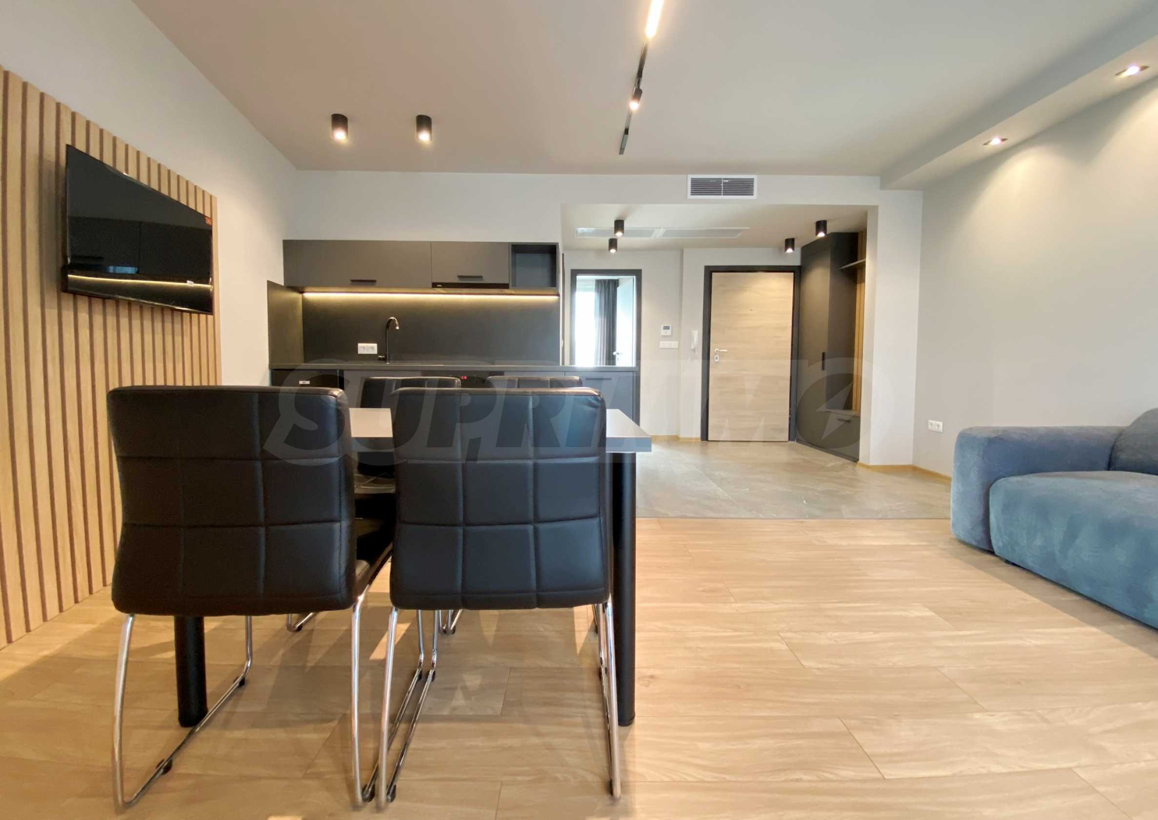 Апартаментът е стилно и модерно обзаведен и оборудван с всичко необходимо като нови мебели и ел. уреди в гаранция. Отоплението и охлаждането са решени с нови инверторни климатици с контрол на температурата във всяка стая. Разполага също и с smart телевизори във всяка стая, както и оптичен нет.