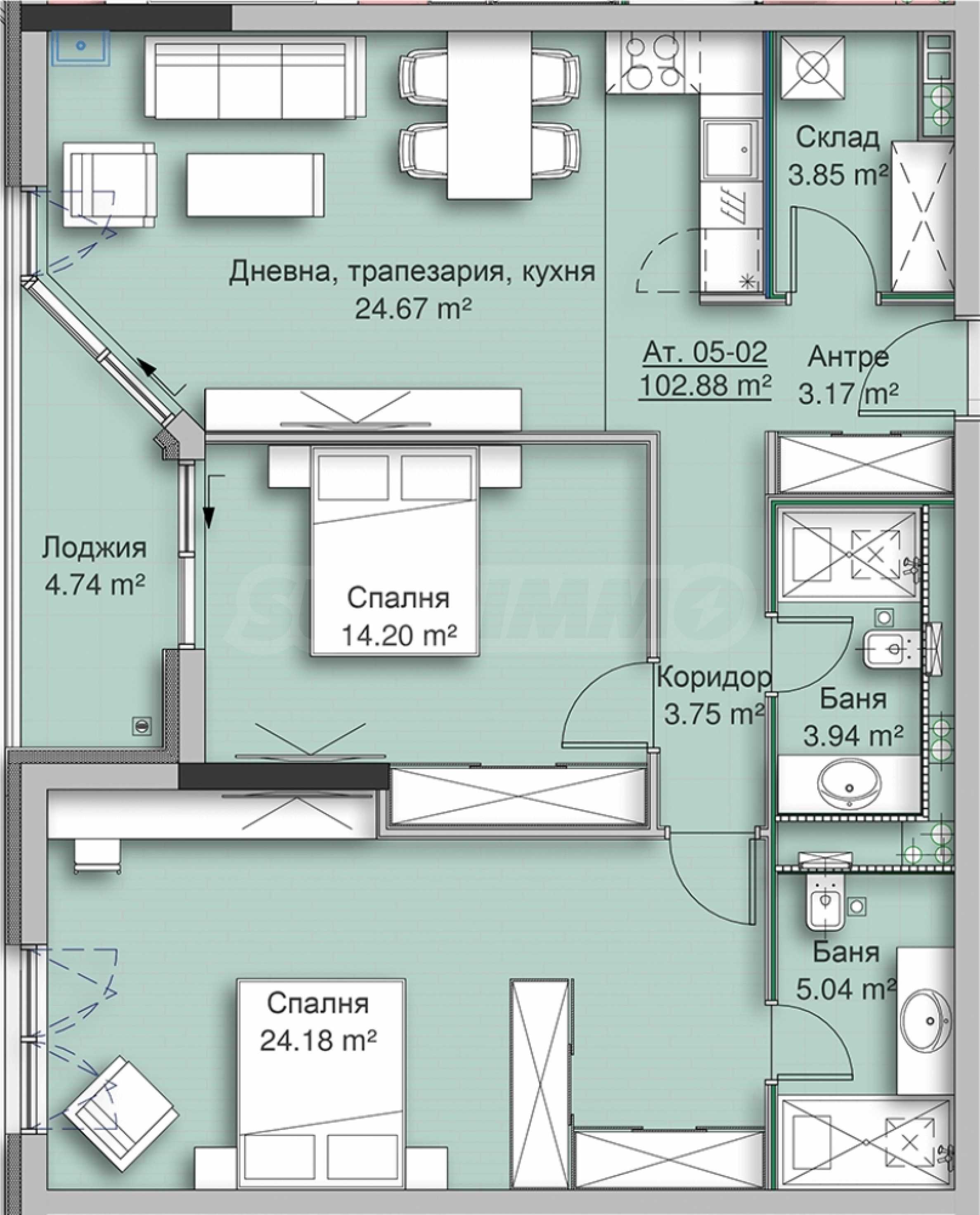 Жилището се състои от просторна дневна с кухненска зона, две самостоятелни спални, две бани с тоалетна, гардеробна и тераса тип лоджия, идеална за отдих.