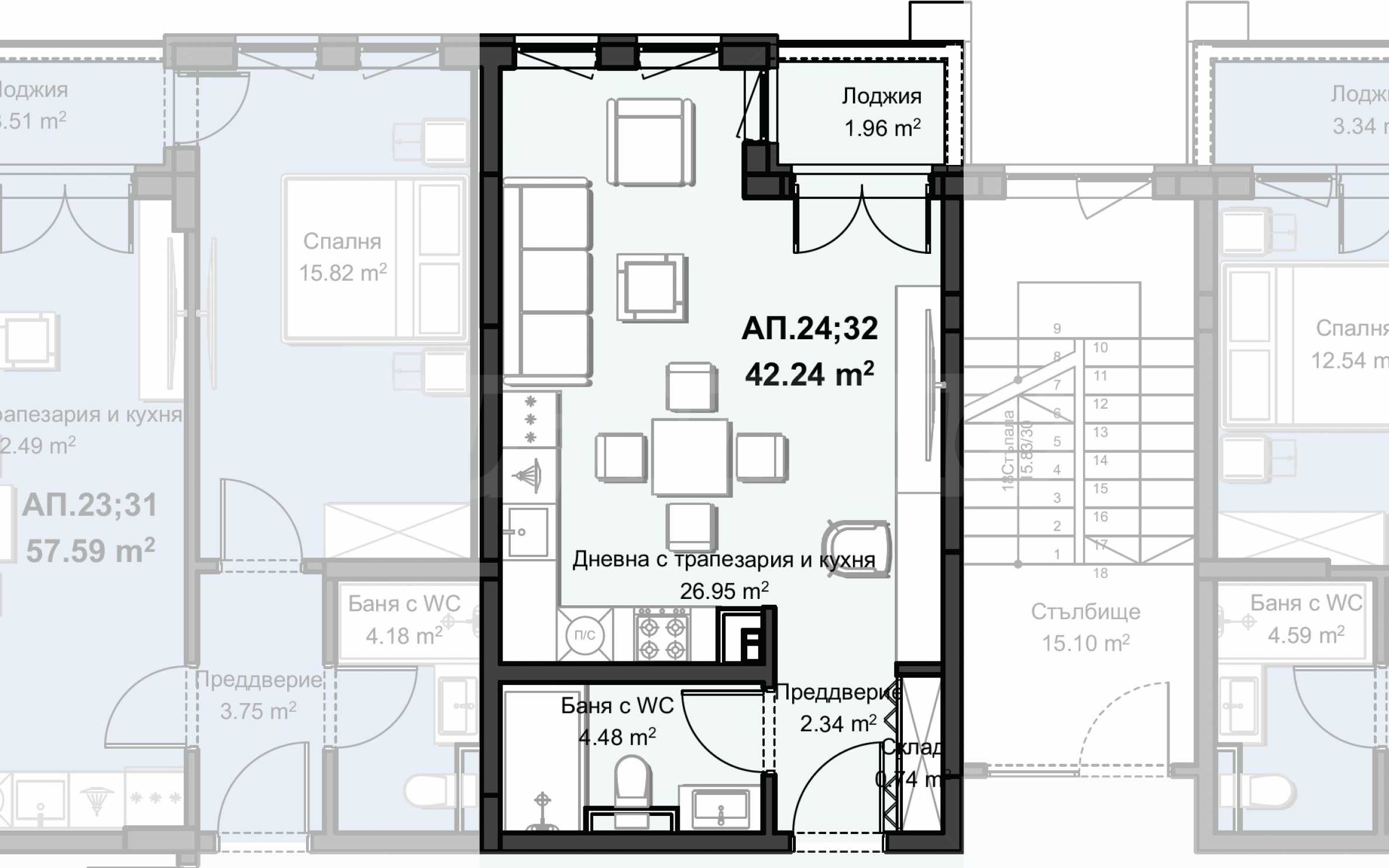 Проектиран с мисъл за пълноценен начин на живот, той предлага разнообразие от апартаменти – от практични едностайни до просторни многостайни жилища, с възможност за обединяване. Всички жилища са с отлично разпределение, изобилие от светлина и впечатляващи гледки към зеленина, градски пейзаж и дори Гребната база след 5-и етаж.