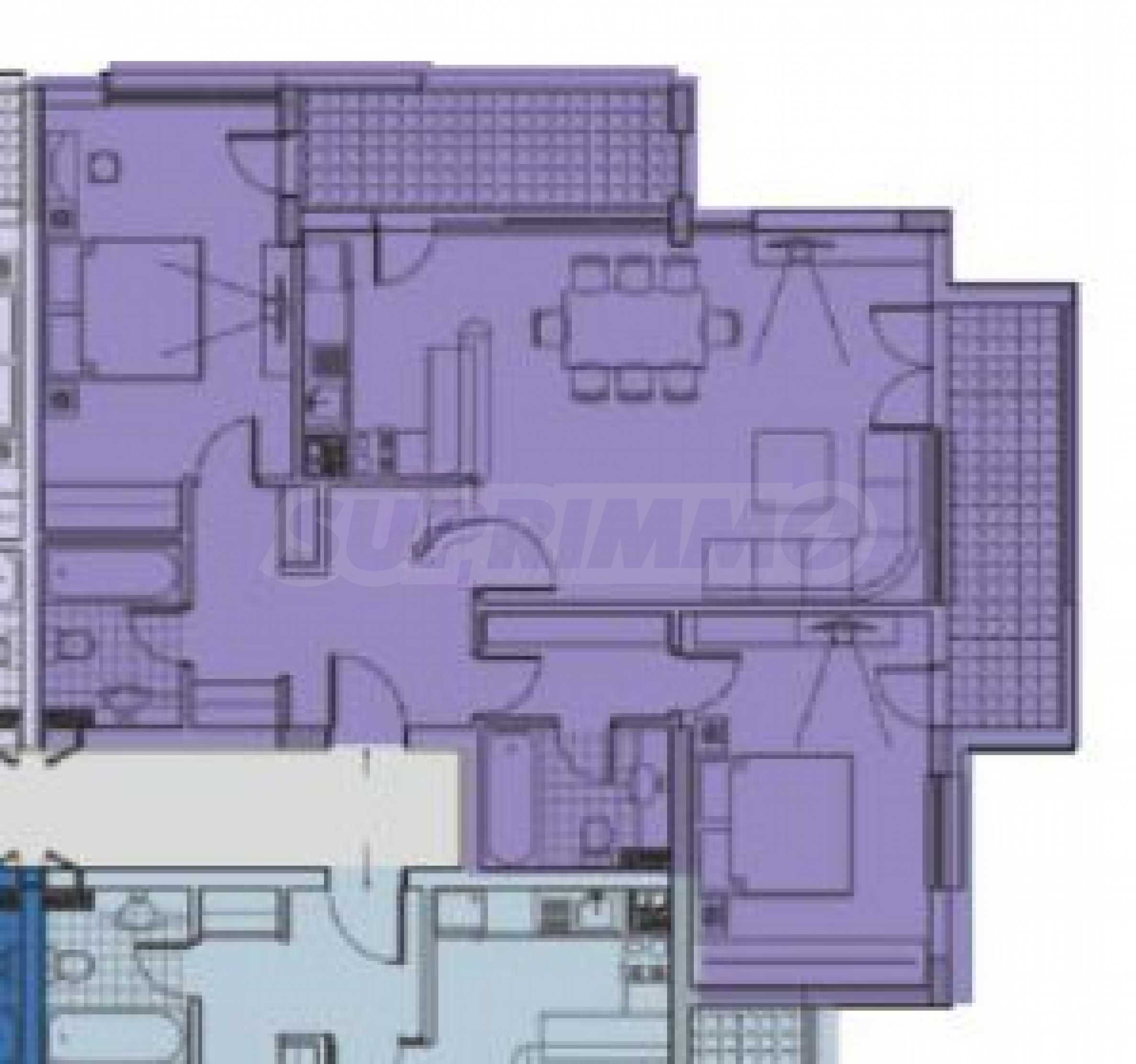 Апартаментът е тристаен, с обща площ 134.91 кв.м. (нетна площ 119.30 кв.м. + общи части 15.61 кв.м.) и е разположен на пети етаж.