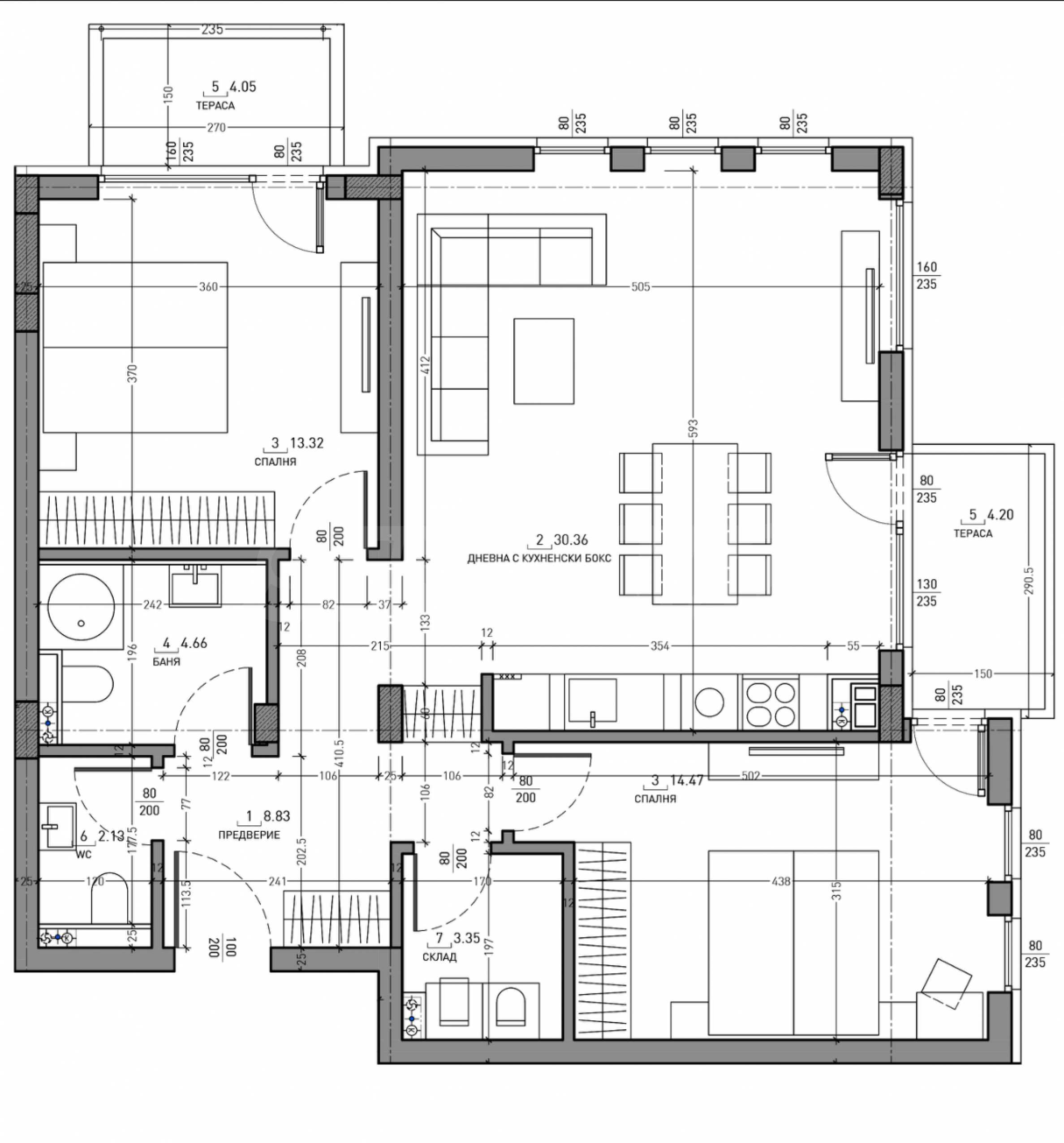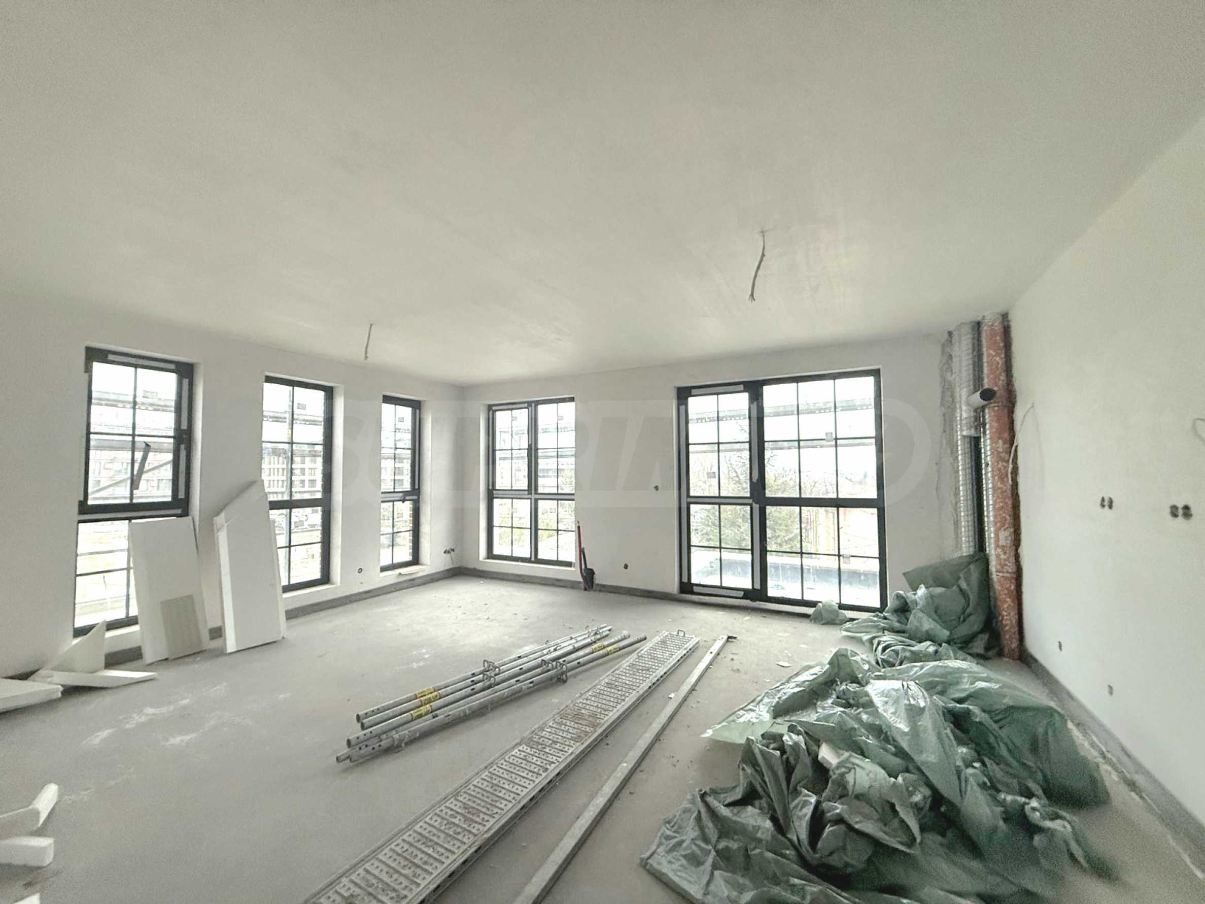 Апартаментът е разположен на четвърти етаж от общо четири за сградата. Изложението е запад/северозапад. Застроената му площ е 100 кв.м., а с общи части 118 кв.м.
