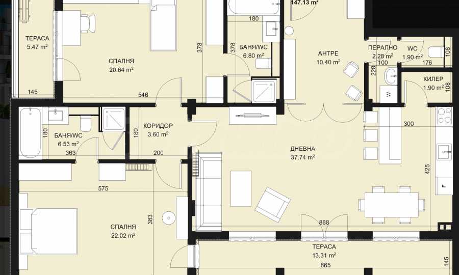 • две тераси - 13,31 кв.м и 5,47 кв.м.