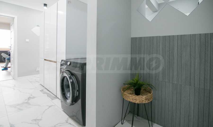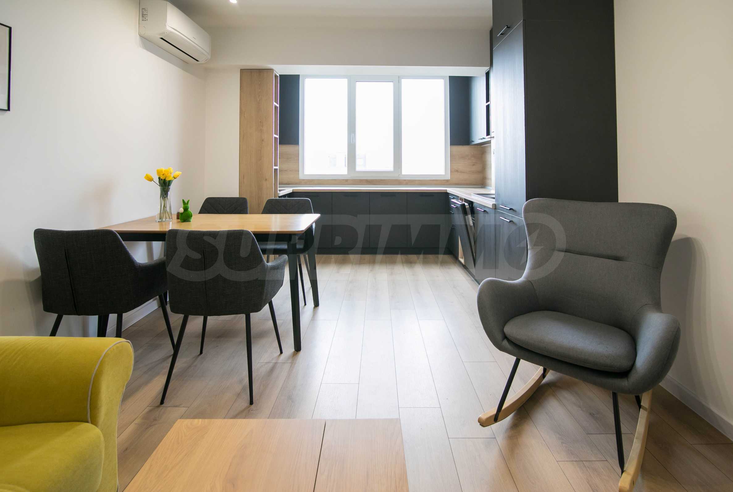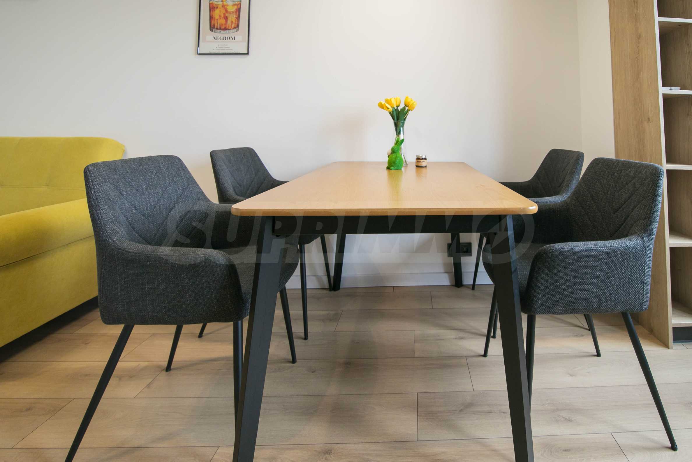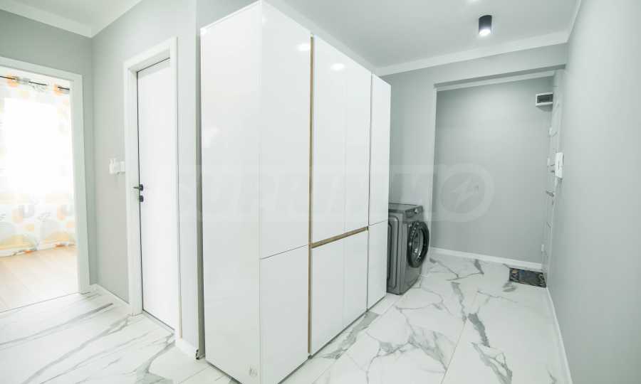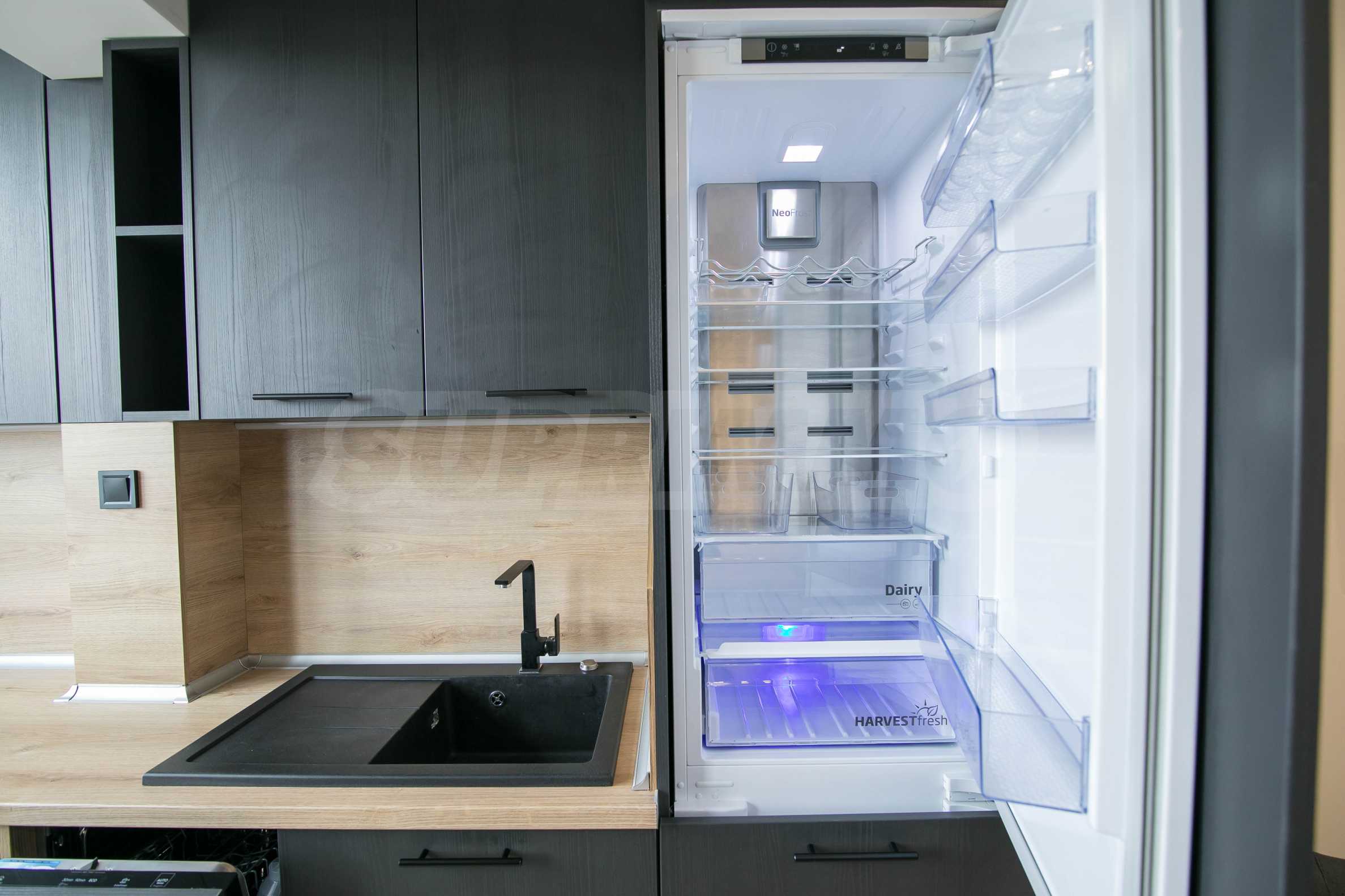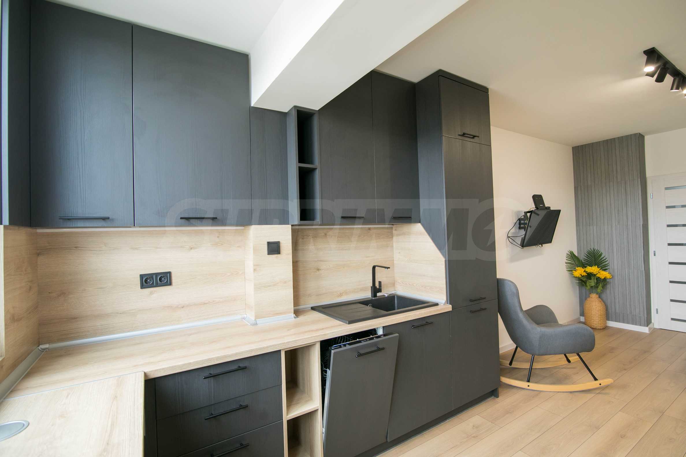 Имотът е обзаведен с чисто нови мебели и електроуреди. Жилището е напълно оборудвано с всичко необходимо за едно домакинство, като уредите са вградени – хладилник, съдомиялна машина, фурна и котлони.