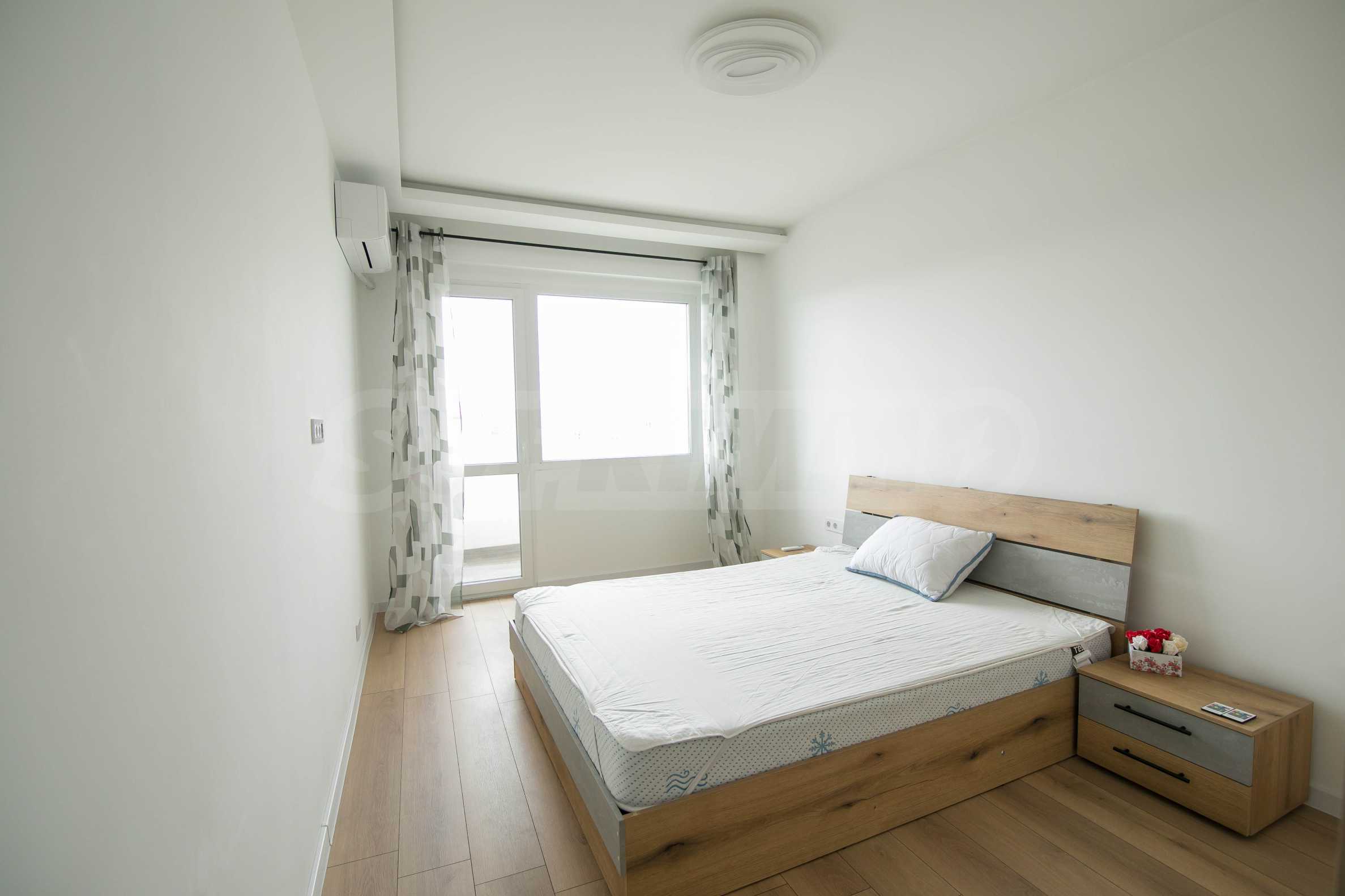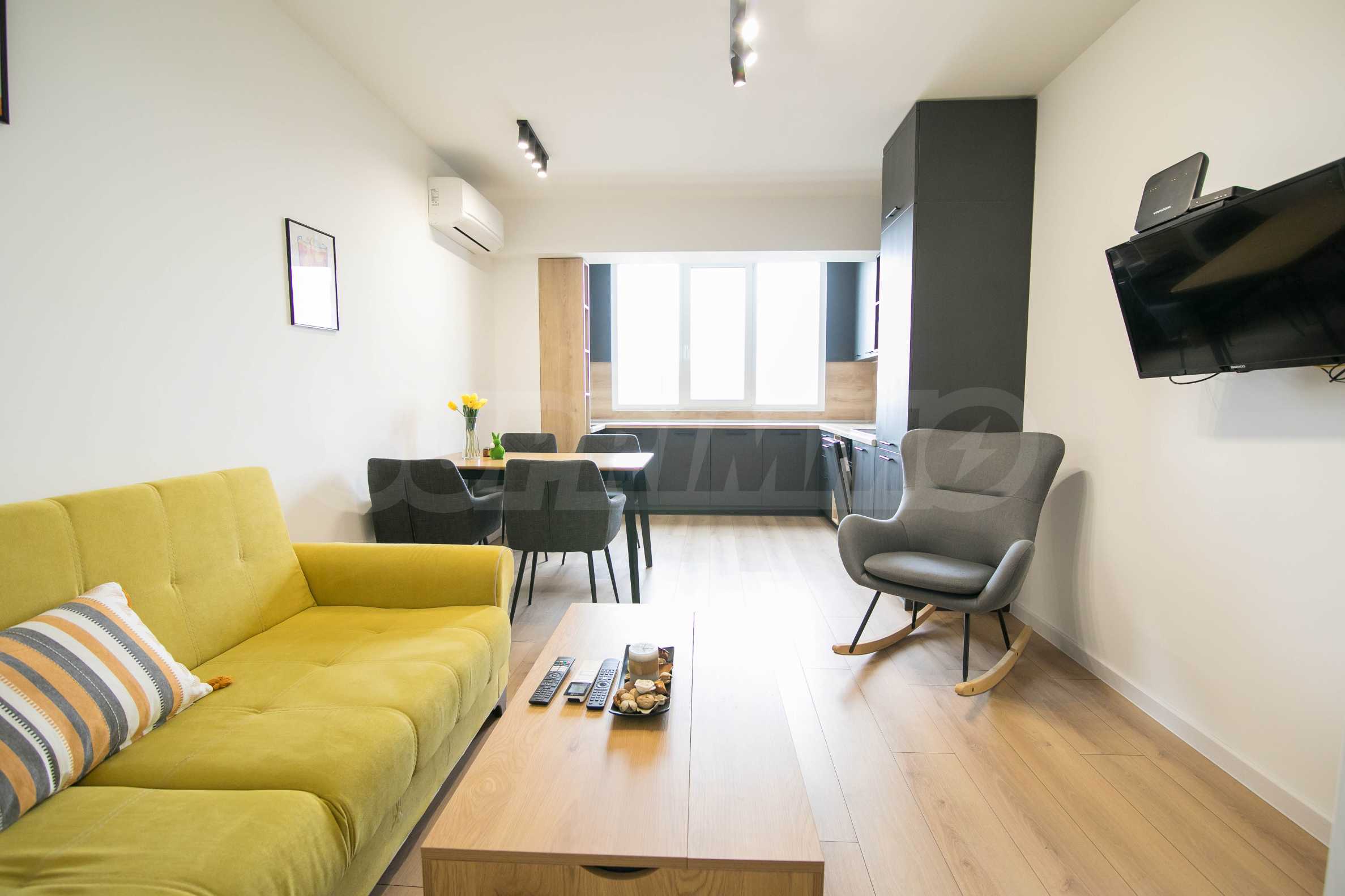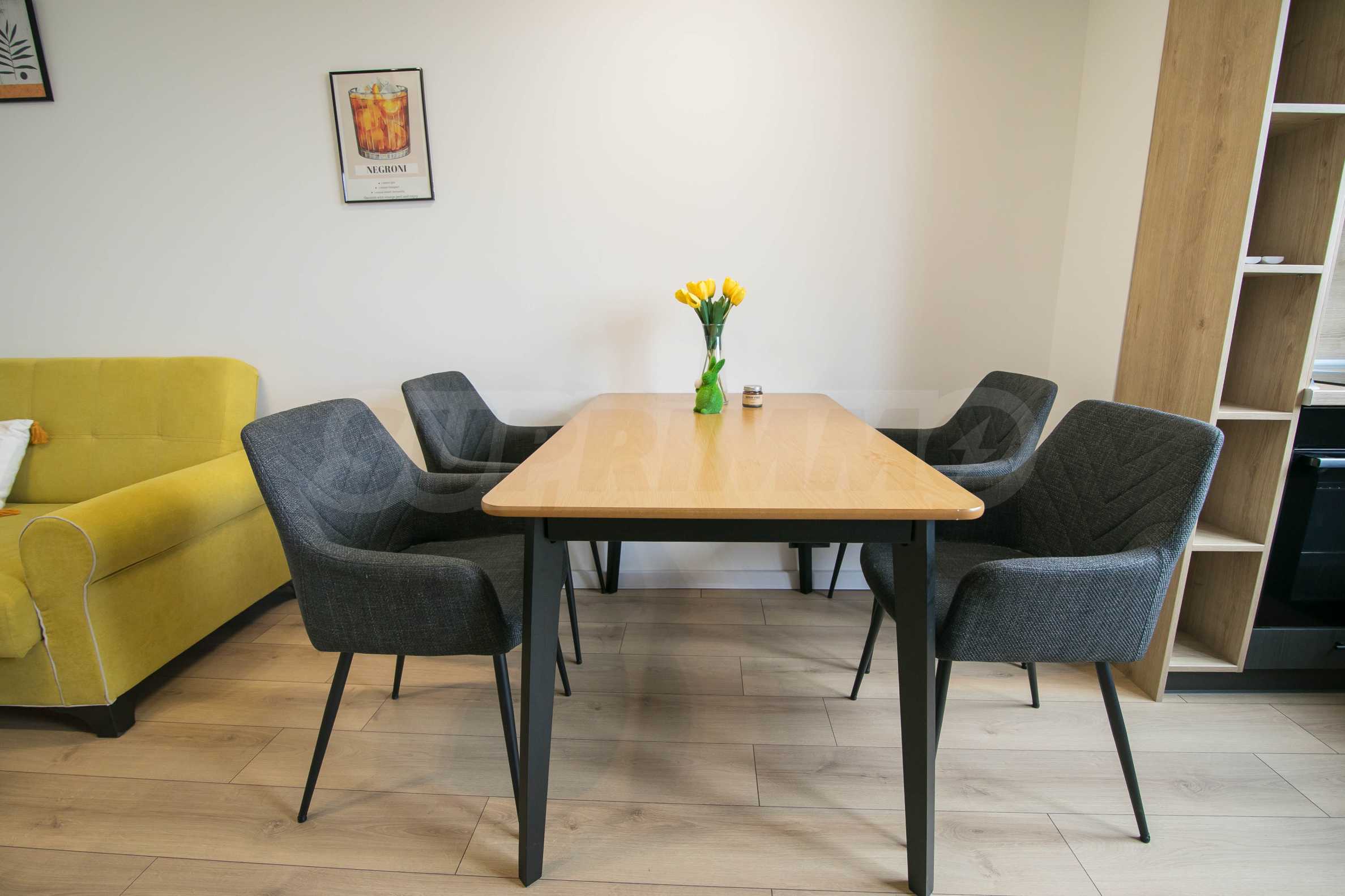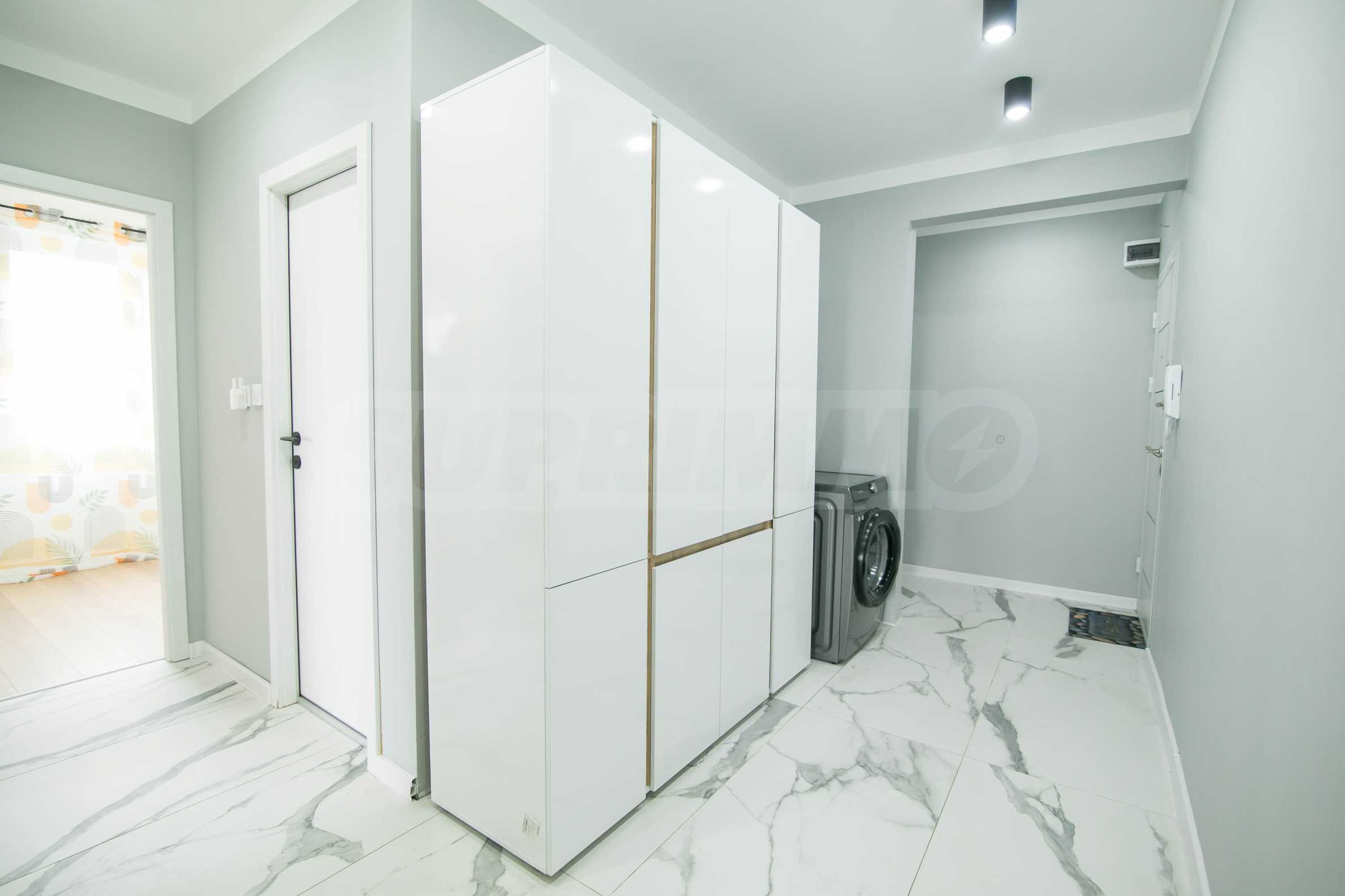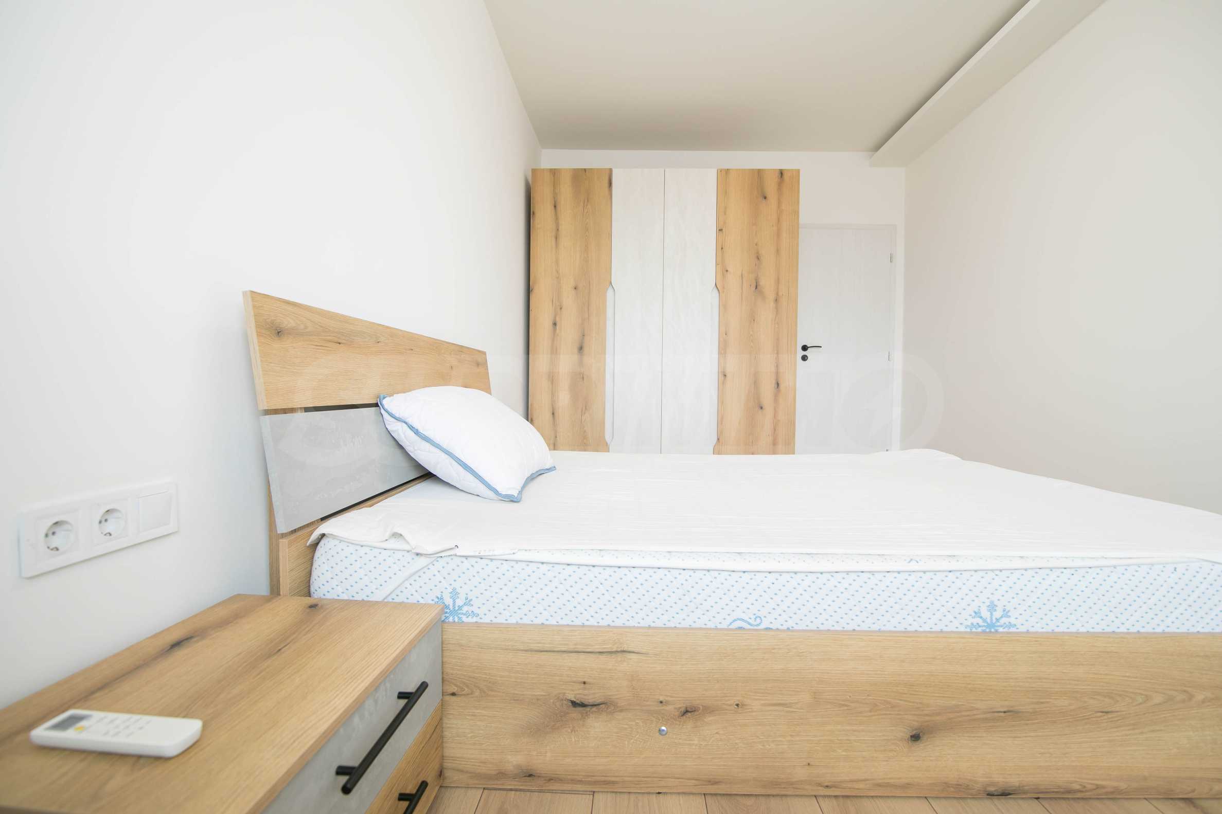 Имотът е обзаведен с чисто нови мебели и електроуреди. Жилището е напълно оборудвано с всичко необходимо за едно домакинство, като уредите са вградени – хладилник, съдомиялна машина, фурна и котлони.