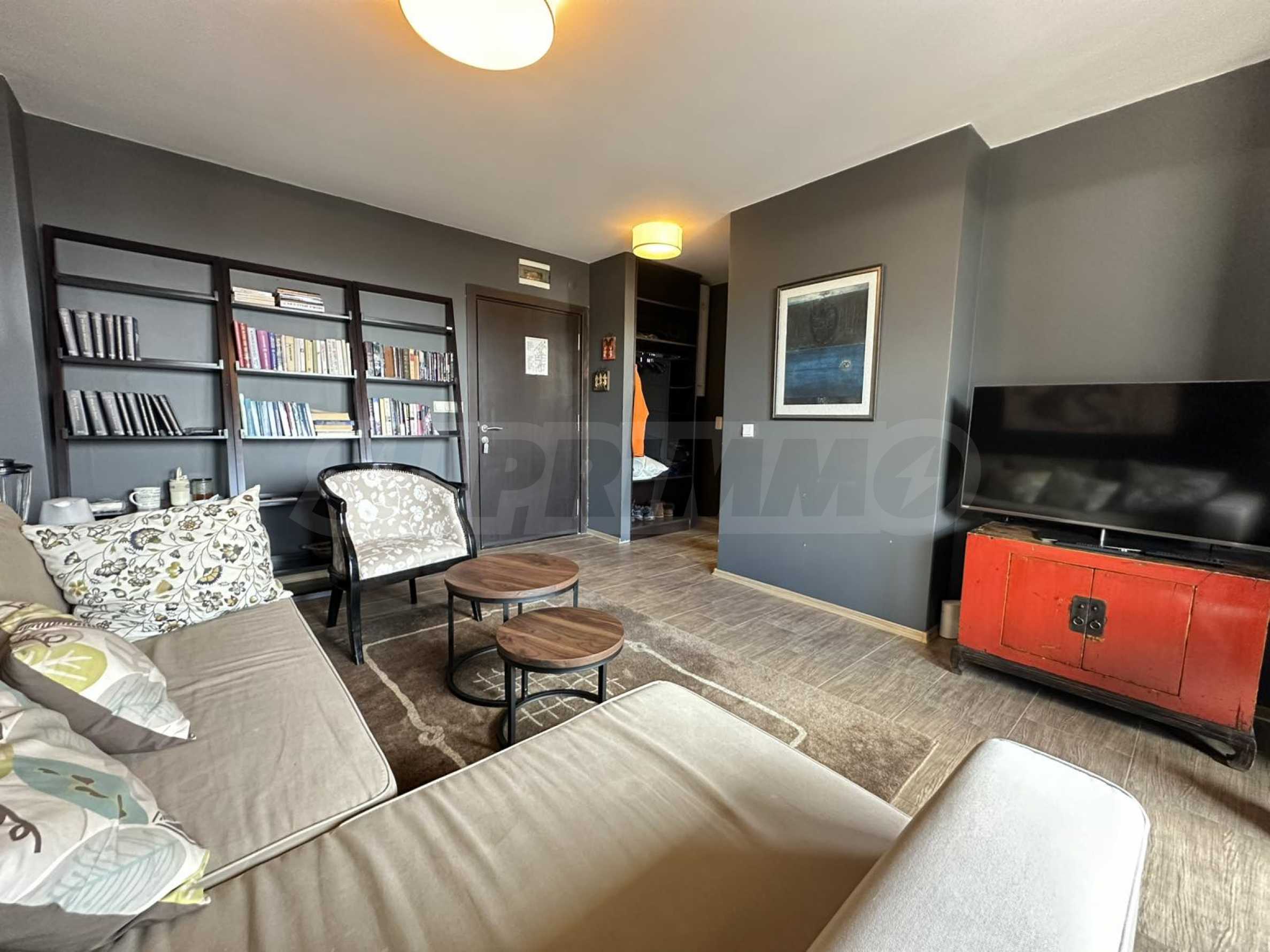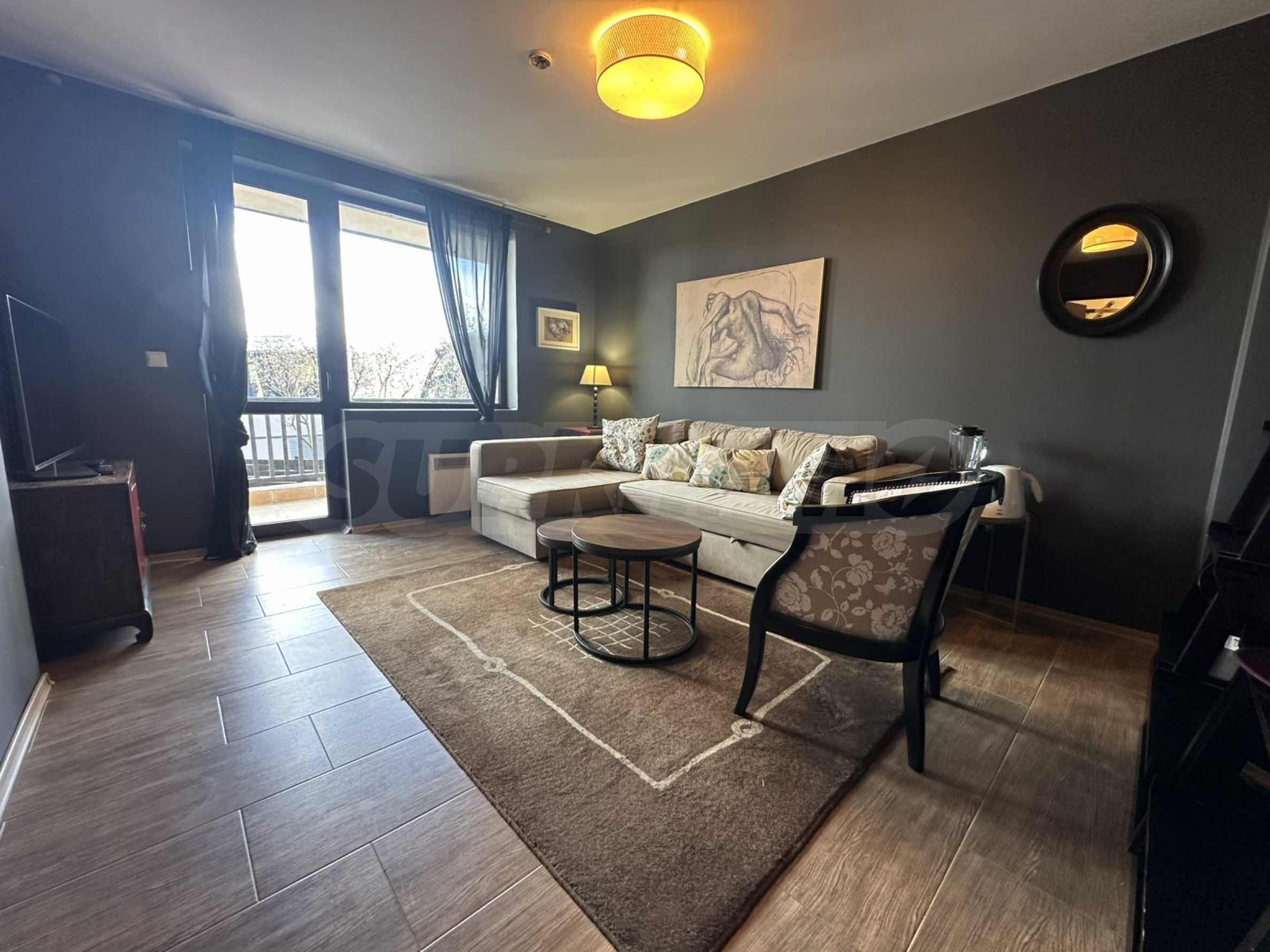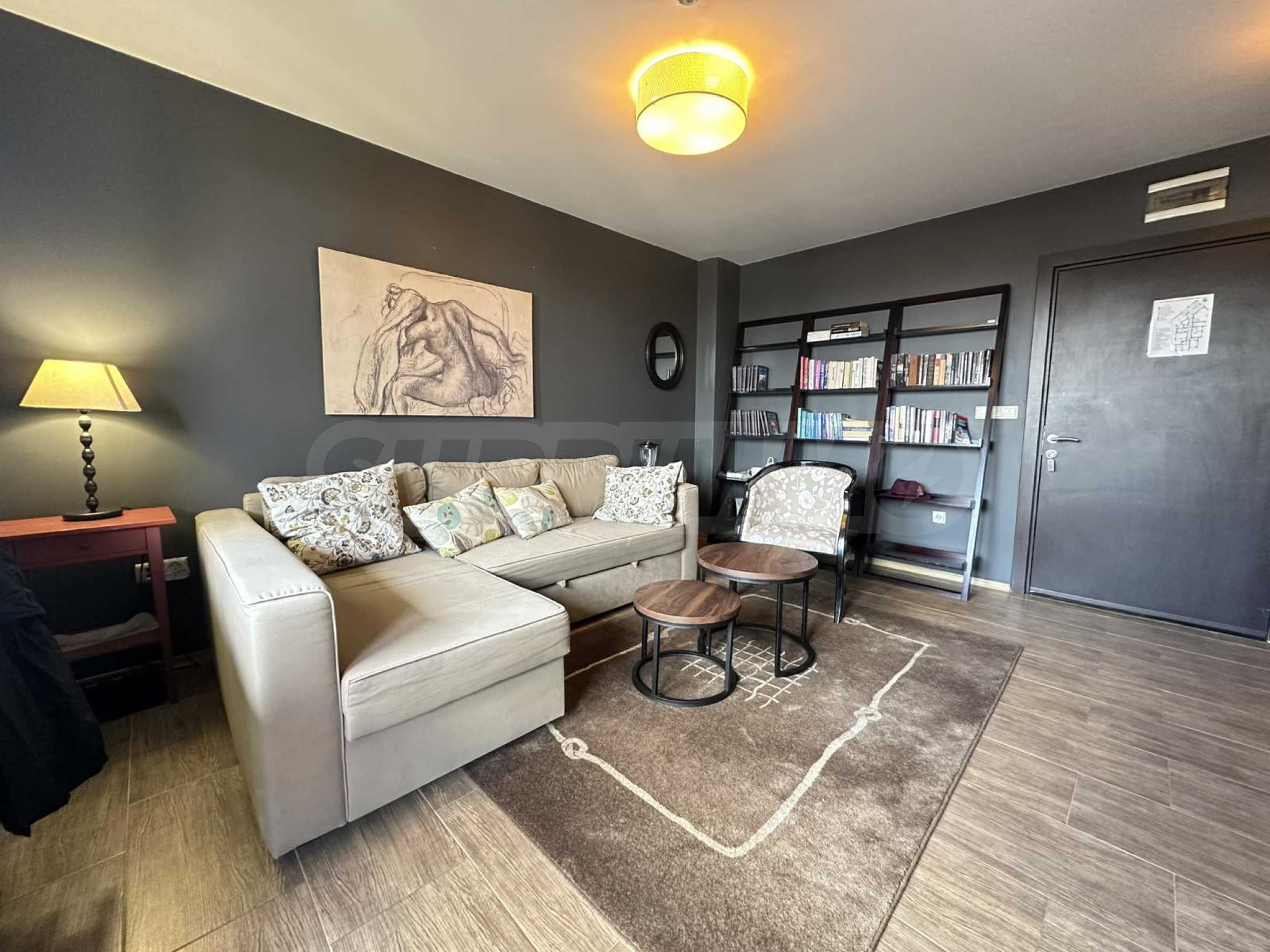 Светла и уютна дневна зона с ъглов диван, холна маса и телевизор, с излаз към балкон, без кухня, самостоятелна спалня с гардероб, както и баня с душ кабина и тоалетна