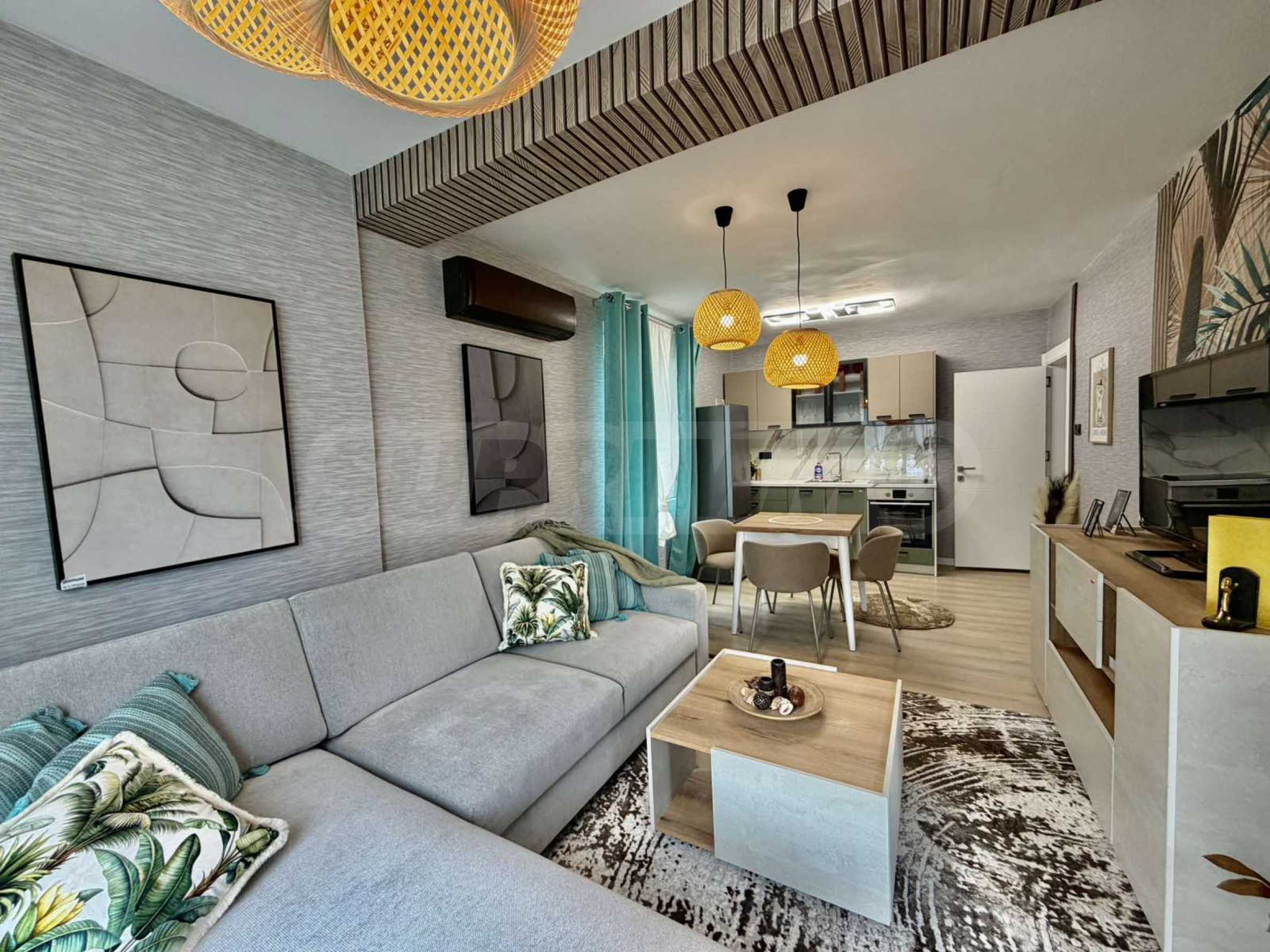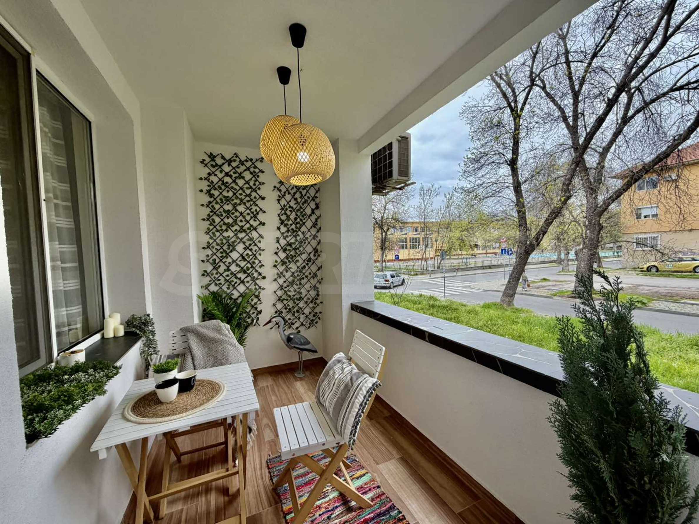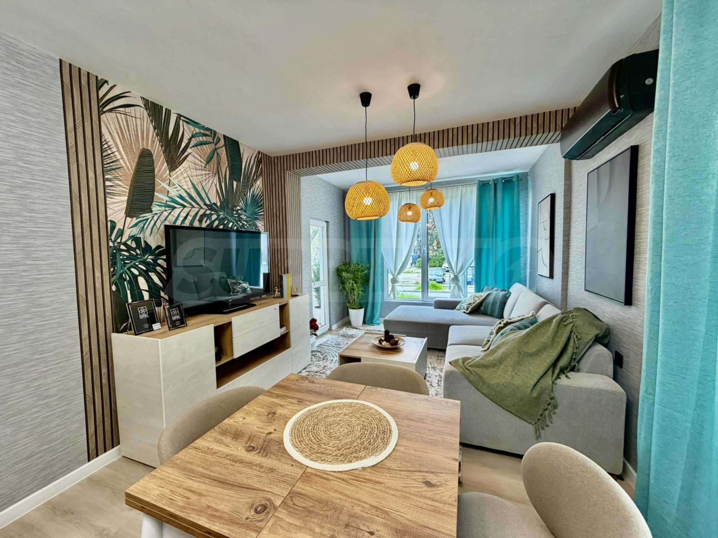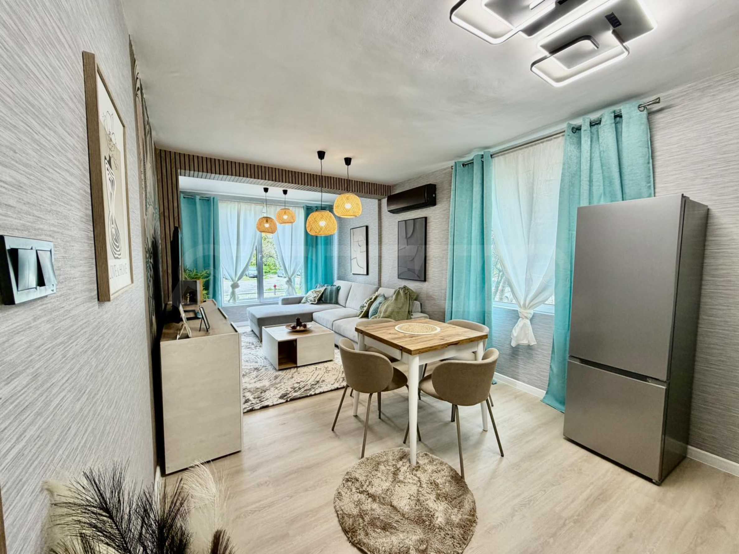 Апартаментът е след основен ремонт, с изцяло подновени ВиК и ЕЛ. инсталация. Напълно обзаведен и оборудванс всичко необходимо за живеене като мебели и ел. уреди, готов за нанасяне. Интериорът е завършен в модерен Urban Tropical стил, съчетаващ топлина, естествени материали и усещане за комфорт.