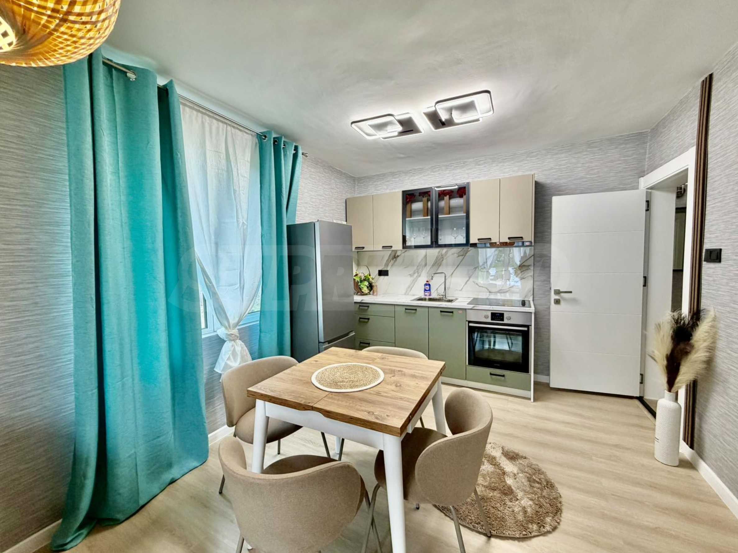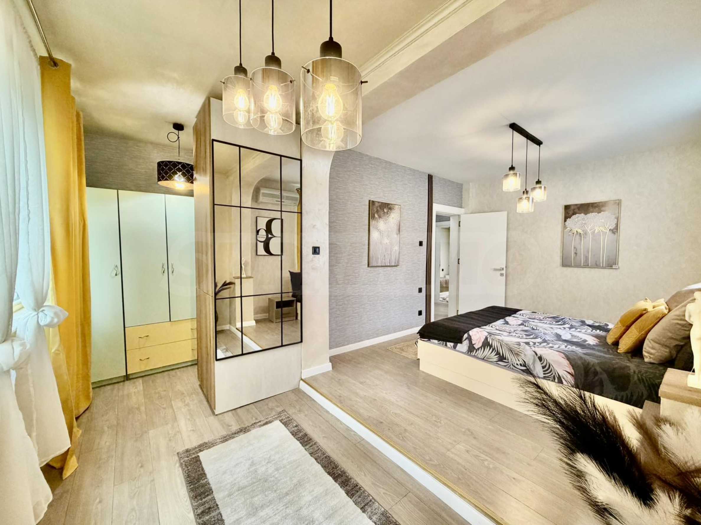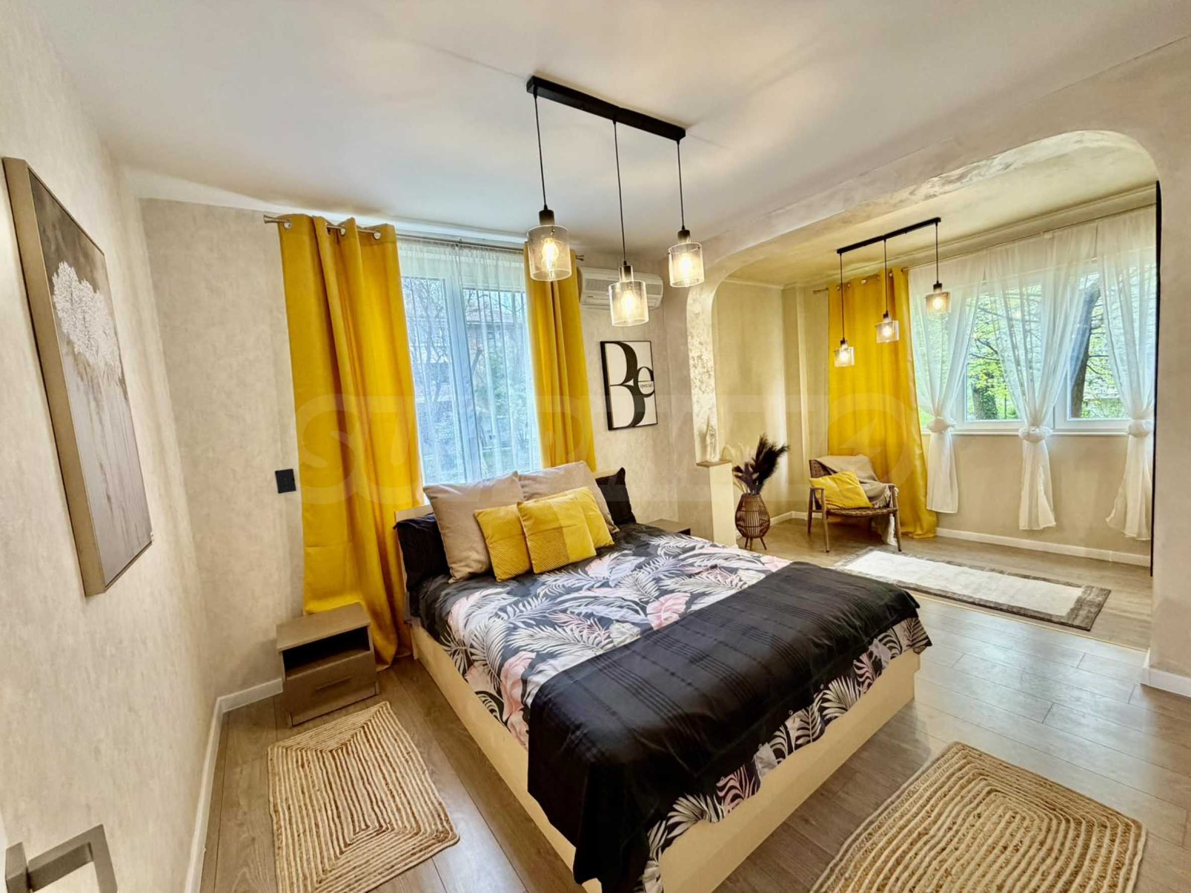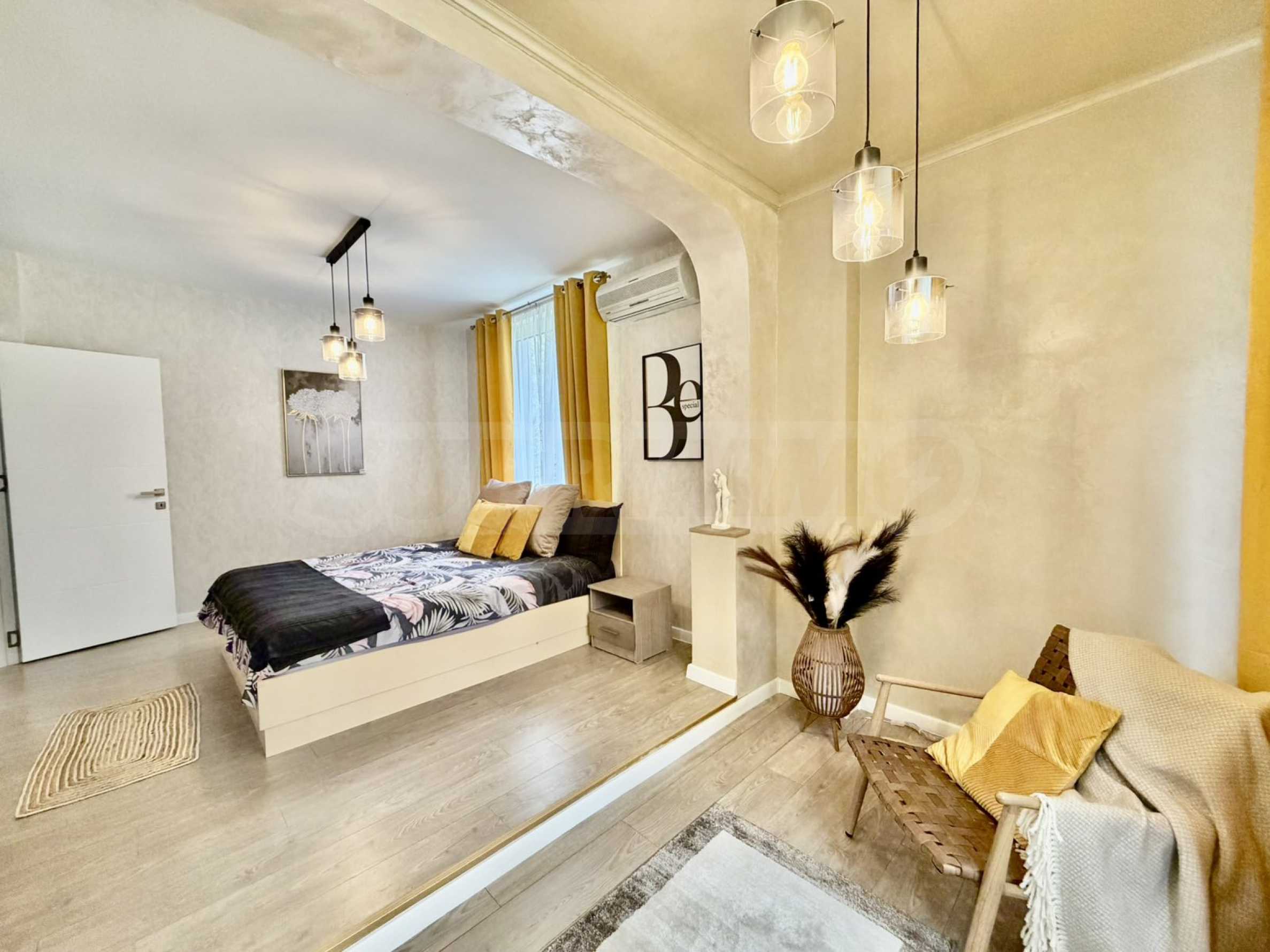 Апартаментът е след основен ремонт, с изцяло подновени ВиК и ЕЛ. инсталация. Напълно обзаведен и оборудванс всичко необходимо за живеене като мебели и ел. уреди, готов за нанасяне. Интериорът е завършен в модерен Urban Tropical стил, съчетаващ топлина, естествени материали и усещане за комфорт.