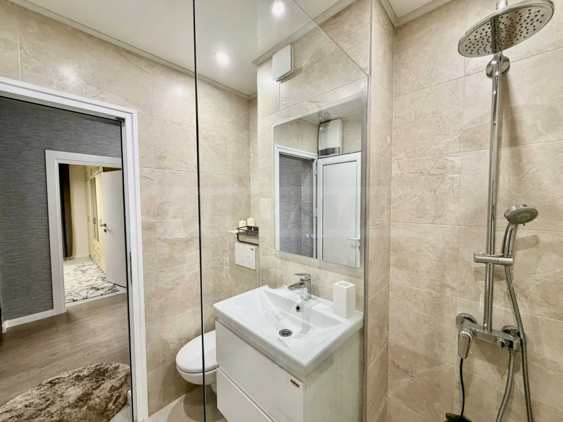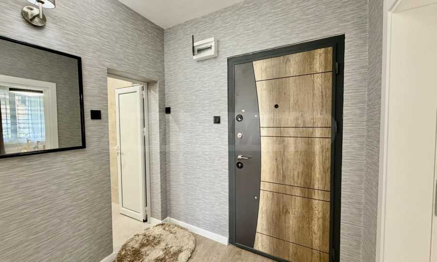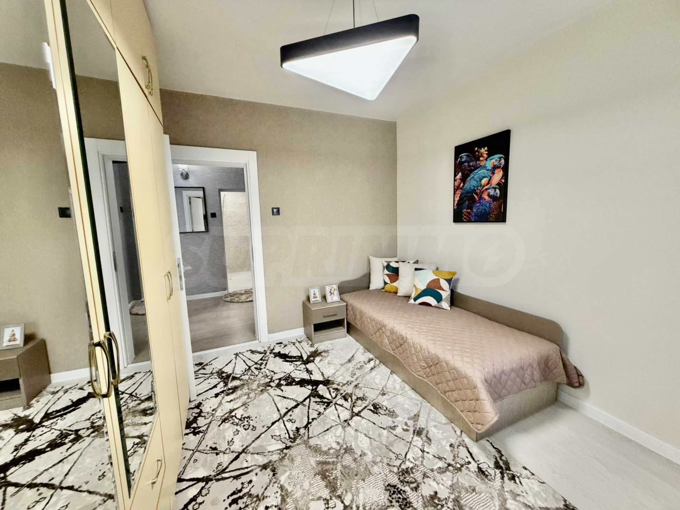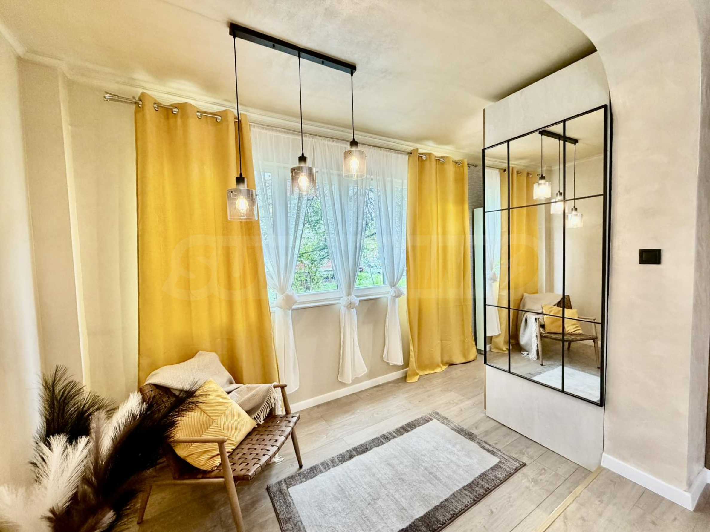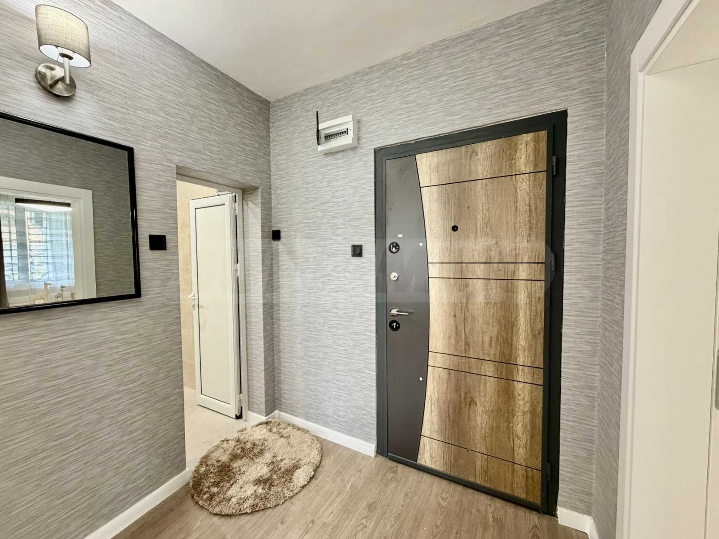 Апартаментът е след основен ремонт, с изцяло подновени ВиК и ЕЛ. инсталация. Напълно обзаведен и оборудванс всичко необходимо за живеене като мебели и ел. уреди, готов за нанасяне. Интериорът е завършен в модерен Urban Tropical стил, съчетаващ топлина, естествени материали и усещане за комфорт.