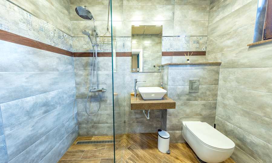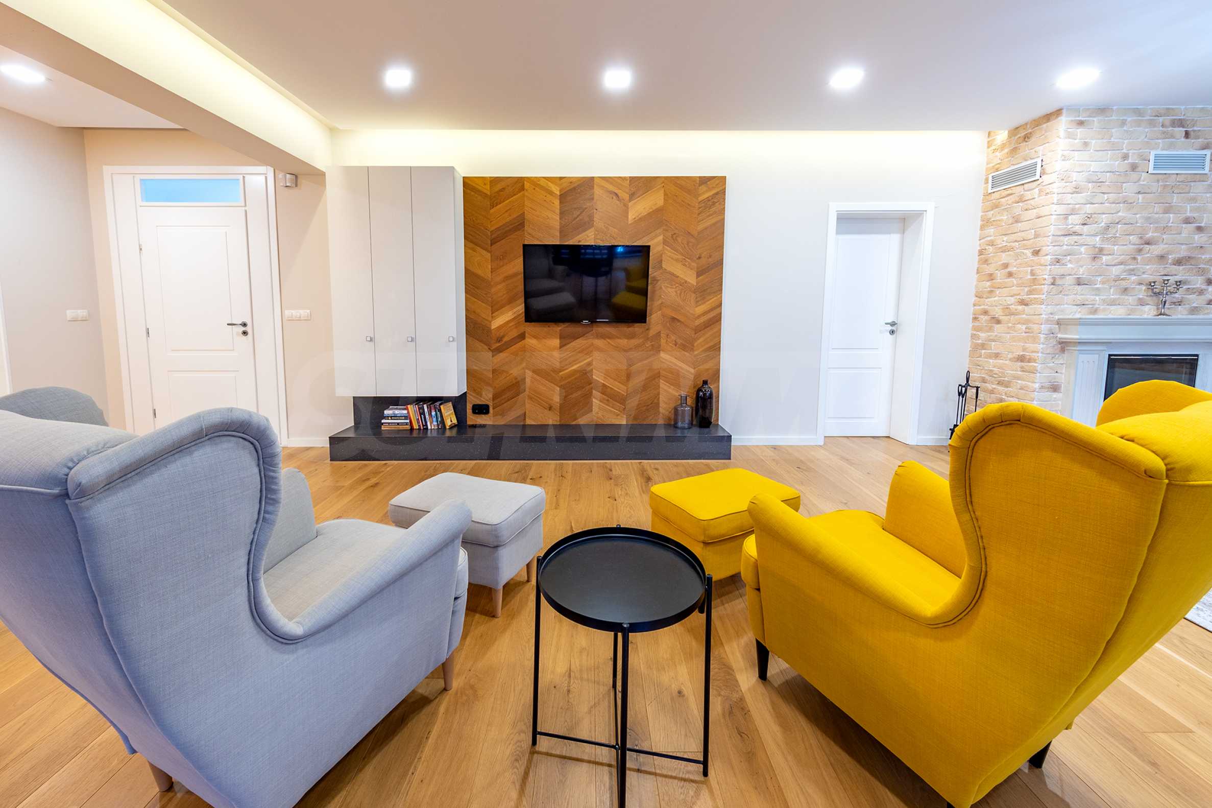 - стилен ТВ кът с фотьойли и масивна дървена ТВ стена;