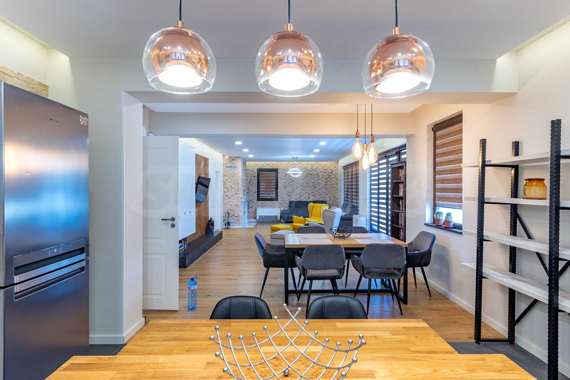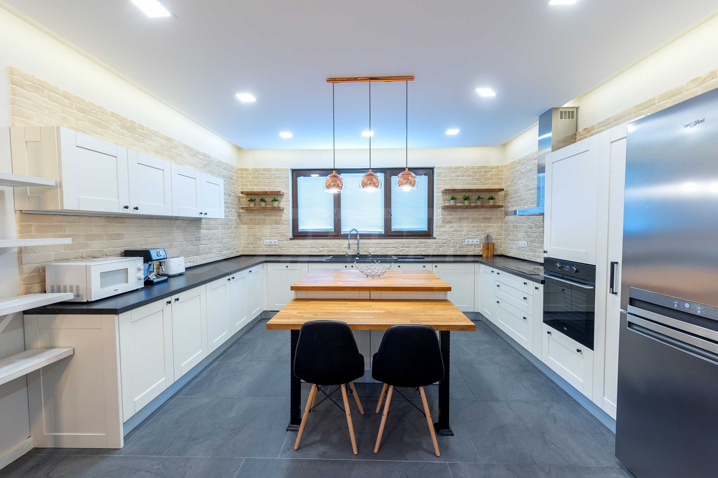 - модерна кухненска част с висок клас електроуреди, мебели от естествено дърво и кухненски остров с кът за хранене;