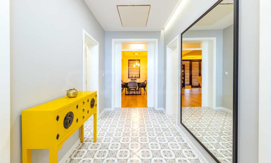 • впечатляващ дневен тракт (~80 кв.м), обособен в четири зони: