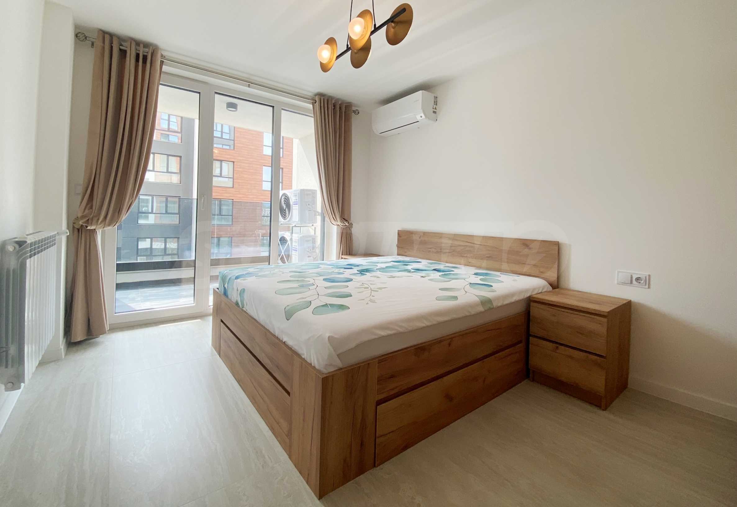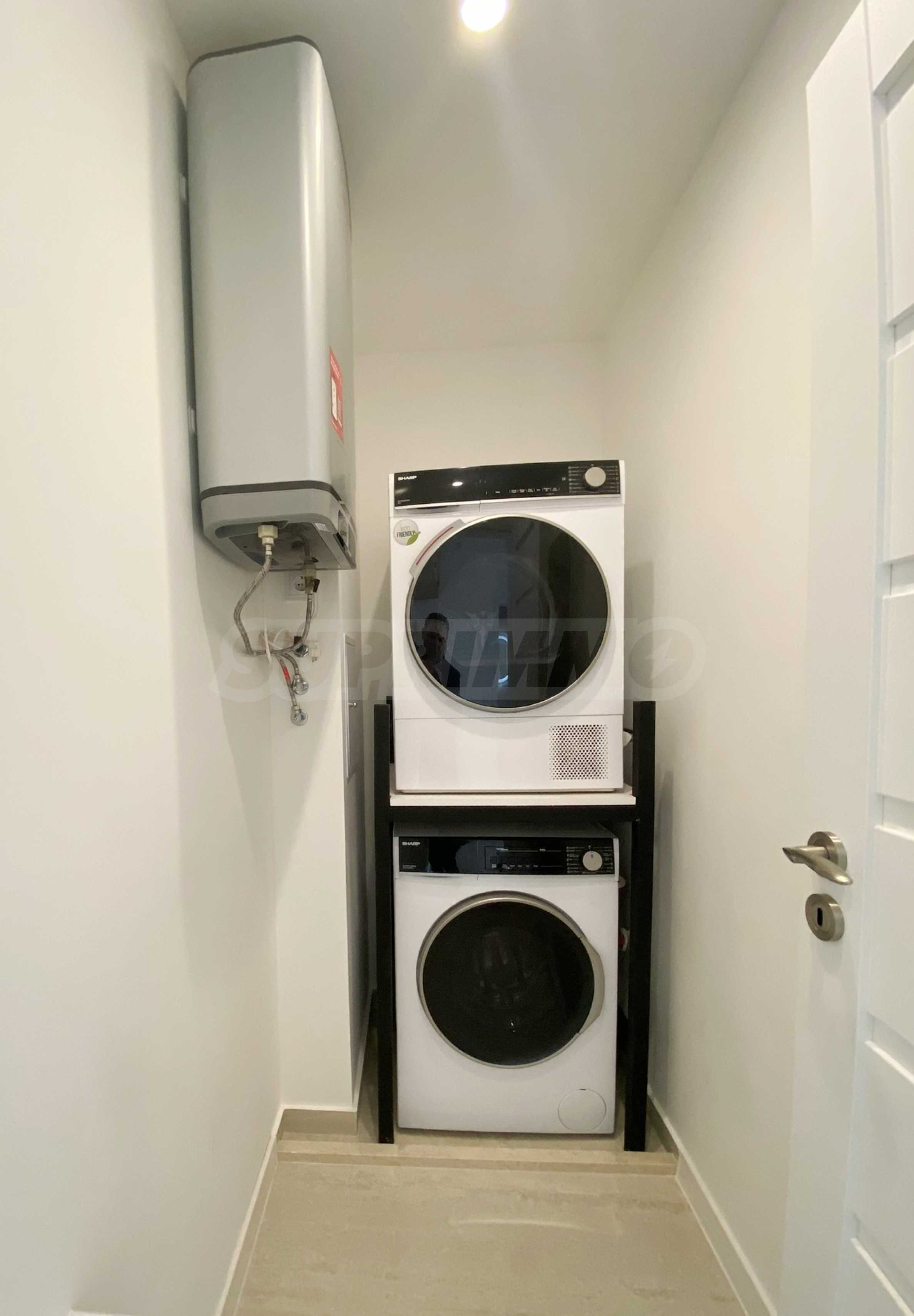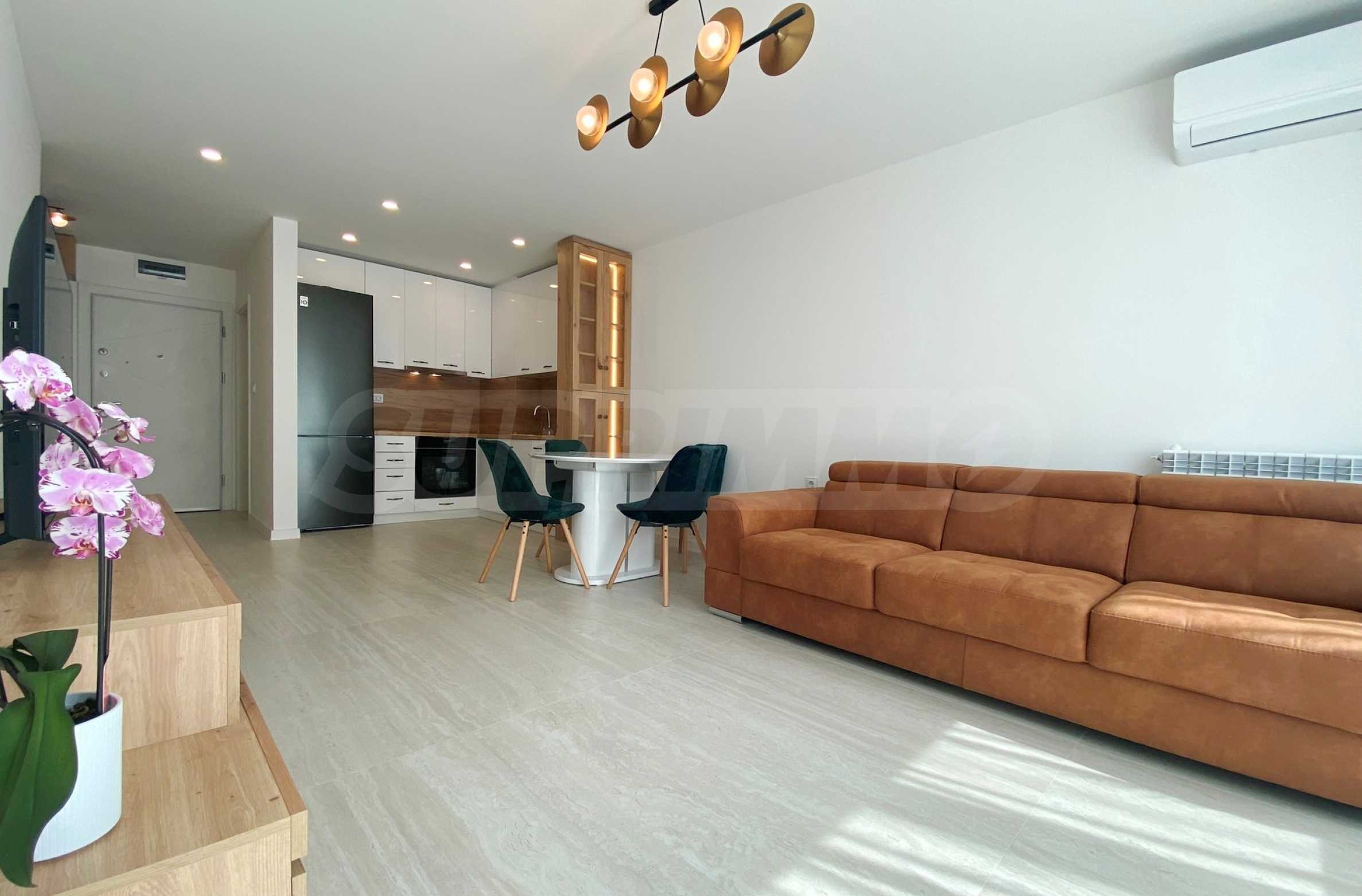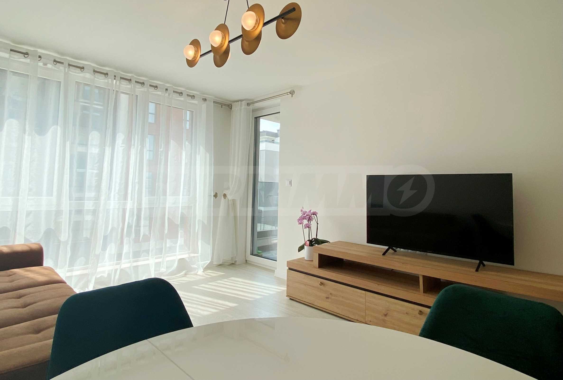 Апартаментът е много светъл и уютен, напълно обзаведен и оборудван с всичко необходимо, със стилни мебели по проект и ел. уреди в гаранция и с висок енергиен клас А+, включително съдомиялна и сушилня SHARP за дрехи. Разполага и със smart TV, както и оптичен интернет, а отоплението и охлаждането са решени с инверторни климатици BOSCH във всяка стая, включително ТЕЦ.