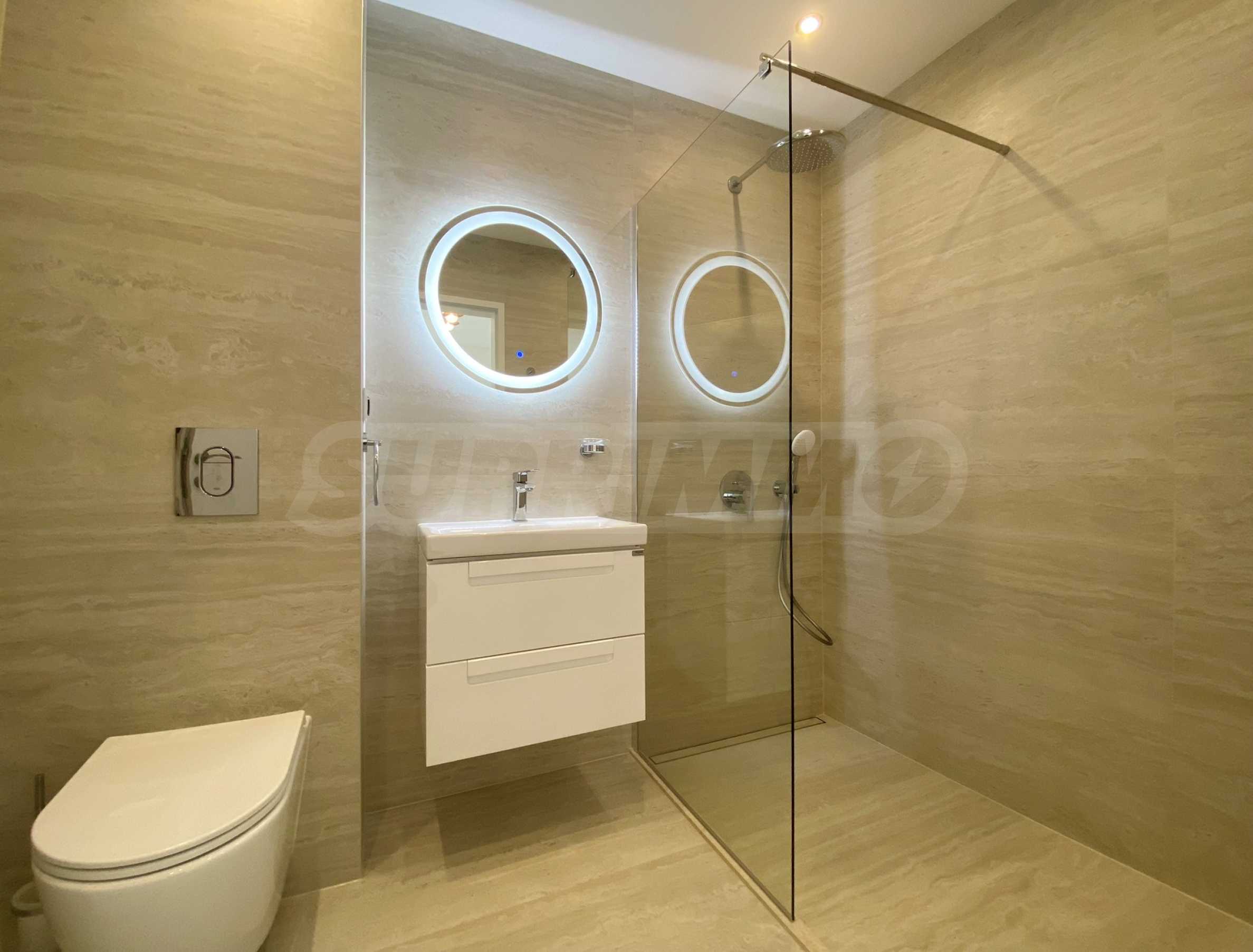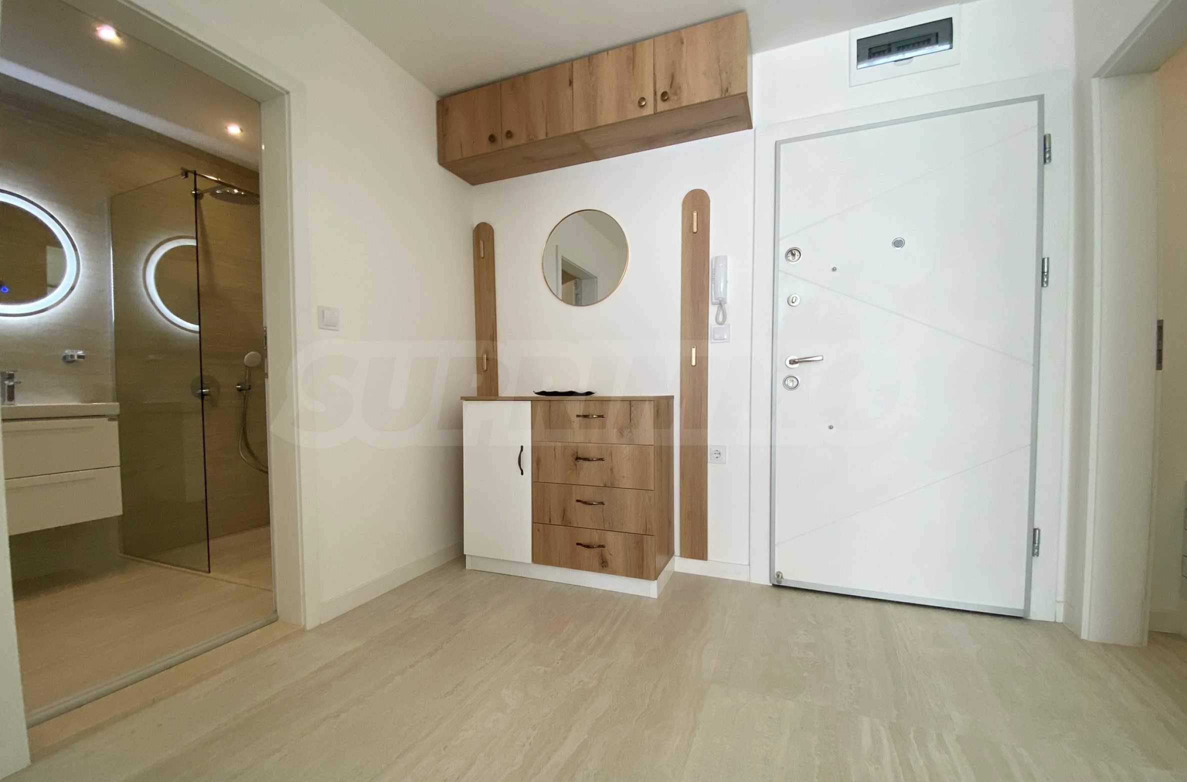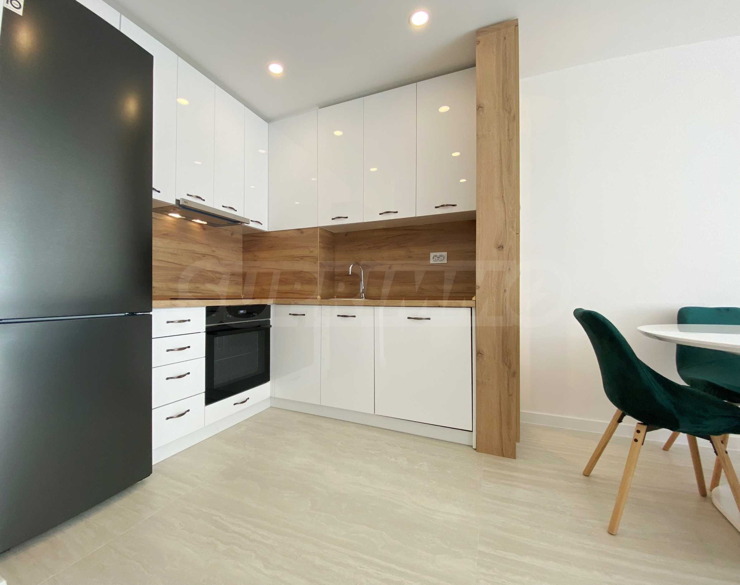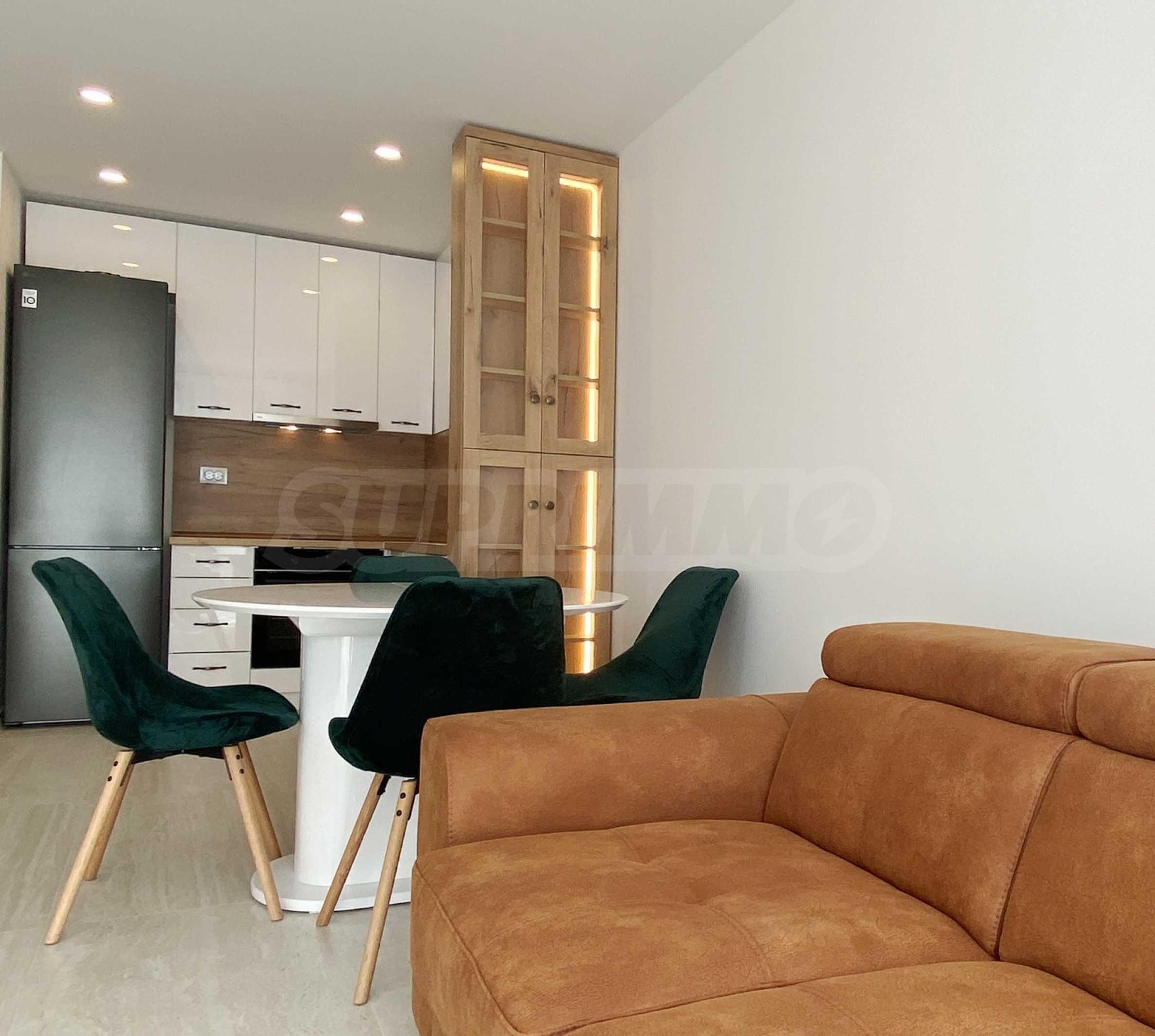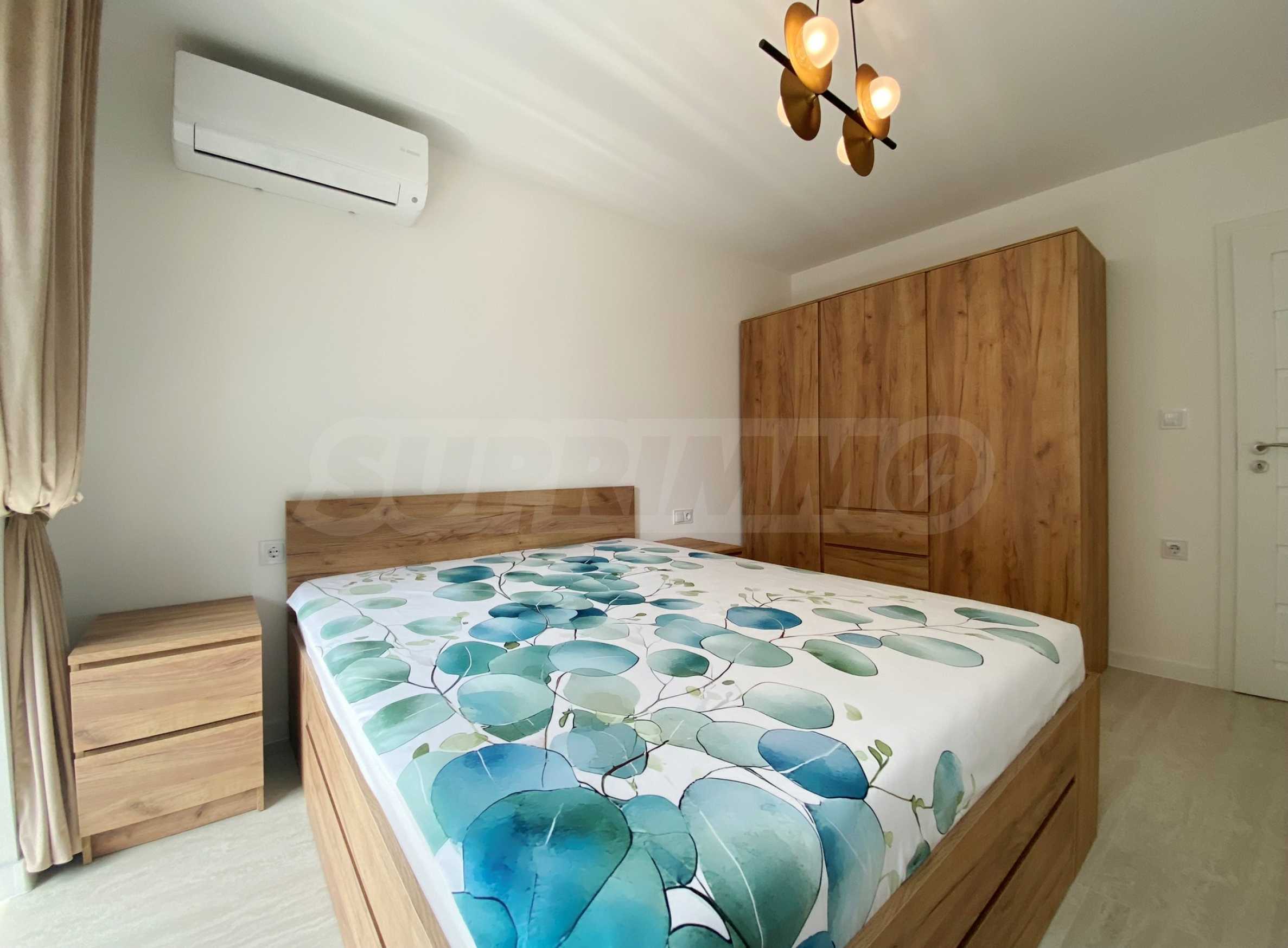Апартаментът е много светъл и уютен, напълно обзаведен и оборудван с всичко необходимо, със стилни мебели по проект и ел. уреди в гаранция и с висок енергиен клас А+, включително съдомиялна и сушилня SHARP за дрехи. Разполага и със smart TV, както и оптичен интернет, а отоплението и охлаждането са решени с инверторни климатици BOSCH във всяка стая, включително ТЕЦ.