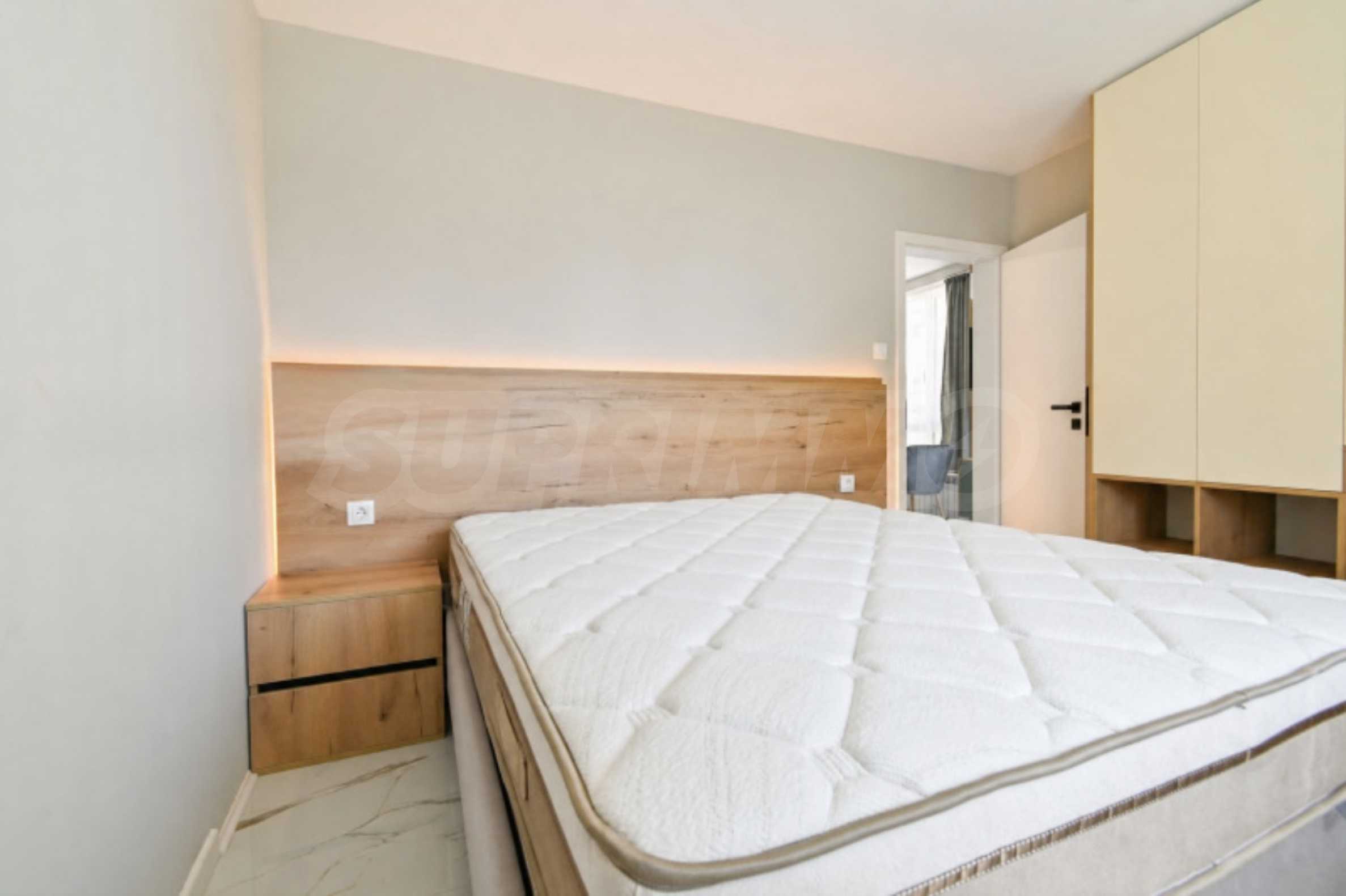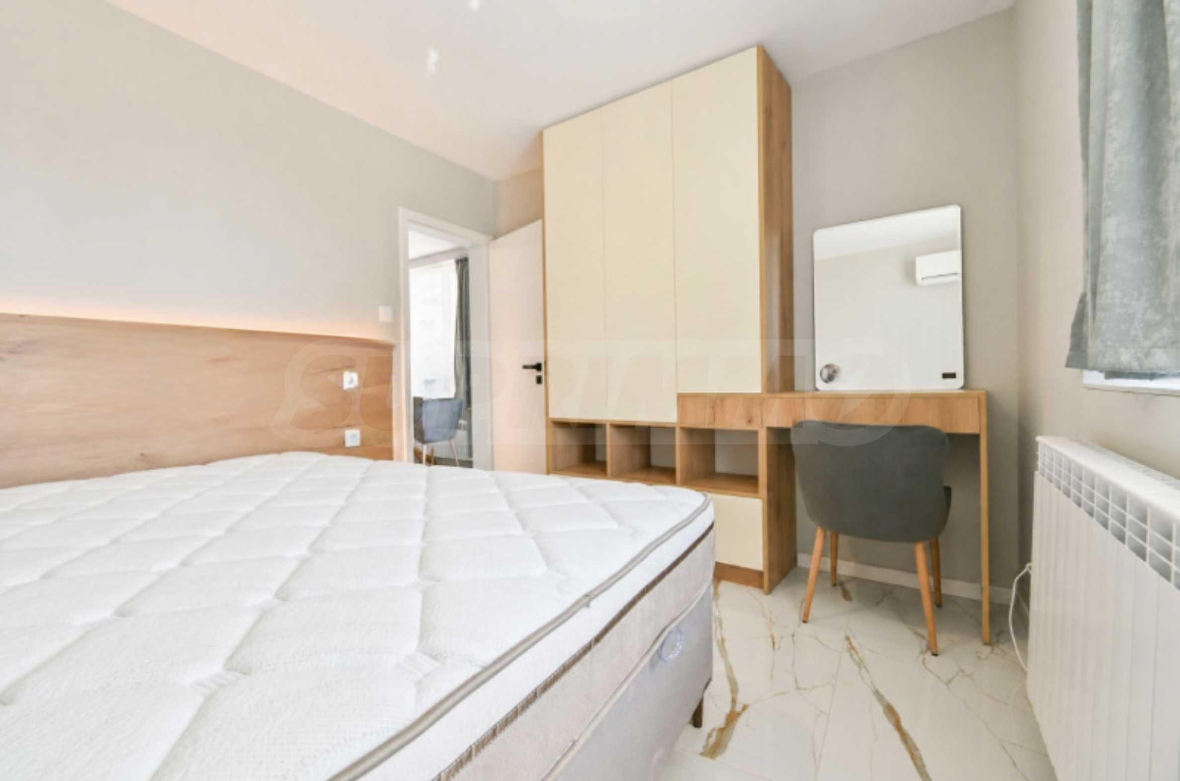 Апартаментът е обзаведен с поръчкови мебели и висок клас електроуреди - пералня, сушилня, хладилник, съдомиялна, газов котел с WiFI, телевизор, LED акцентно осветление в кухнята и над спалнята.