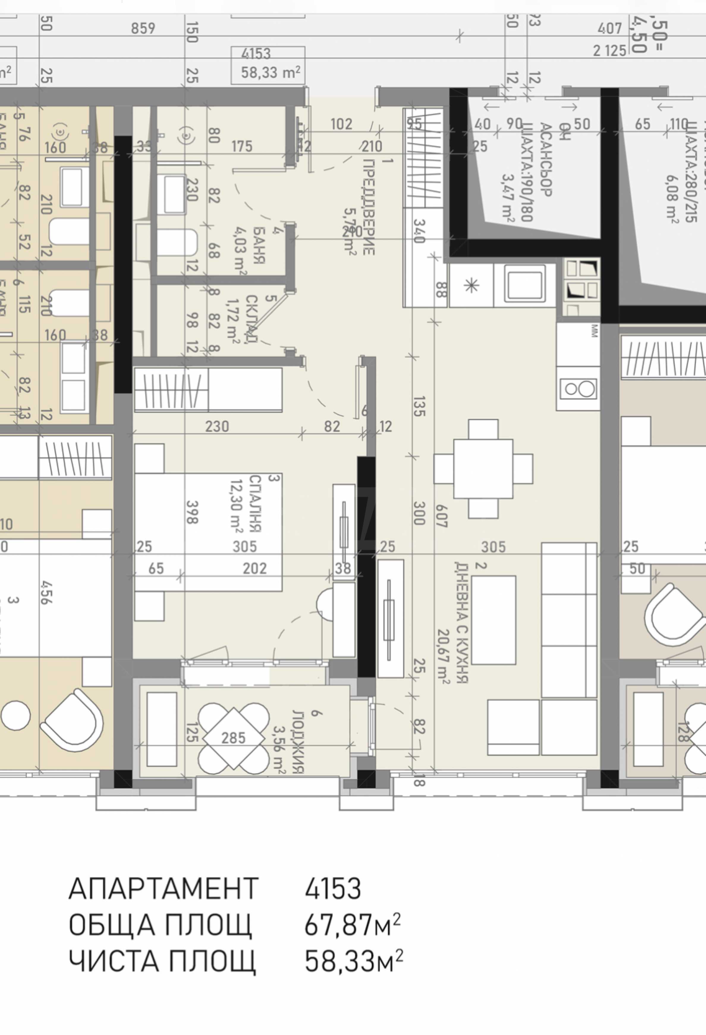 Жилището е с обща площ от 67.87 кв.м и чиста площ от 58.33 кв.м, разположено на 15-и етаж от общо 17, с североизточно изложение. Апартаментът се предлага по БДС, което дава възможност на бъдещия собственик да го завърши и обзаведе изцяло според своя стил и предпочитания.