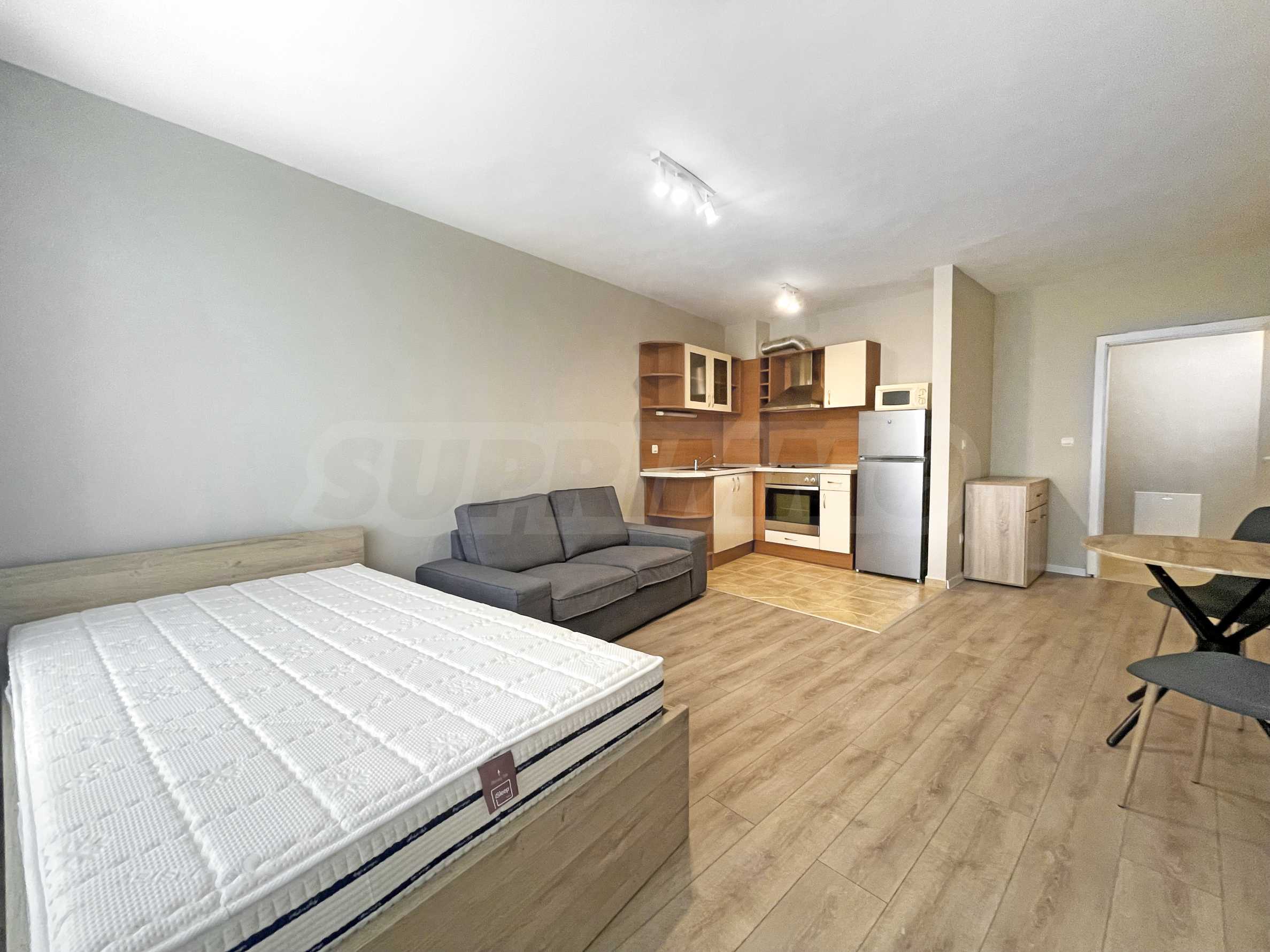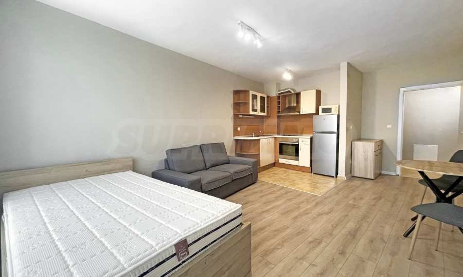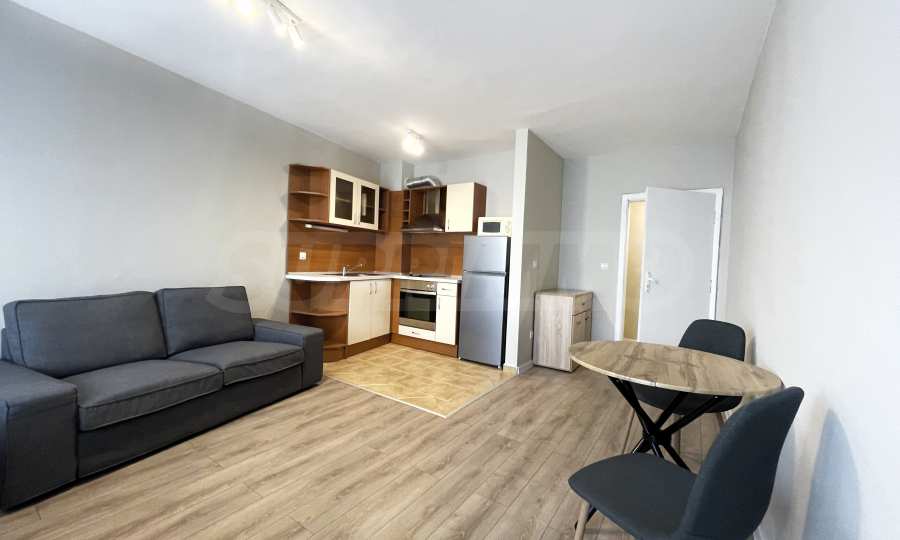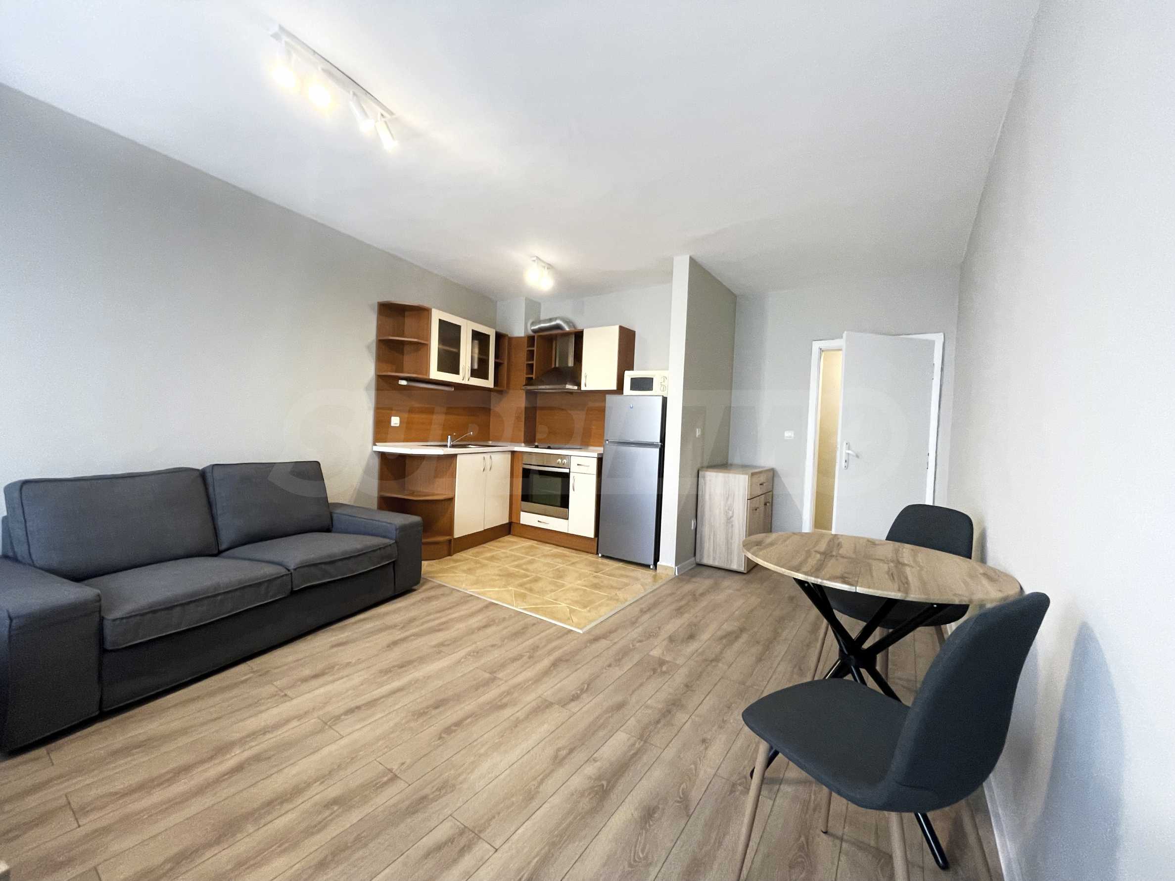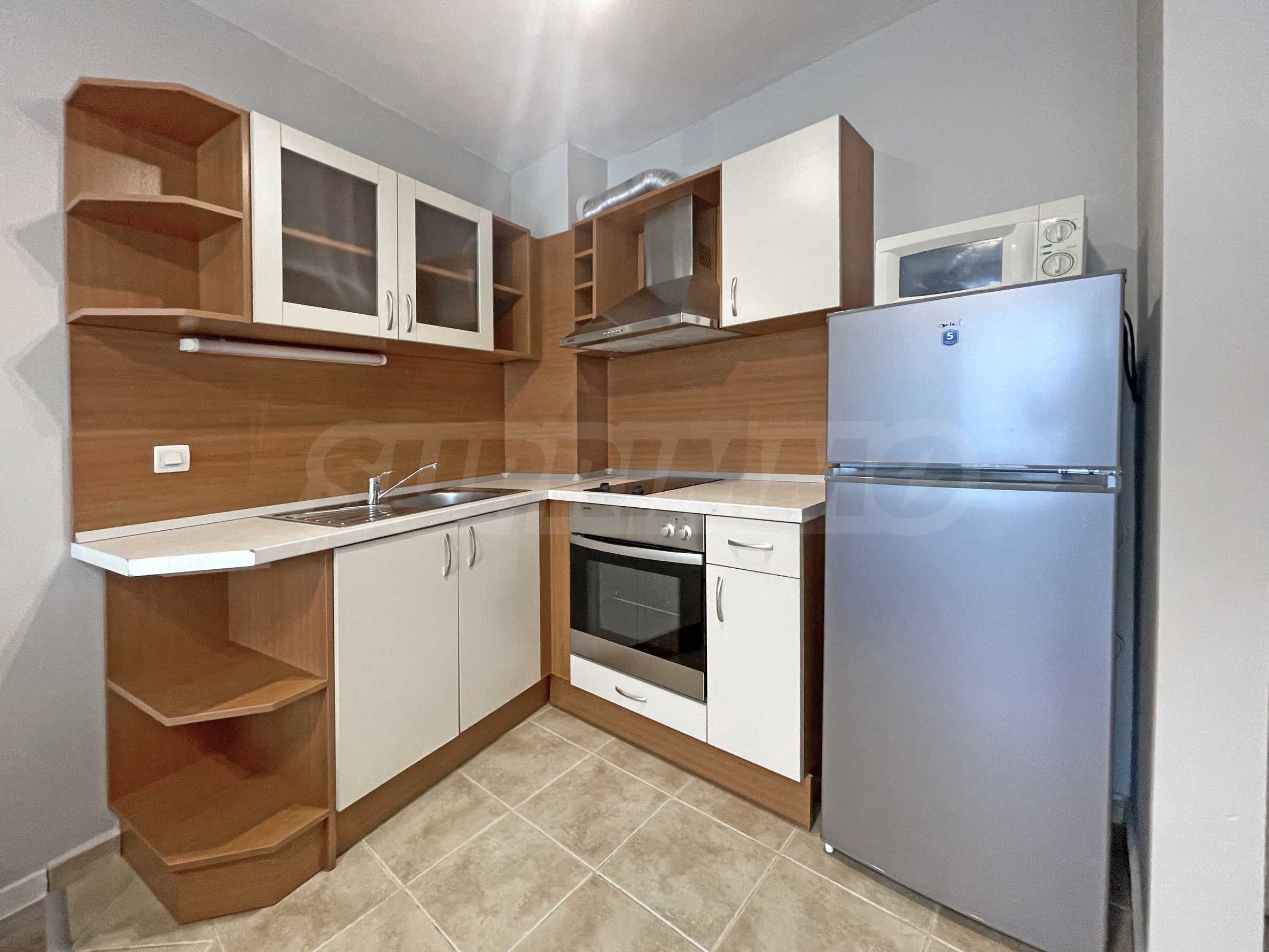 Обзавеждането включва кухненски шкафове, фурна, стъклокерамичен плот, аспиратор, хладилник, спалня, диван, маса за хранене с 2 стола, удобна гардеробна.