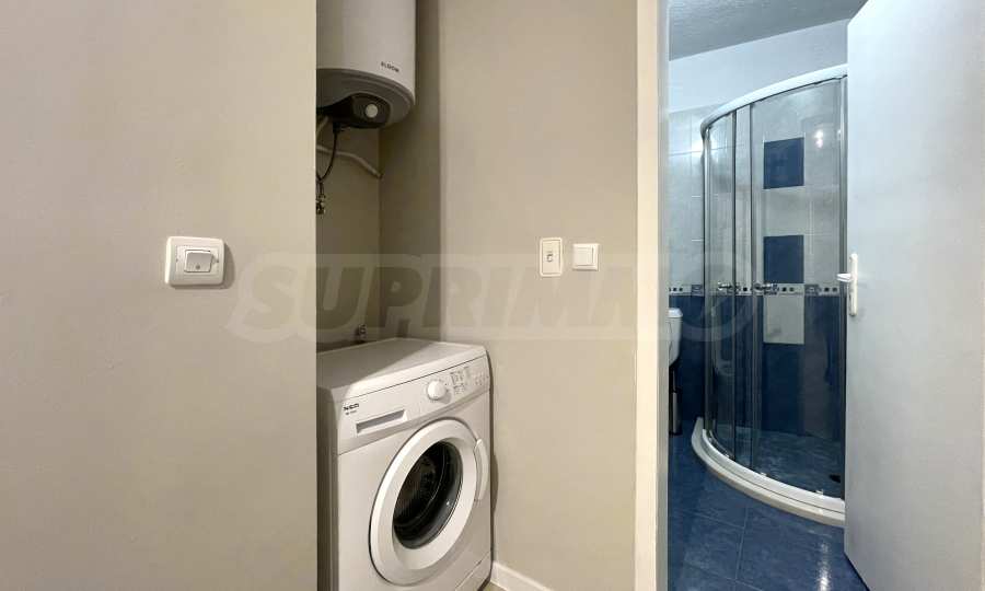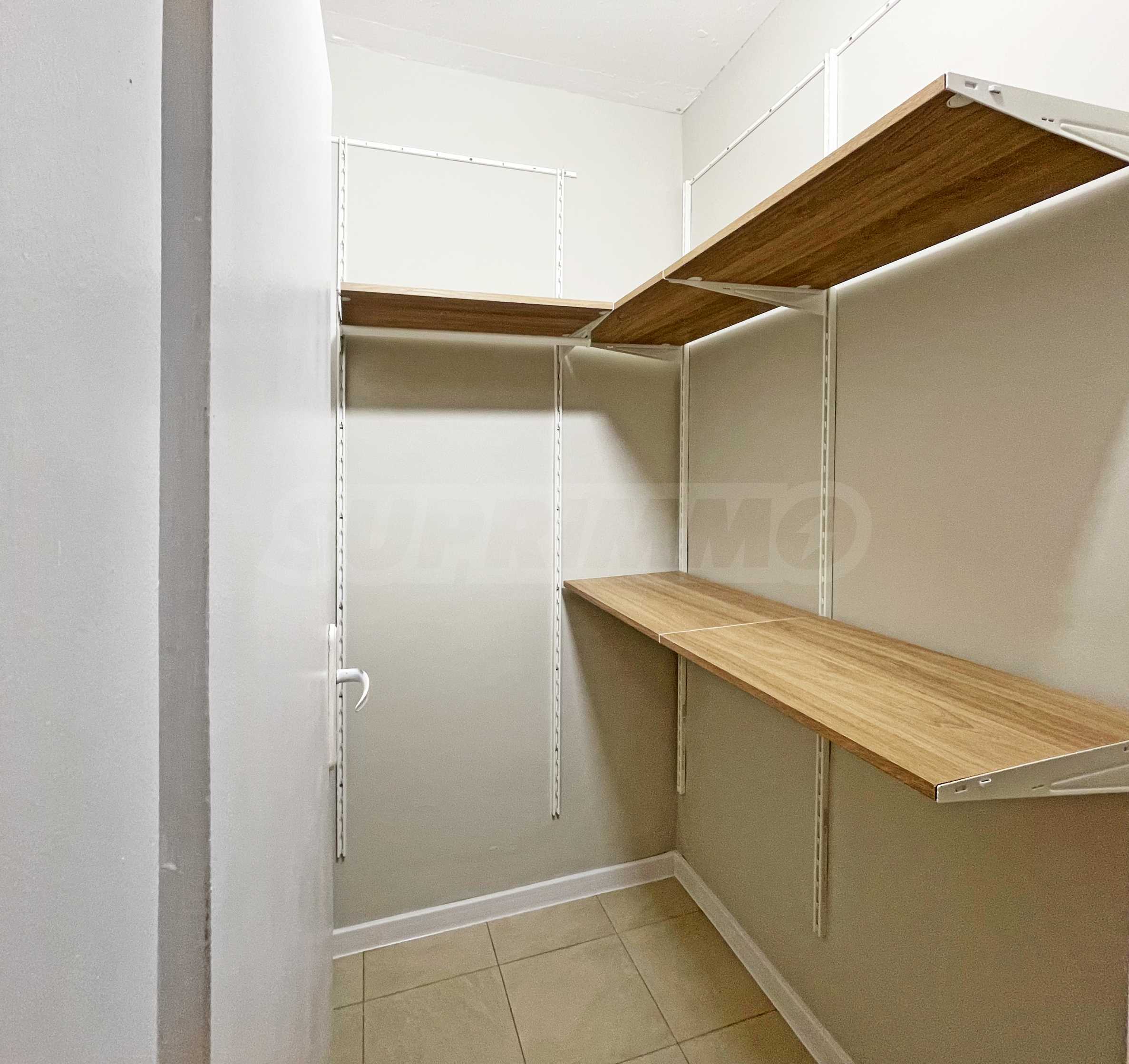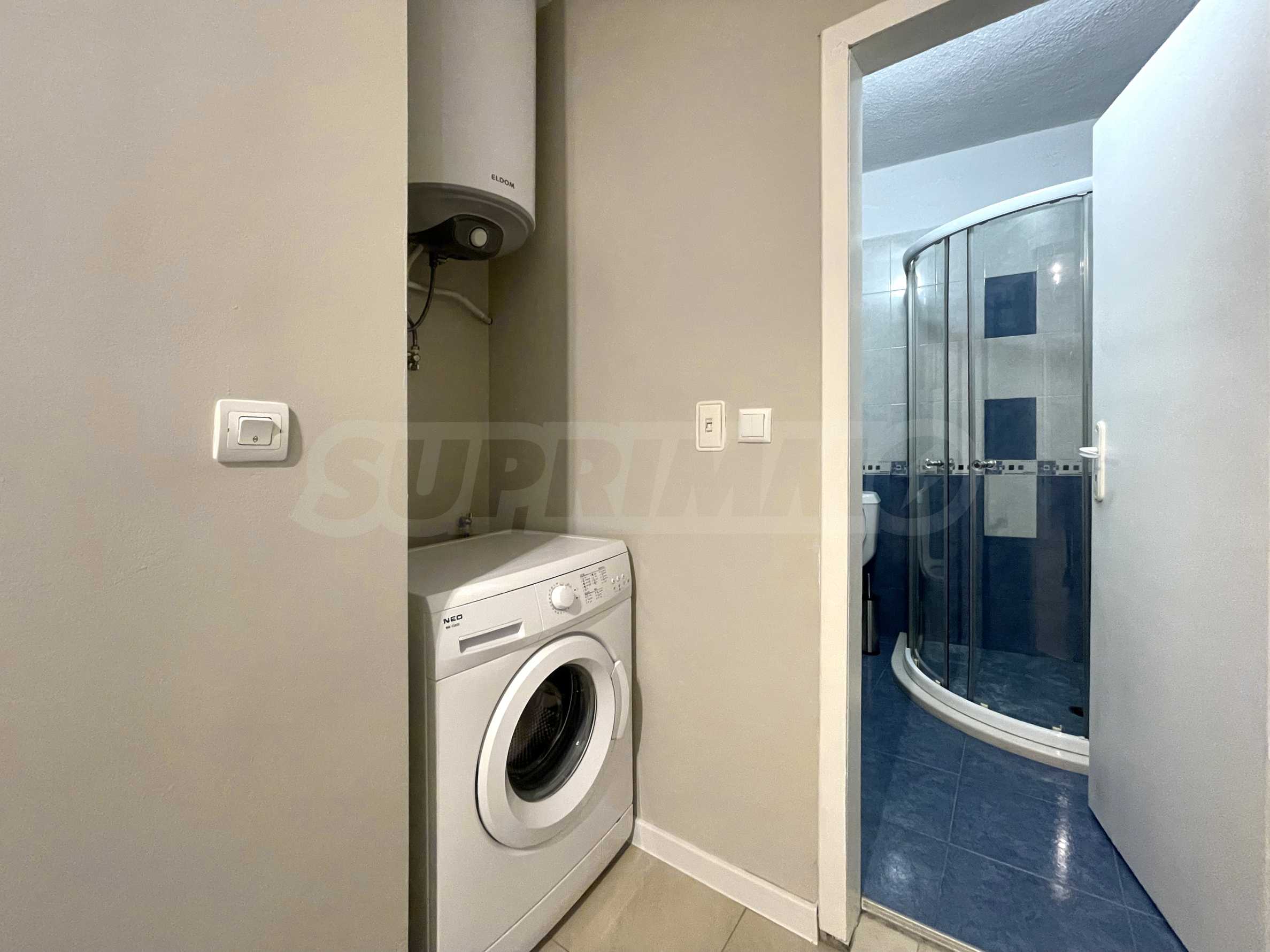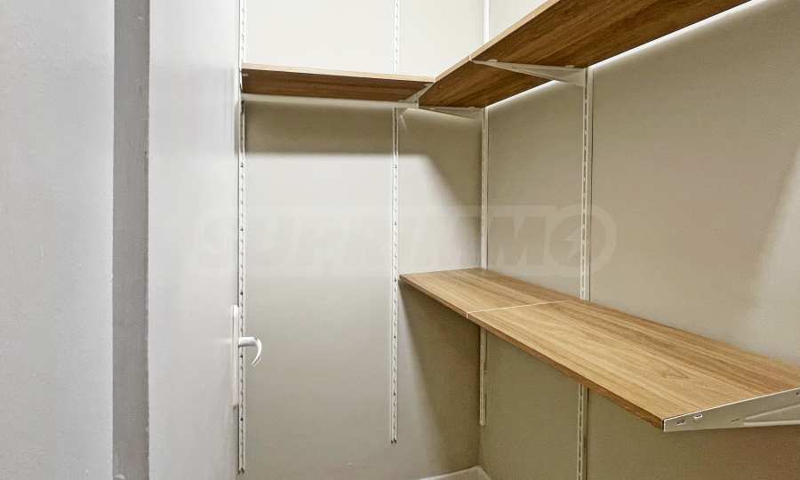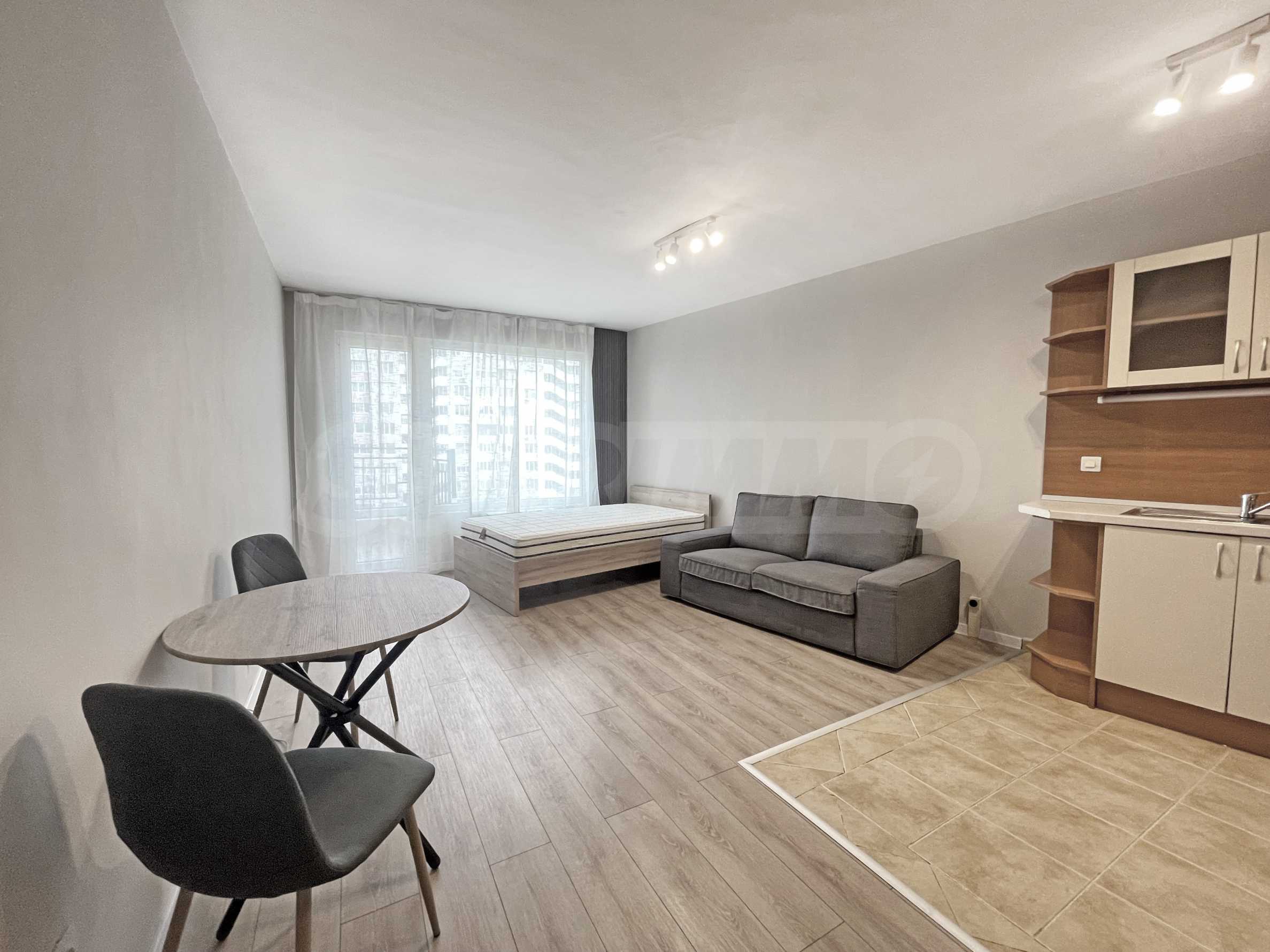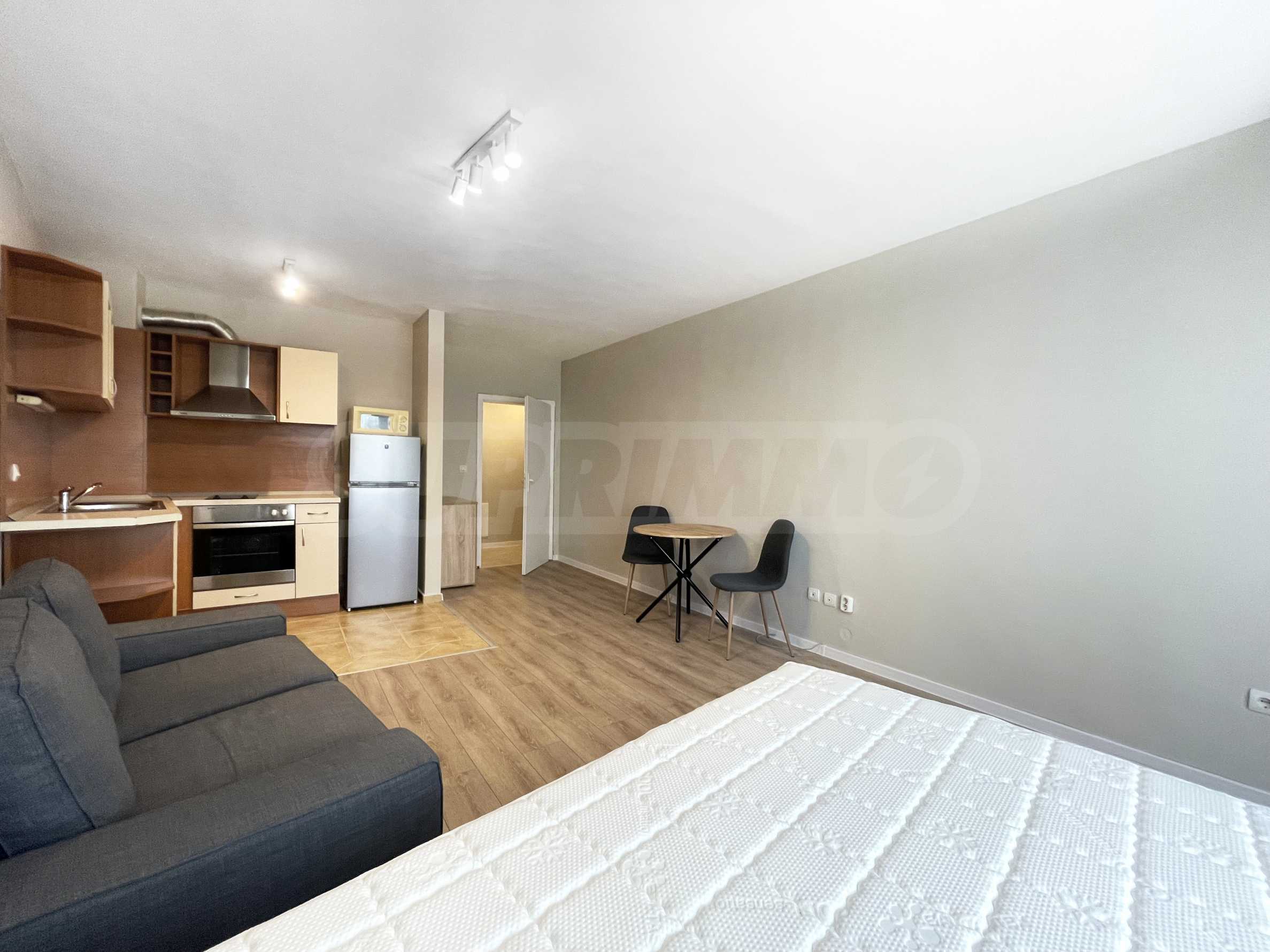 Обзавеждането включва кухненски шкафове, фурна, стъклокерамичен плот, аспиратор, хладилник, спалня, диван, маса за хранене с 2 стола, удобна гардеробна.