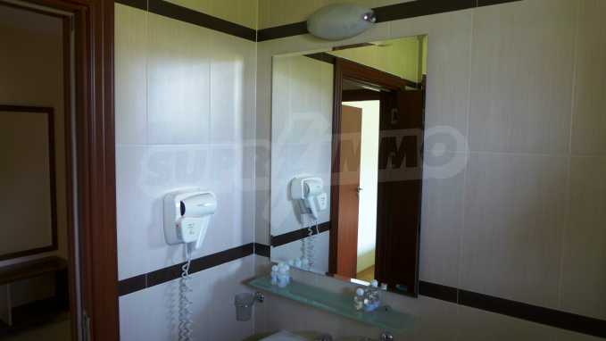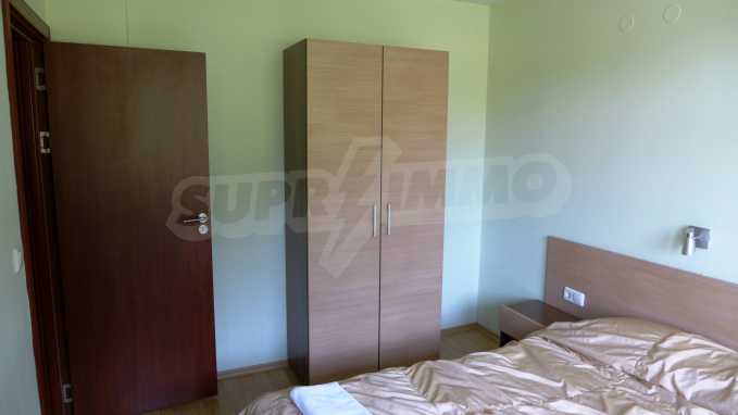 Кухнята е напълно обзаведена и оборудвана с фурна, двоен котлон, абсорбатор, микровълнова печка, мивка, хладилник, кана, тостер. Холът е с двоен разтегателен диван, табуретка, холна маса, телевизор, DVD плейър, поставка за телевизор, маса за хранене, 3 трапезарни столове, двукрилен гардероб, пердета. Първата спалня разполага с двойно легло, 2xнощни шкафчета, двукрилен гардероб, тоалетка с огледало и огледало, телевизор, завеси. В друга спалня има 2 единични легла, 2 нощни шкафчета, тоалетка с огледало, завеси. В първата баня има тоалетна, мивка, огледало. В другата банята има тоалетна, душ кабина с екран, мивка, огледало. Има две тераси, едната с изглед към басейна с южно изложение и другата с гледка към гората със северно изложение.