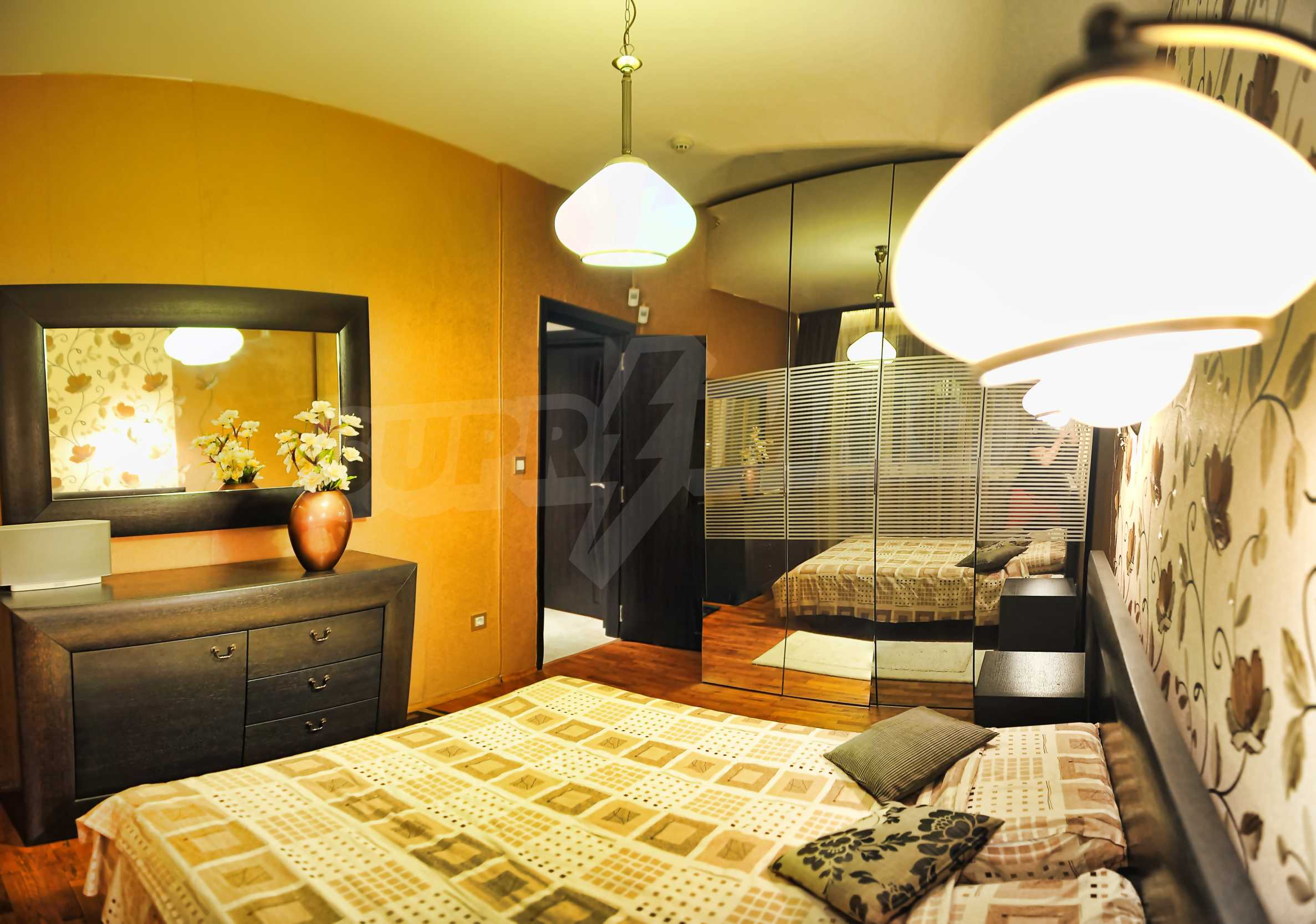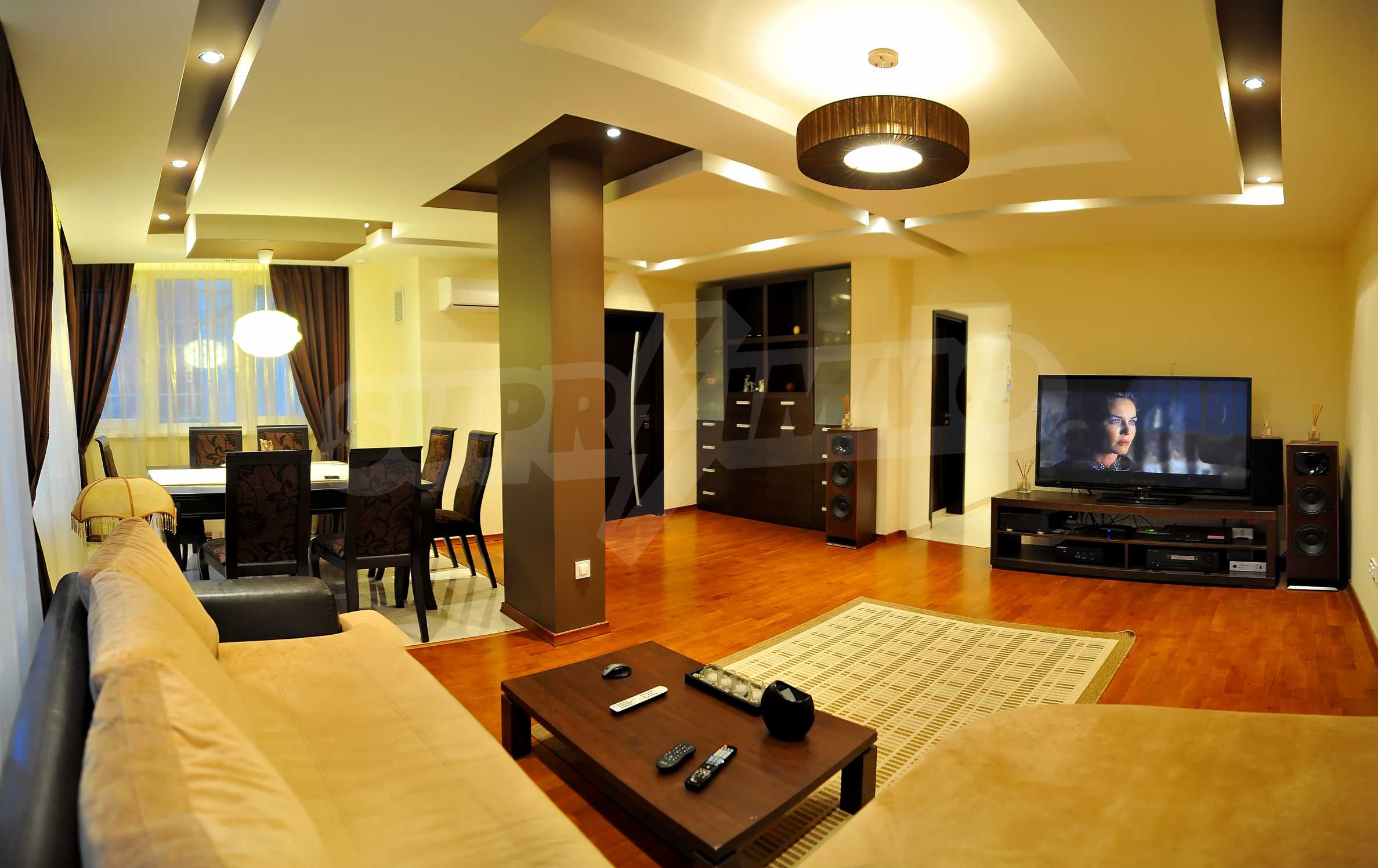 Многостайният апартамент е с южно, западно и северно изложение, разположен е на 1/8 етаж и заема обща площ от 165 кв.м. Имотът е просторен и светъл. Разпределението включва: