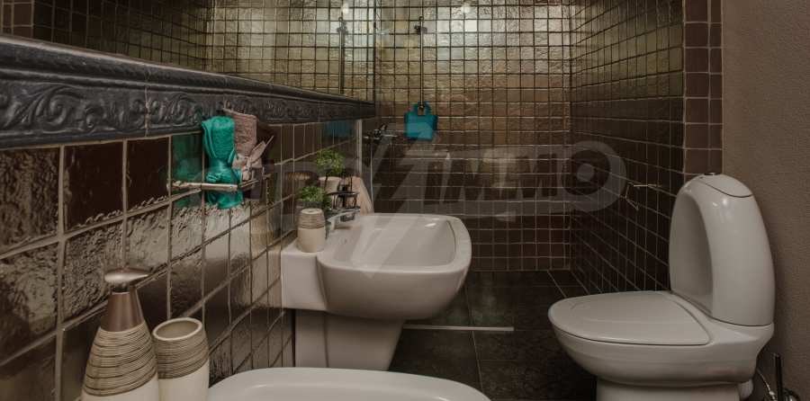 • Баня и тоалетна: интериорни врати водонепроницаеми; полу - секретна ключалка; напълно покрити с керамични плочки, на светли цветове; таваните са боядисани с водоустойчива бяла боя латекс;