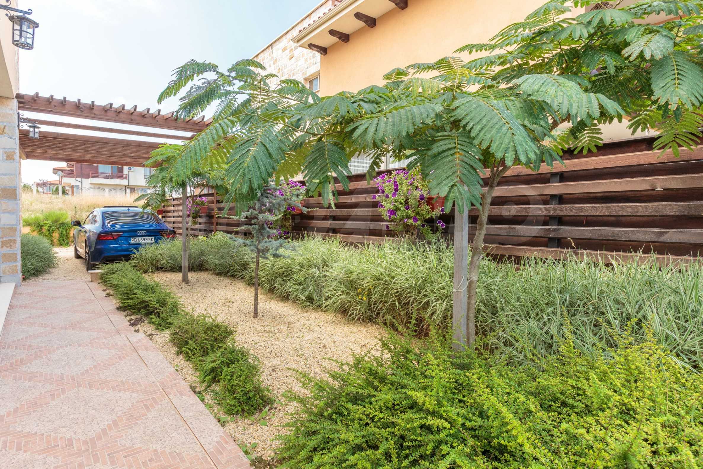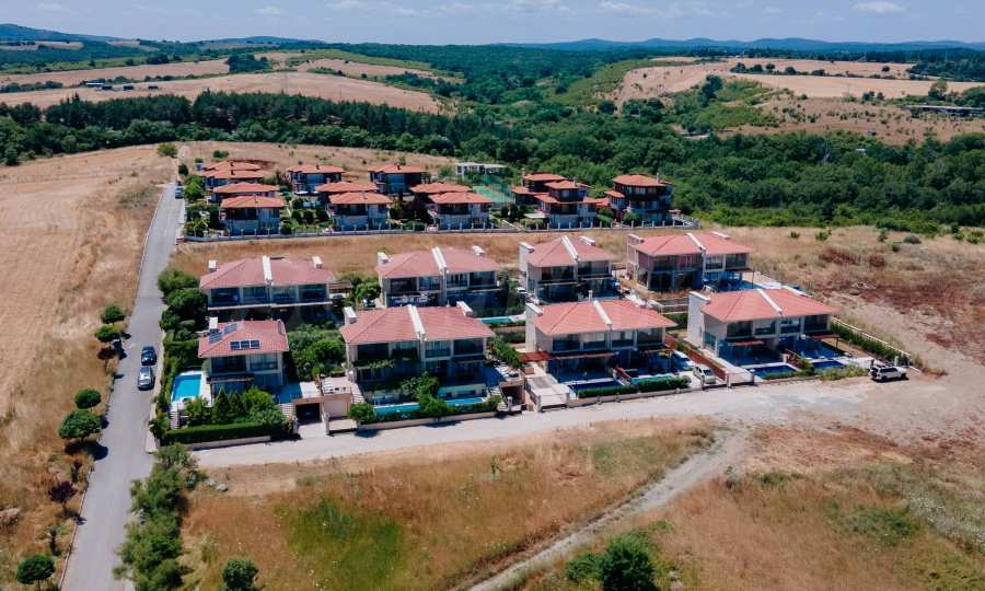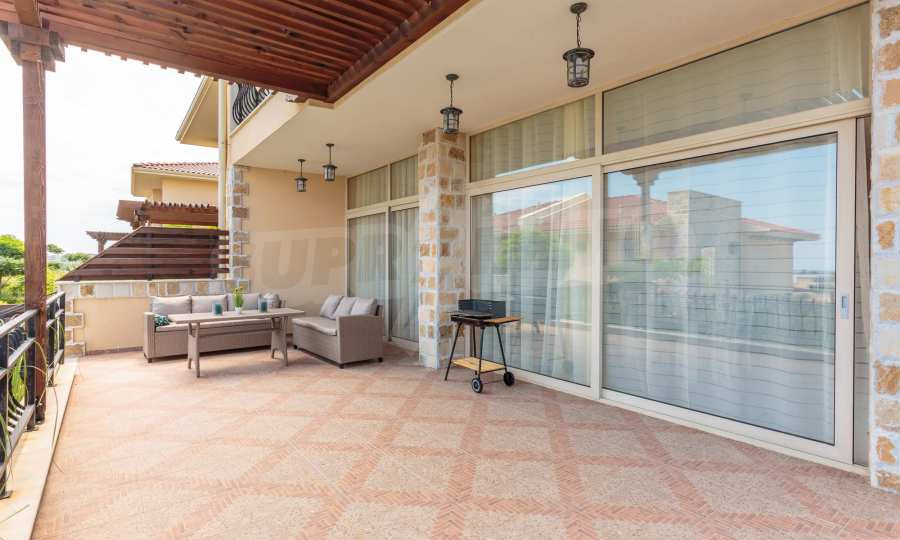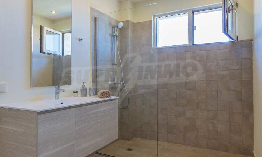 - Втори етаж: 3 спални, всяка със самостоятелна баня, коридор и обща тераса към две от спалните.