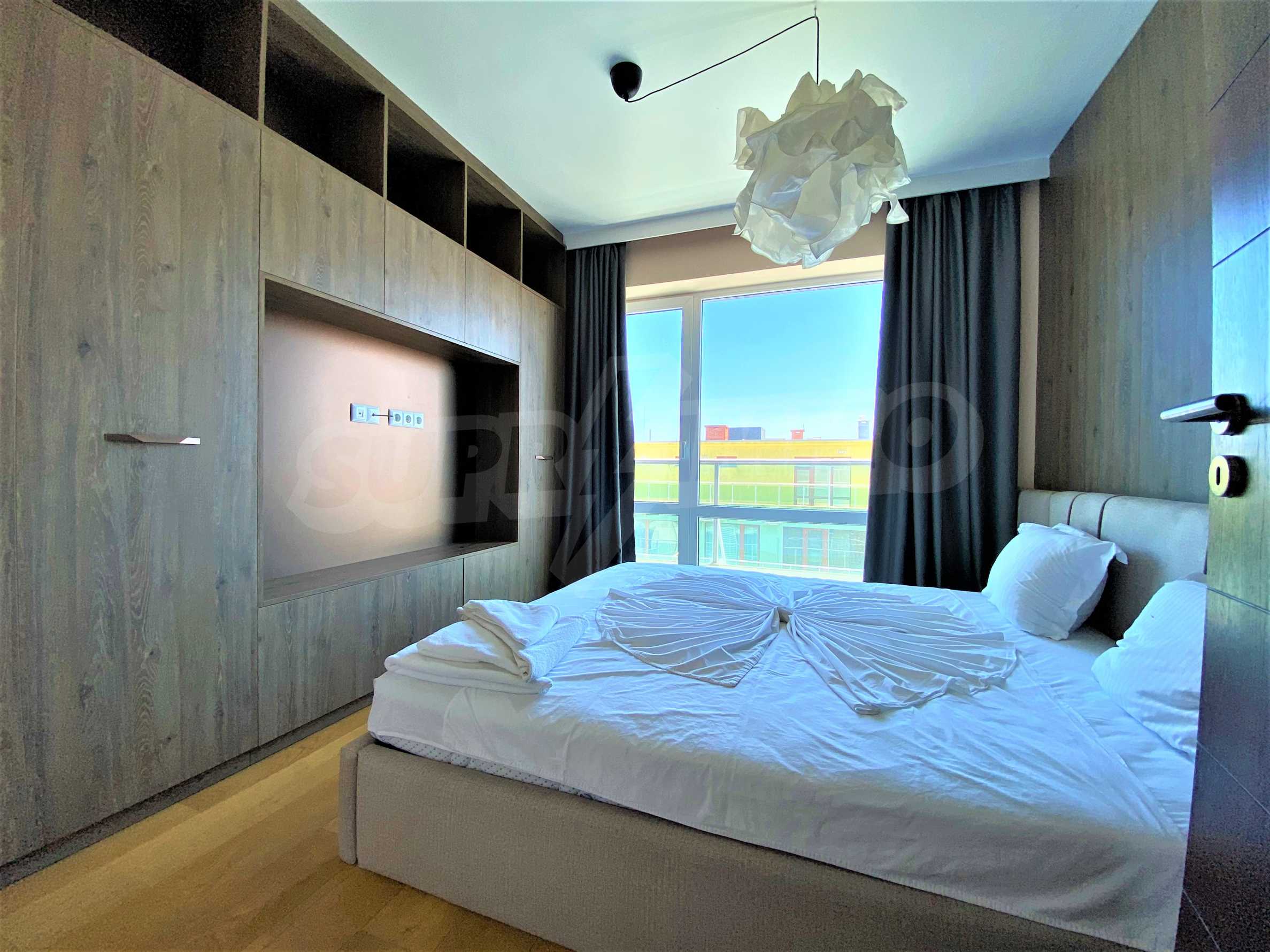 Апартаментът е с обща площ от 122.09 кв.м, от които чистата площ е 103.72 кв.м, състои се от дневна с кухня, две спални, голяма баня с тоалетна, тераси с гледки към морето.