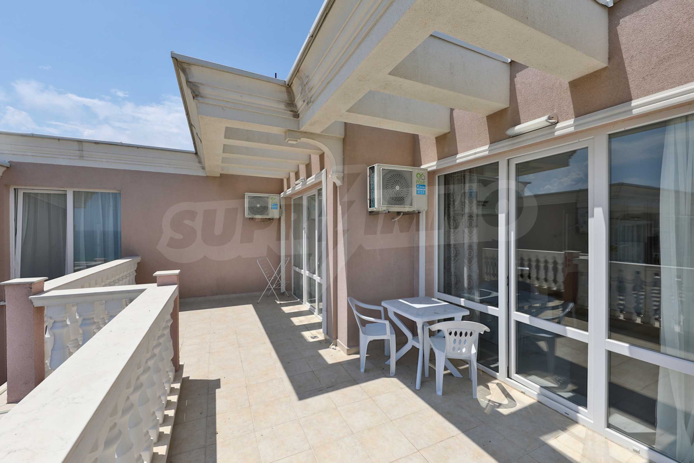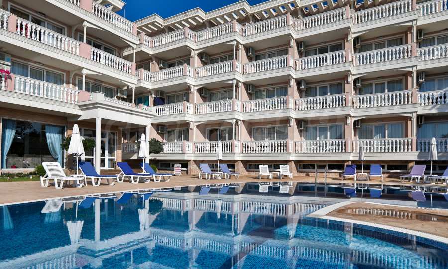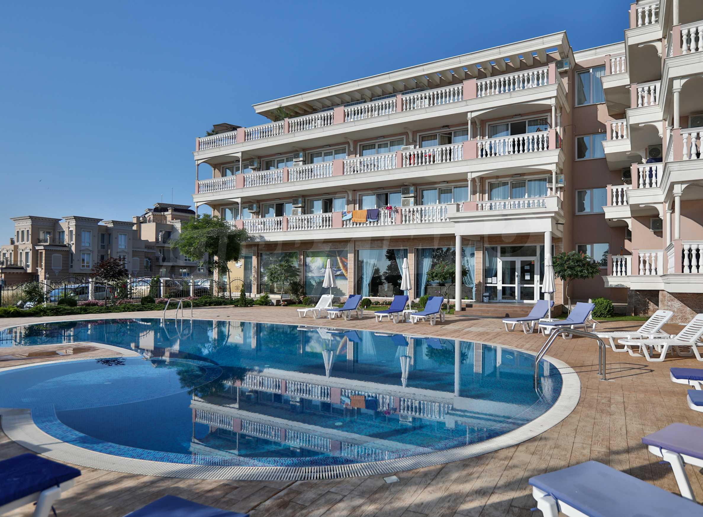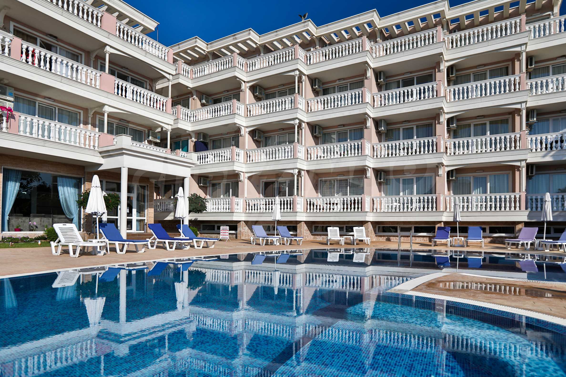 Сградата се откроява с изискана и елегантна архитектура, с просторни тераси с балюстри. Ориентирана е към морския бряг и предлага невероятни гледки към морето и плажа. Има всички необходими за приятната почивка удобства на територията: басейн, подземен паркинг и ресторант, охрана, видеонаблюдение и рецепция.