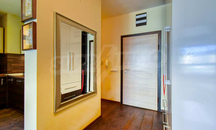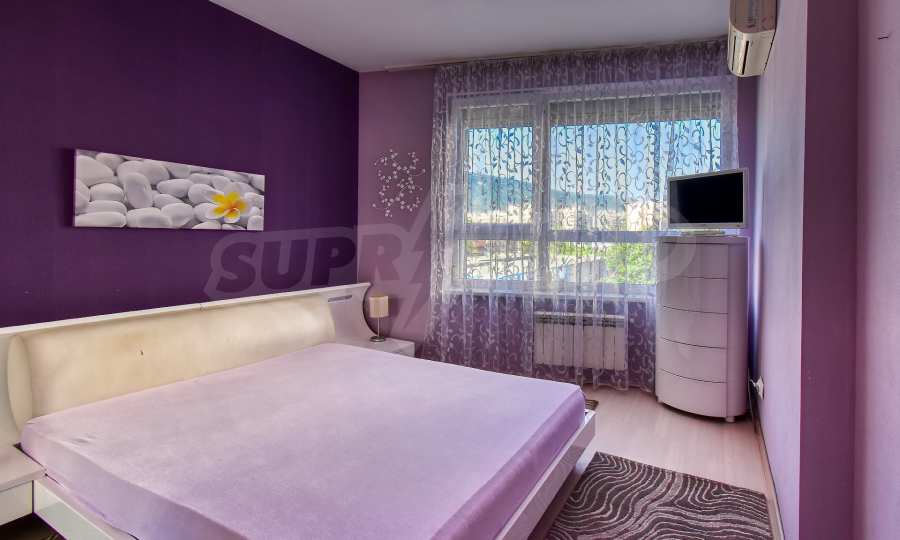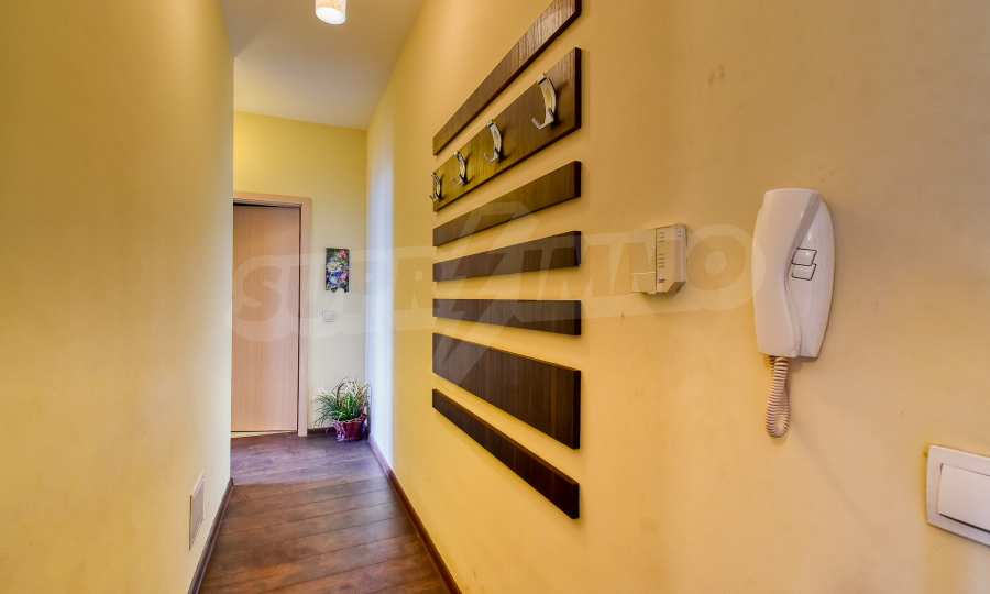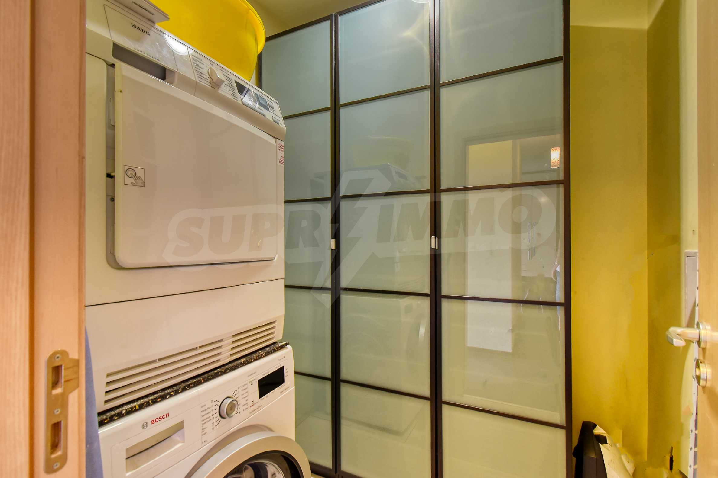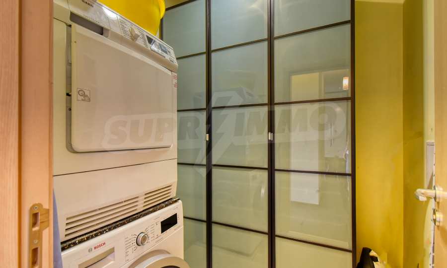 Апартаментът се състои от входно антре, просторна дневна зона с кухненски бокс, оборудван с висок клас електроуреди, трапезария с елегантна маса и столове, както и комфортен кът за отдих с мека мебел и телевизор. В отделно помещение е обособен дрешник с пералня и сушилня, осигуряващ практично решение за ежедневието. Спалните помещения са две — родителска спалня с уютна атмосфера и втора стая, която може да се използва като детска или работен кабинет, оборудвана с удобно бюро.
