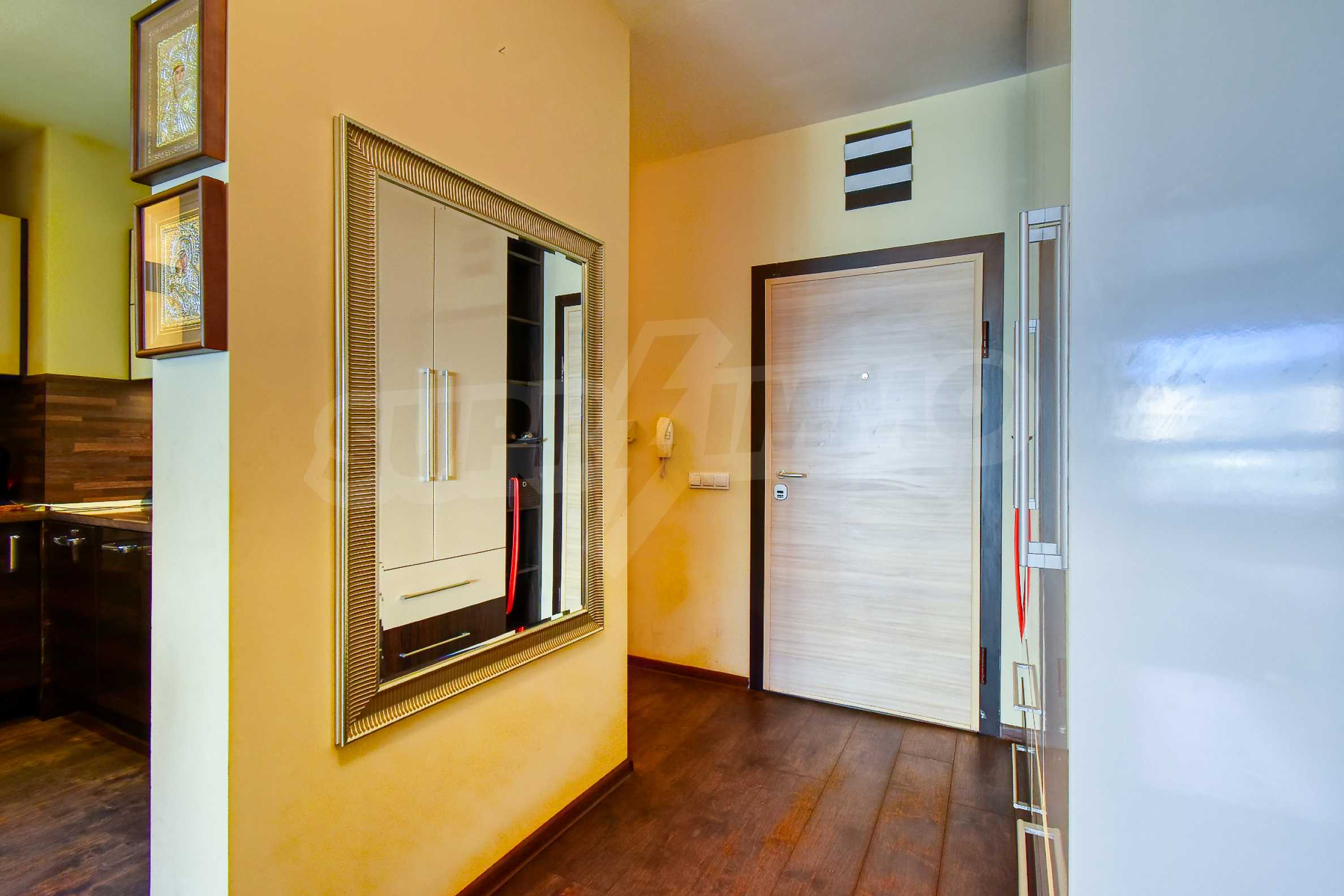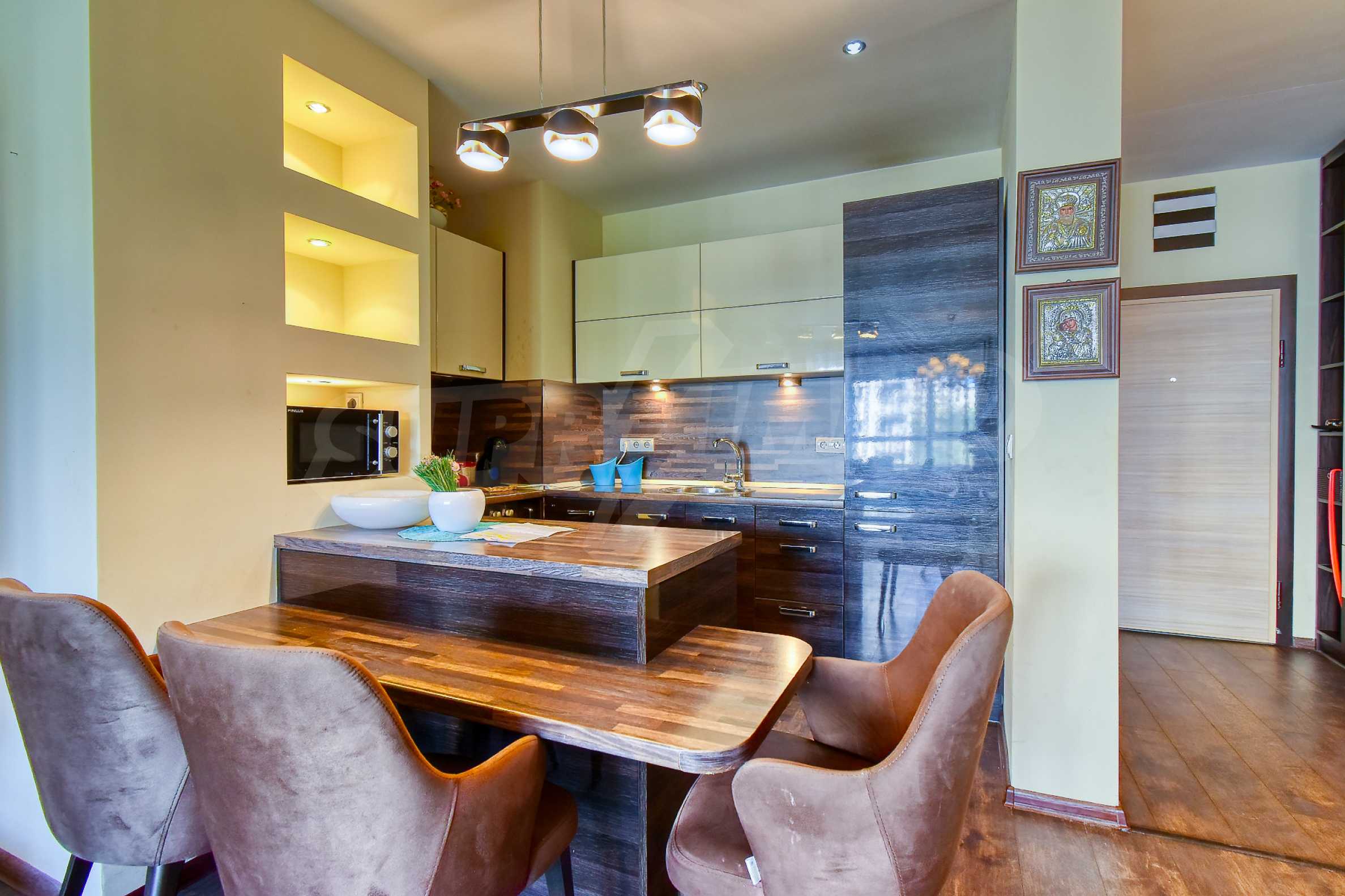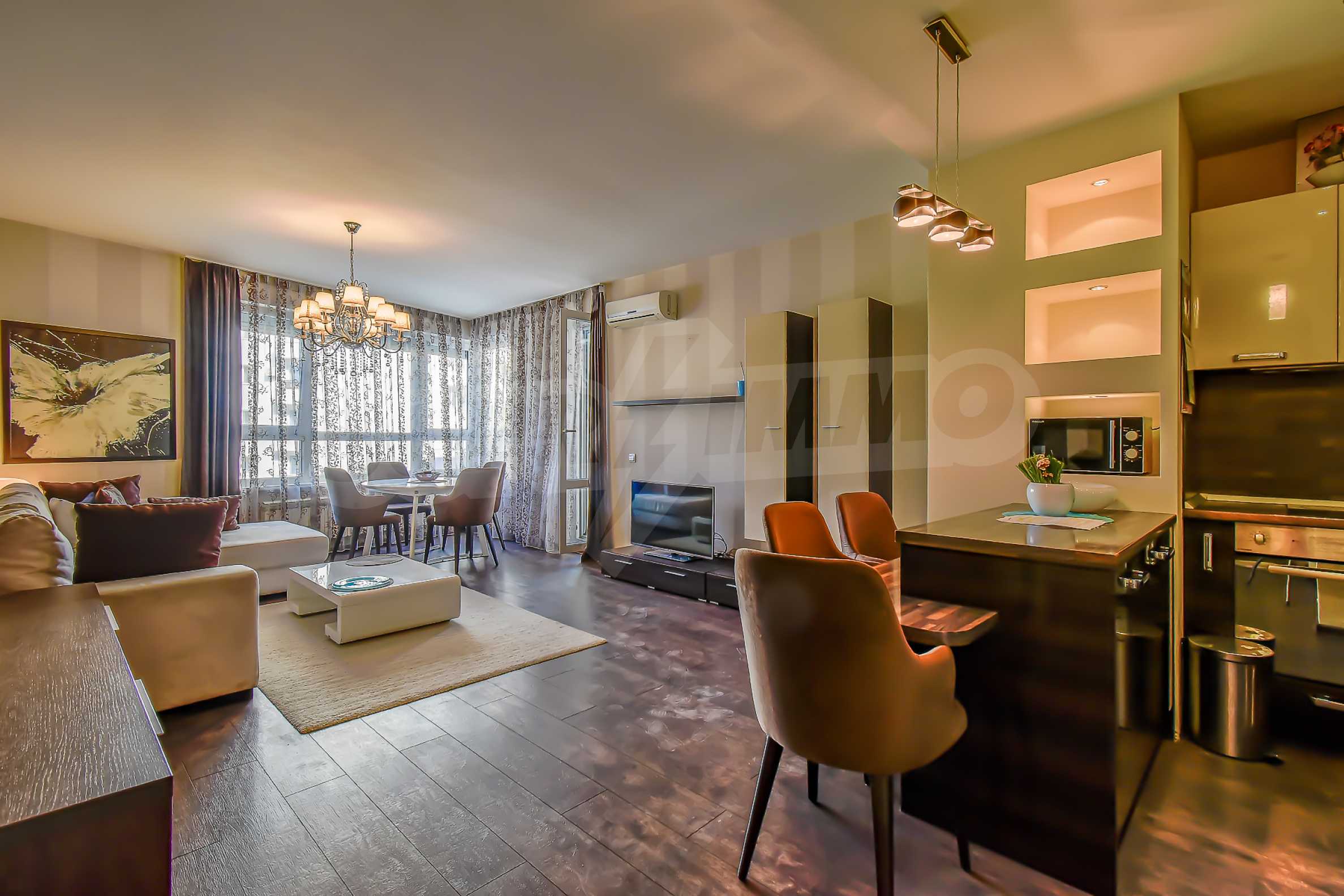 Апартаментът се състои от входно антре, просторна дневна зона с кухненски бокс, оборудван с висок клас електроуреди, трапезария с елегантна маса и столове, както и комфортен кът за отдих с мека мебел и телевизор. В отделно помещение е обособен дрешник с пералня и сушилня, осигуряващ практично решение за ежедневието. Спалните помещения са две — родителска спалня с уютна атмосфера и втора стая, която може да се използва като детска или работен кабинет, оборудвана с удобно бюро.