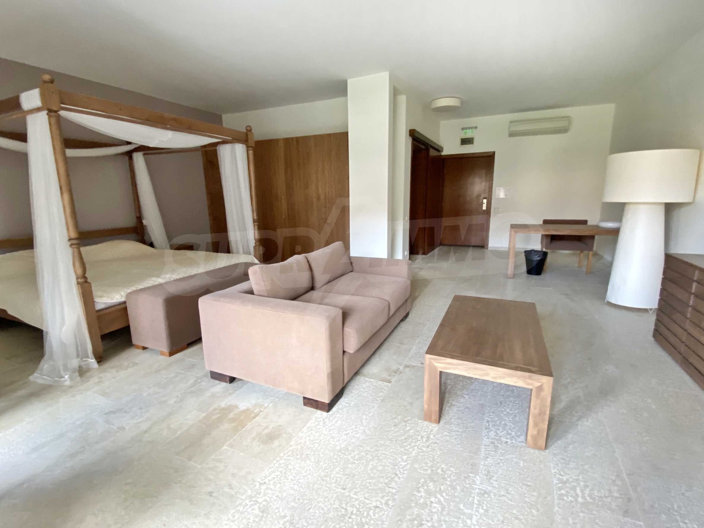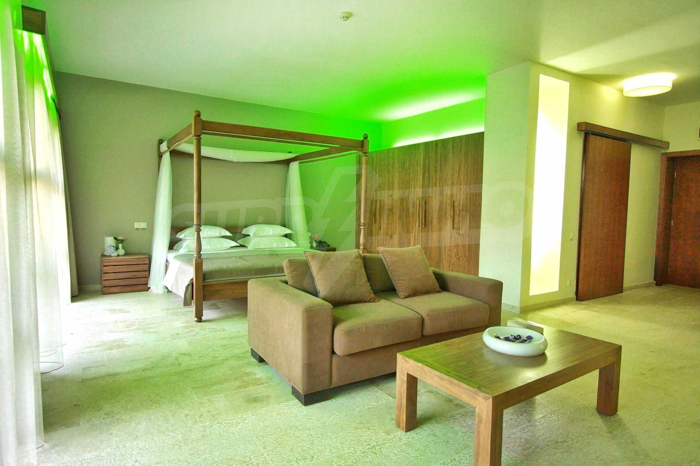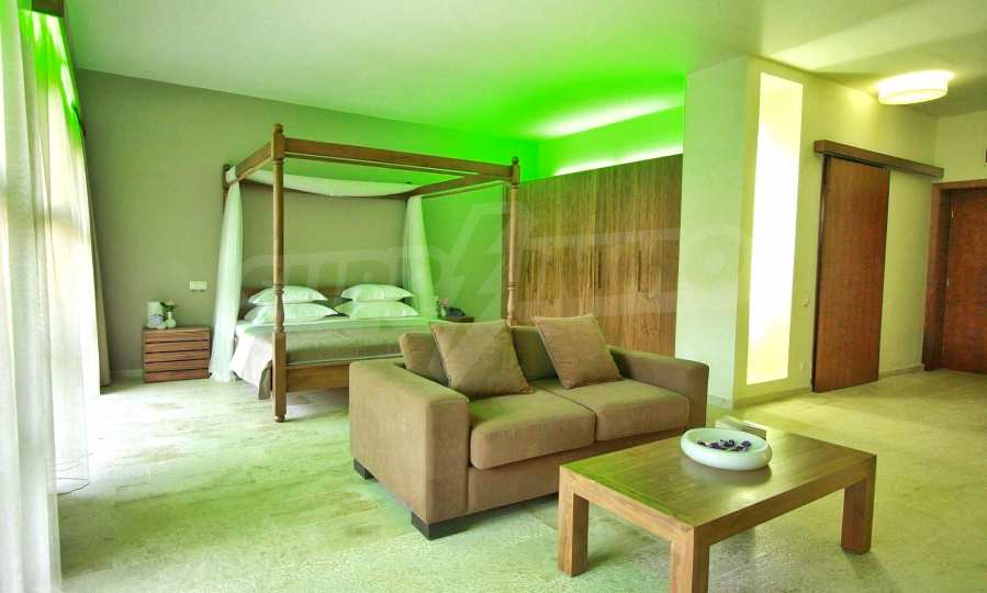 Концепцията на хотела е оригинална, голяма сграда само с 20 бутикови стаи за спокоен отдих: 9 просторни стаи на партерен етаж, от които две са за хора в затруднено и в неравностойно положение, 9 апартамента на първи етаж и 2 романтични стаи с емпоре на втори етаж, подходящи и за семейства с деца. Стаите са с размери от 43, 59 и 73 кв.м, всяка разполага с баня и балкон, ориентиран към басейна. Всяка от стаите е обзаведена с LCD телевизор, Интернет, телефон, сейф, мини бар, климатик, голяма баня с душ. Има 2 стълбища, домакински офис и конферентна зала. На първия етаж има отделен, напълно оборудван апартамент с две спални.